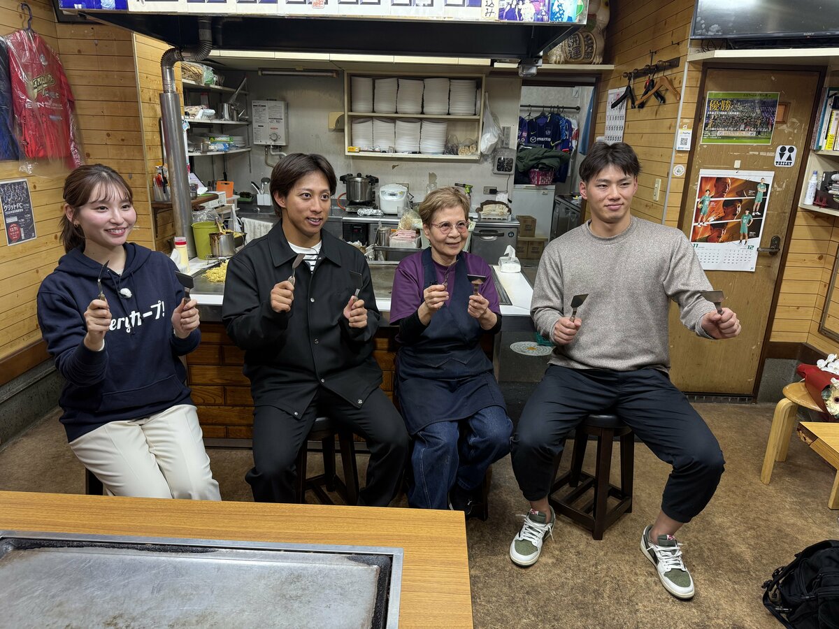 中村奨成選手と羽月隆太郎選手が最後に訪れるのは、福部真子選手も学生時代から通っているお好み焼き店。ここは、サンフレッチェ広島やドラゴンフライズの選手など、日本一経験者たちに長年愛される名店です。お店のカウンターに座った2人。広島生まれ・広島育ちの中村選手はさすがの「お好み焼き」通ぶりを披露します。トッピングやお好み焼き店の雰囲気へのこだわりが止まりません。一方、鉄板でお好み焼きを食べるのがはじめてという、羽月選手。鉄板の上のお好み焼きをヘラで食べる中村選手に「熱い?」など質問した後に意を決して鉄板からヘラで直接食べる『広島スタイル』に挑戦…無事にお好み焼きは食べられるか!?