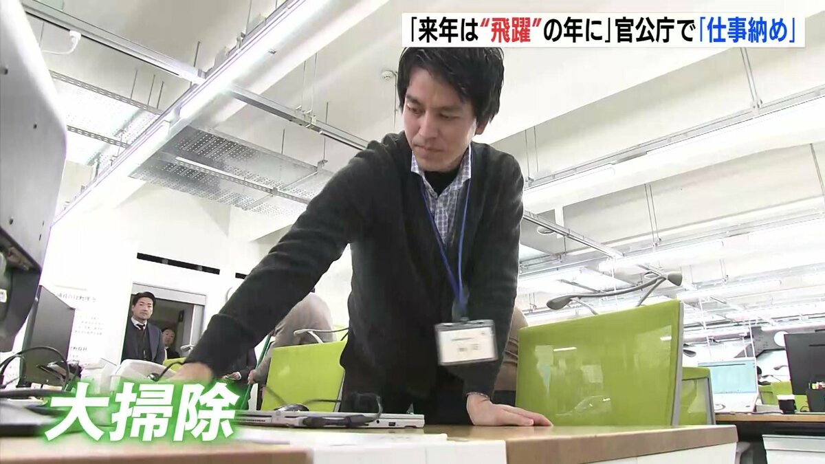 県庁本館3階では職員が床を掃いたり机の上を雑巾で拭いたりして1年の汚れを落としていました。
