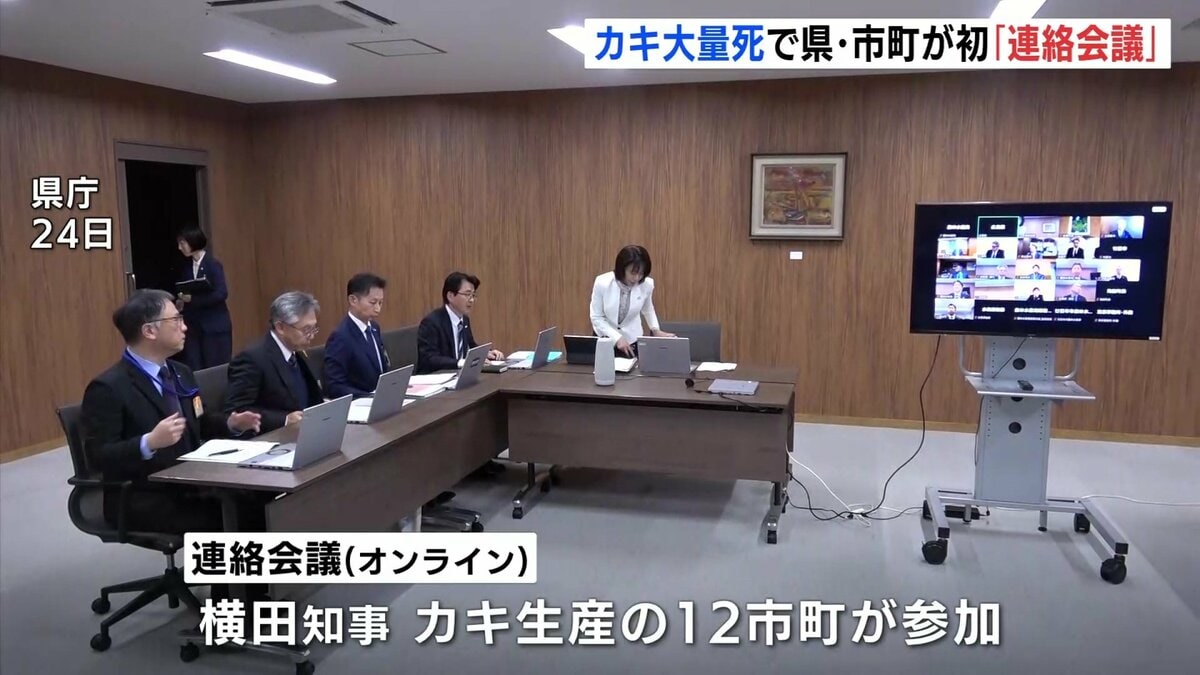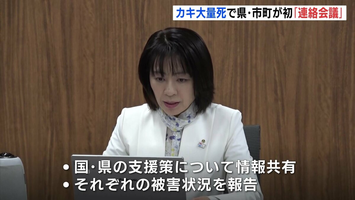 県の呼びかけで24日に初めて開かれたオンラインの連絡会議には、横田知事のほか、カキを生産する12の市町が参加しました。