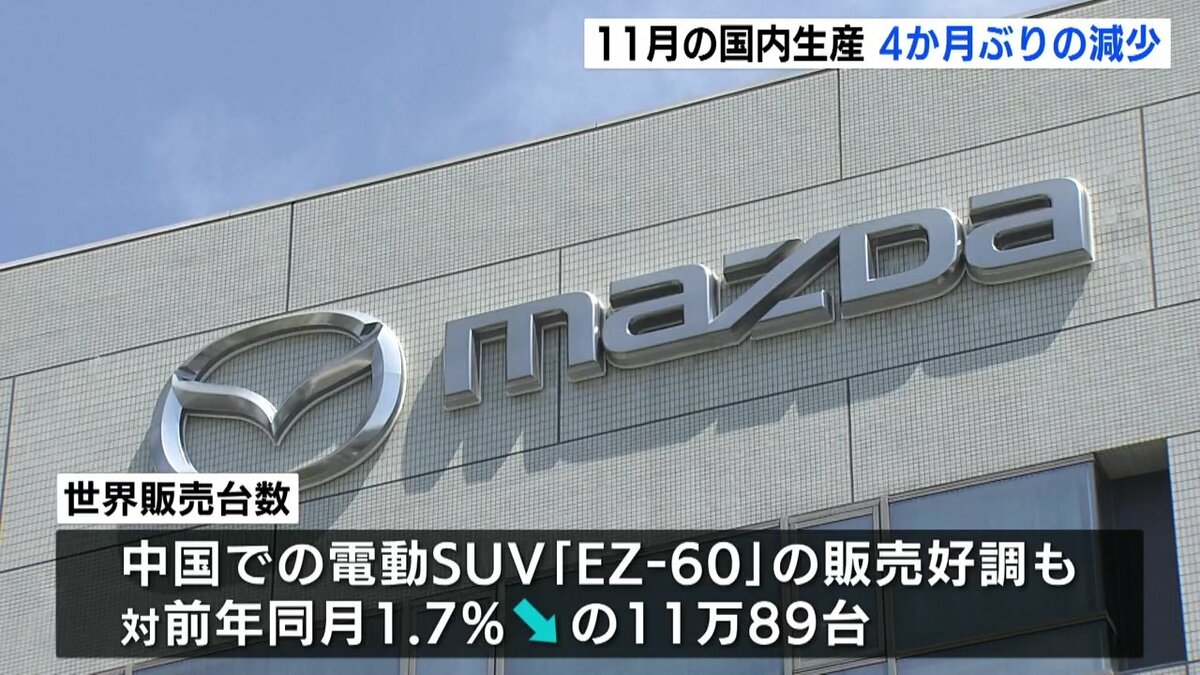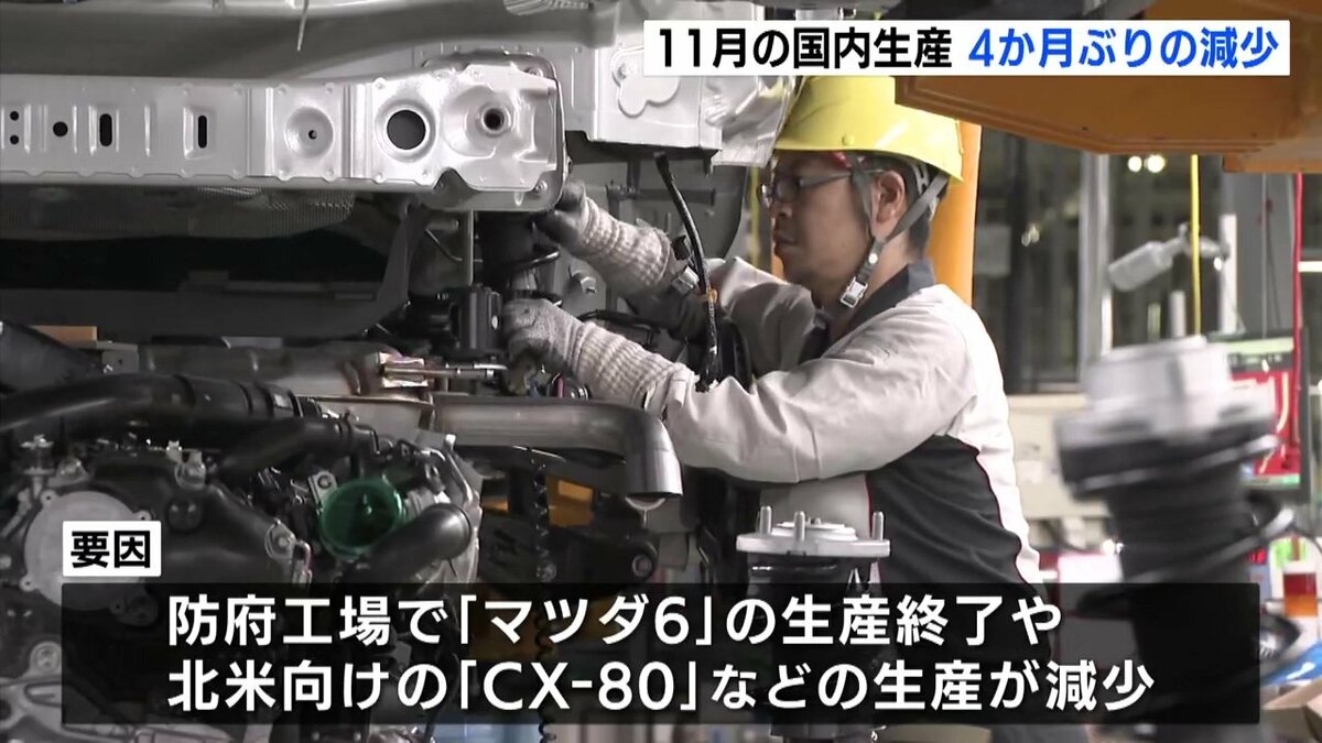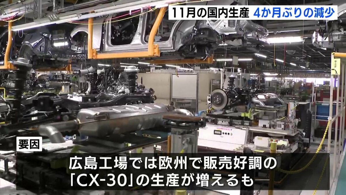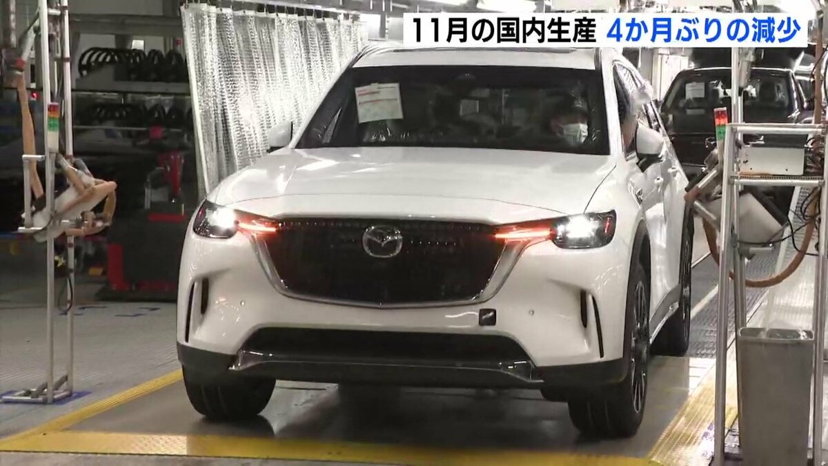 マツダによりますと、11月の国内生産は去年の同じ月に比べて2・3パーセント少ない5万8088台で、4か月ぶりの減少となりました。広島工場では、ヨーロッパで販売好調のCX-30の生産が大きく増えていますが、山口県の防府工場で生産終了のマツダ6や、北米向けのCX-80などの生産が減ったためとしています。