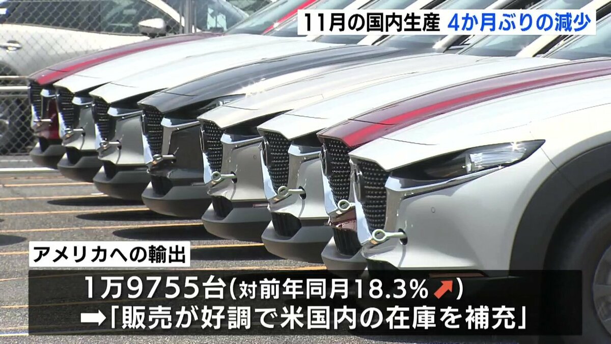 アメリカへの輸出は、去年の同じ月に比べ18・3%多い1万9755台となっています。要因について「CX-5やCX-70の販売が好調で、アメリカ国内の在庫を補充するため」としています。
