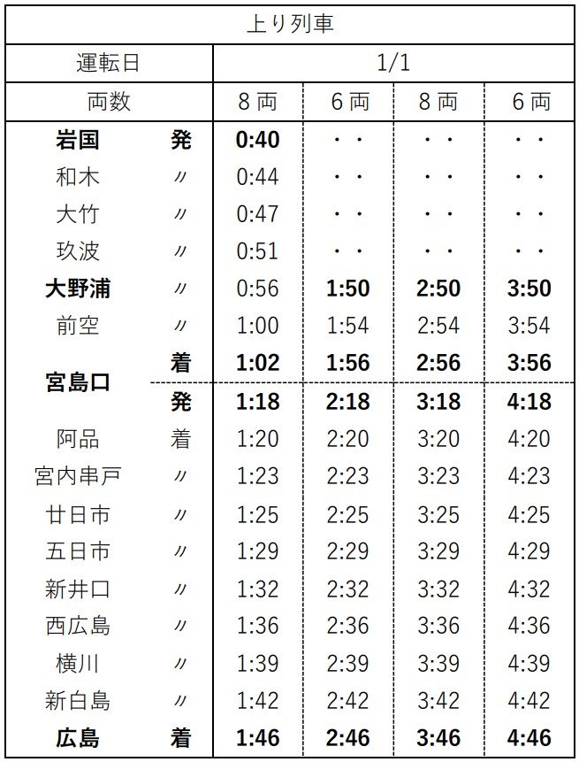 上りも、岩国駅や大野浦駅が始発で、宮島口駅を午前1時18分に出る広島駅行きの臨時列車から、1時間おきに4本を運行します。
