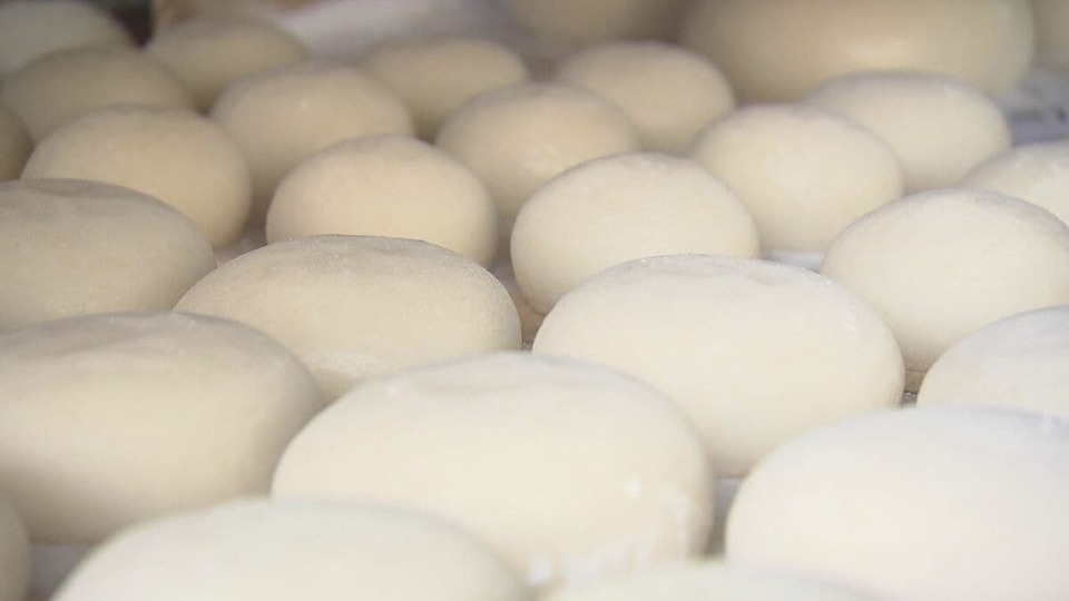 広島市西区にある明治40年創業の老舗「林の餅」です。もち米を蒸す蒸気が立ち込める店内には、自慢の石臼で正月用の餅をつく軽やかな音が響きます。雑煮用の白小餅や、あん餅、鏡餅など総勢20人でフル生産です。