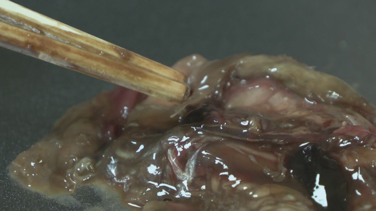 内臓に張り付いた、大量のアニサキスを1匹1匹割り箸を使って、取り出していきます。