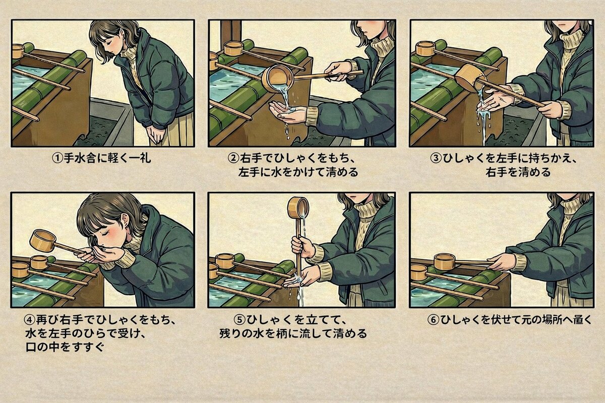 (2)右手でひしゃくをもち、左手に水をかけて清める