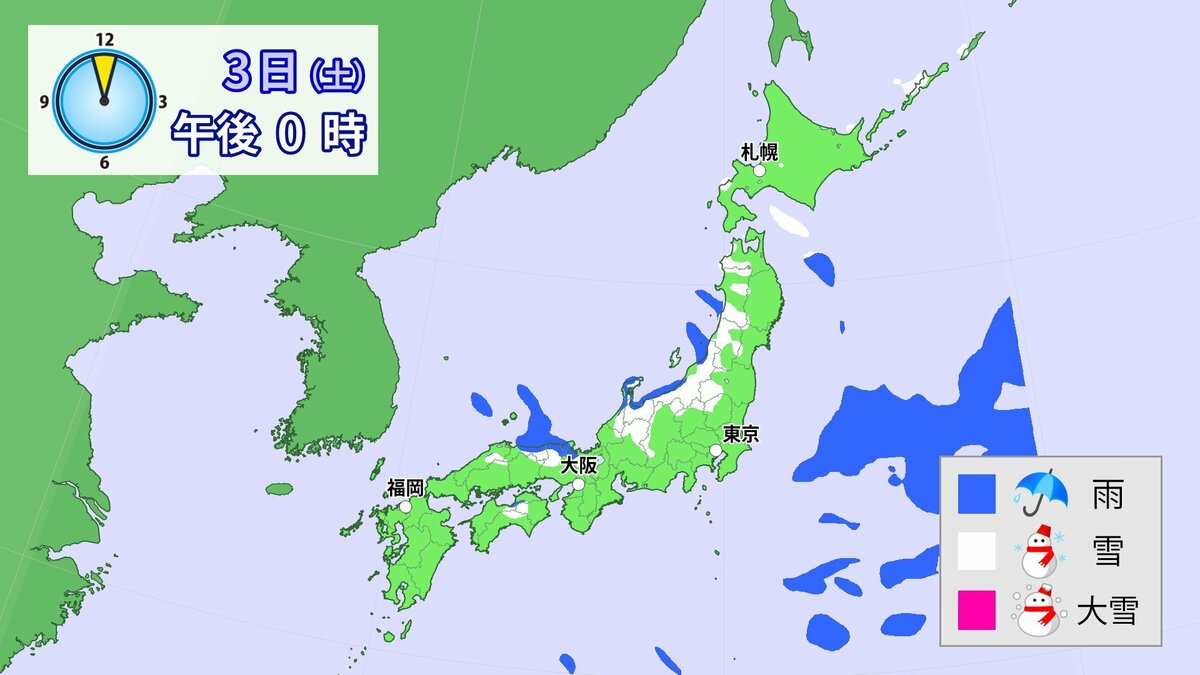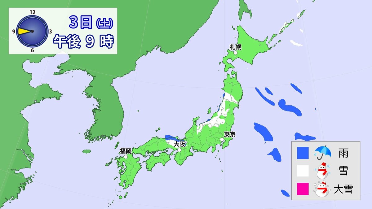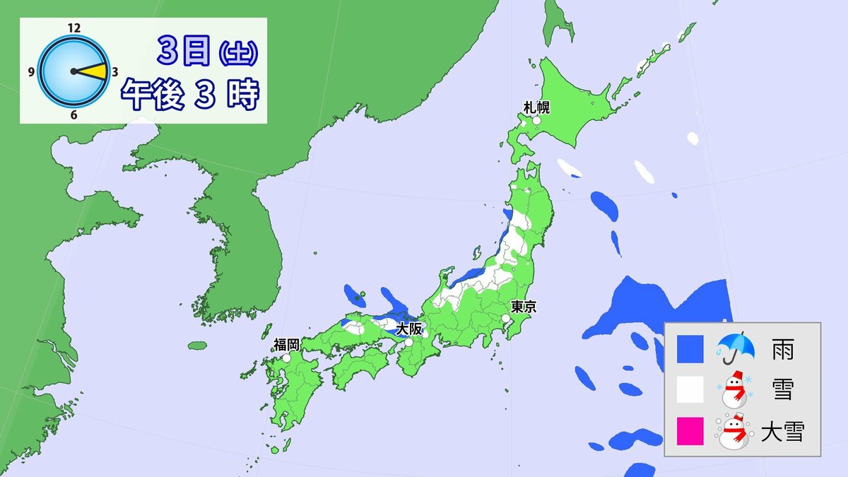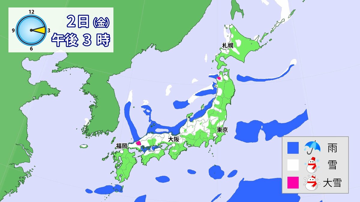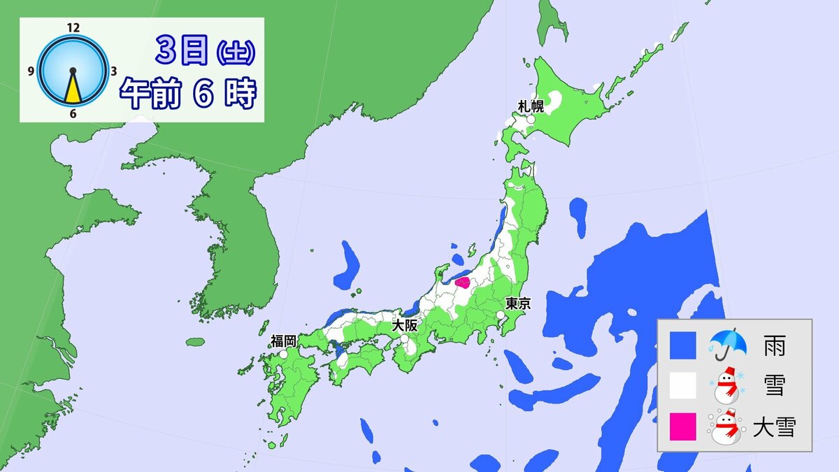 九州北部地方では3日にかけて、大雪による交通障害に警戒してください。東日本と西日本では3日にかけて、大雪に注意・警戒してください。また、北日本から西日本では、落雷や竜巻などの激しい突風にも注意してください。