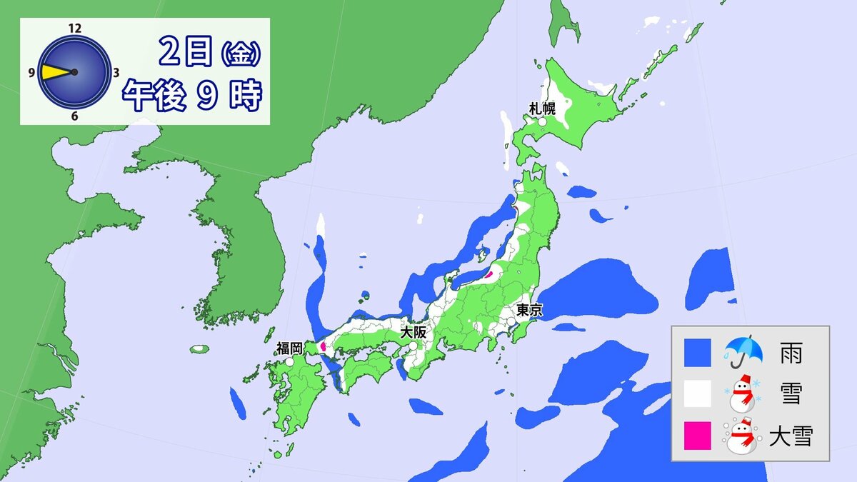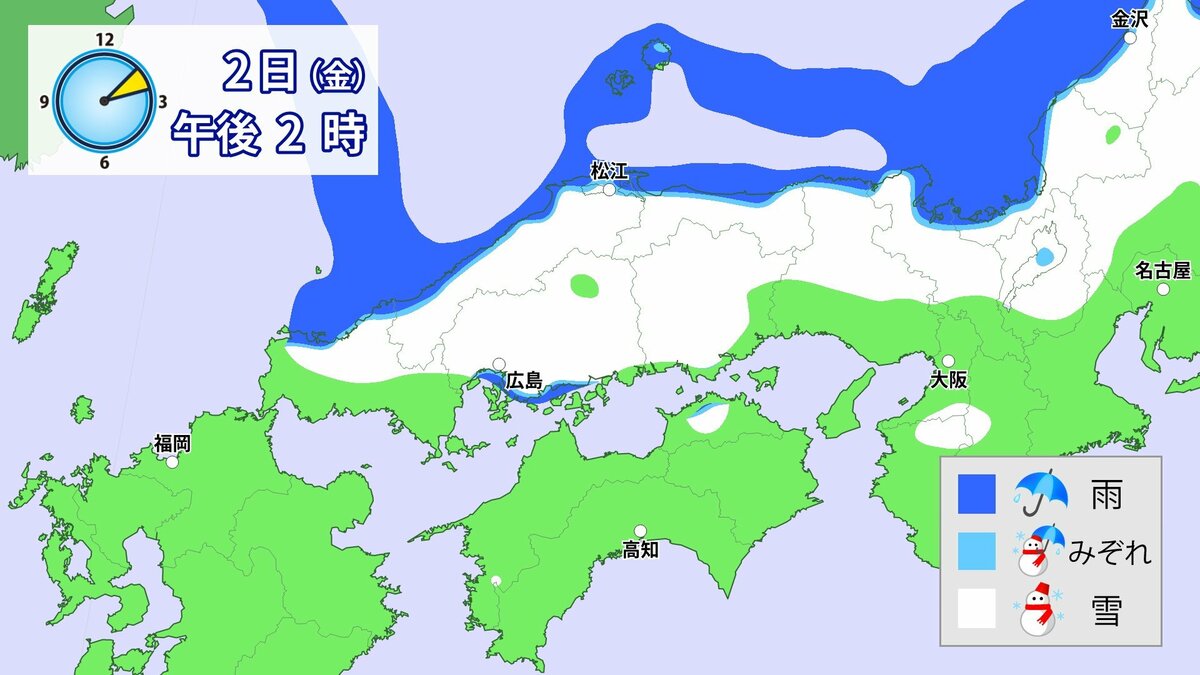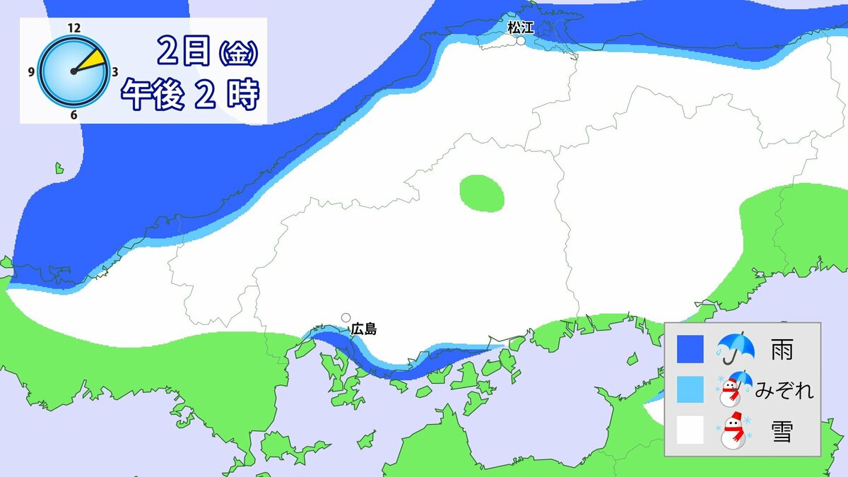広島県では、2日昼過ぎから夜のはじめ頃に降雪が強まり、積雪が急速に増える見込みです。広島市の中心部でも積雪となるおそれがあり、北部だけでなく、普段雪の少ない南部の平地でも大雪となる所があるでしょう。雪雲が現在の予想以上に発達し、同じ所で降り続いた場合には警報級の大雪となる可能性があります。