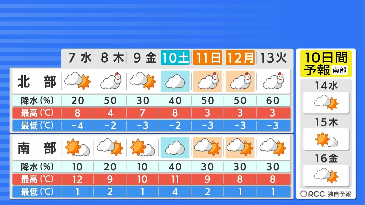南部では晴れ間の広がる日が多いですが、北部では寒気の影響で雲が広がりやすく、あさっては雪が降る見込みです。また、日曜日から来週火曜日にかけて強い寒気が流れ込み、北部を中心に雪が降る見込みで、南部でも雪が降る可能性があります。