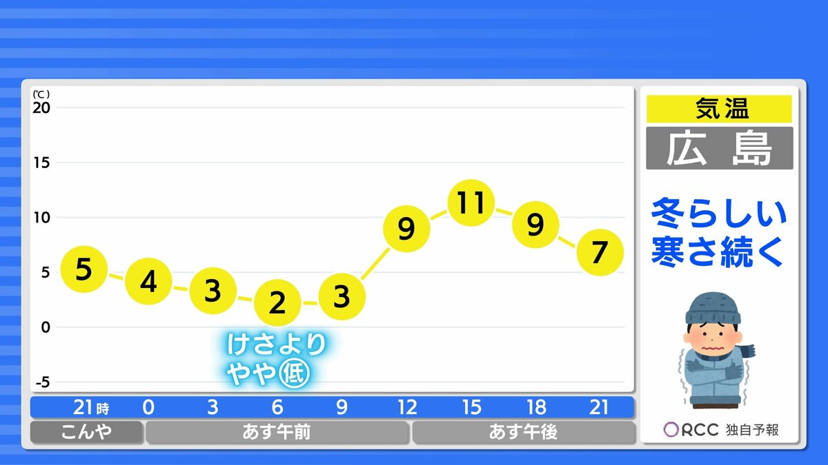 きょう1月6日(火)の広島県内は、日中は日差しがたっぷり届きました。最高気温は、広島市中区や蒲刈で11.2℃など、この時期らしい寒さになりました。