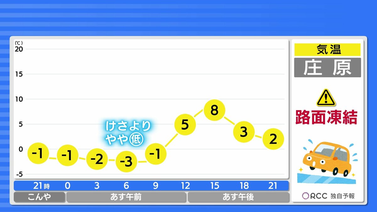北部や内陸部ではきょうより4℃~5℃ほど低くなる見込みです。雪が残っている所では、路面凍結による交通事故にご注意ください。車の運転は慎重にお願いします。