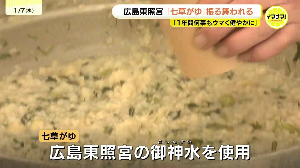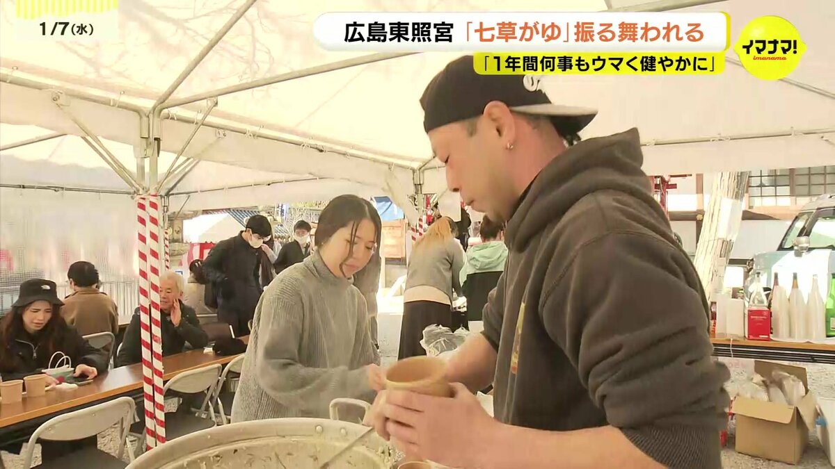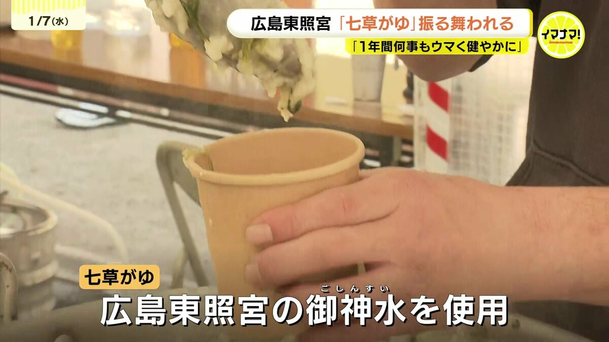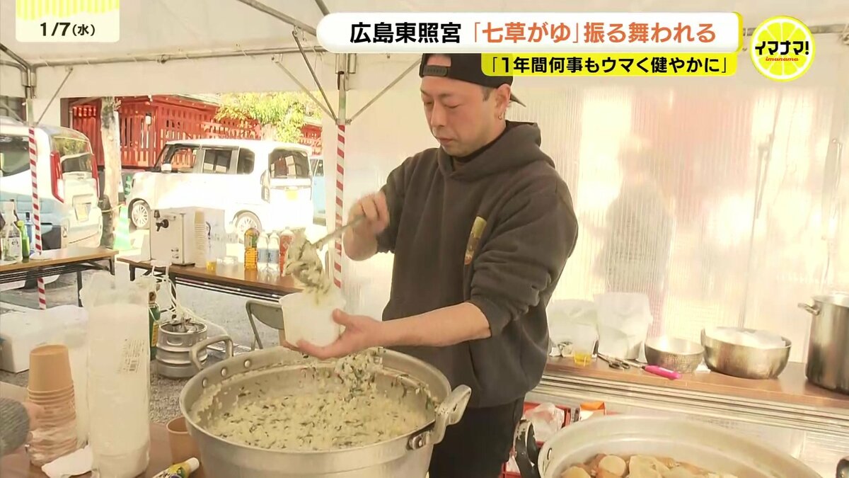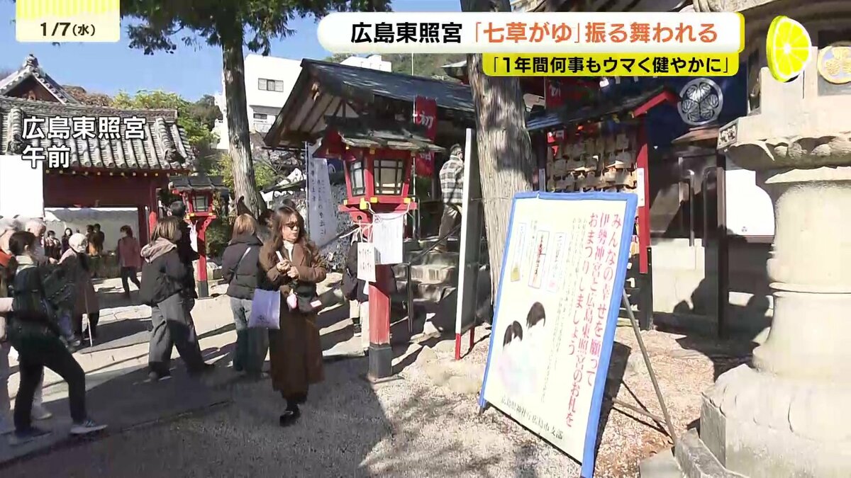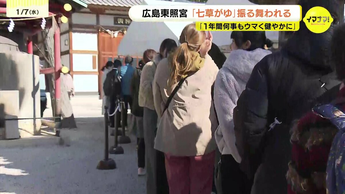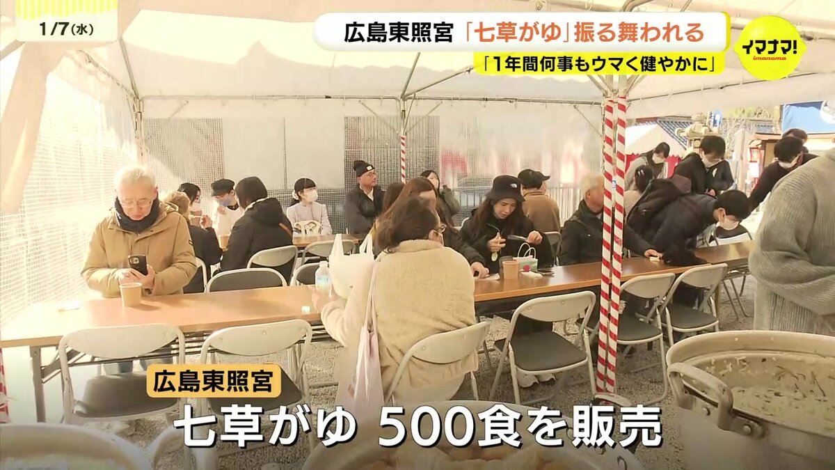広島市東区の広島東照宮では、500食の七草がゆが販売されました。セリやナズナなど春の七草を入れたかゆを食べると、邪気が払われ、1年間、病気にならないと言われています。