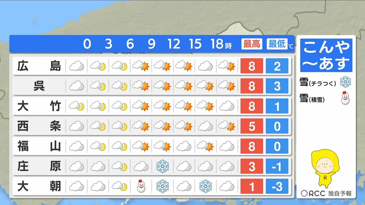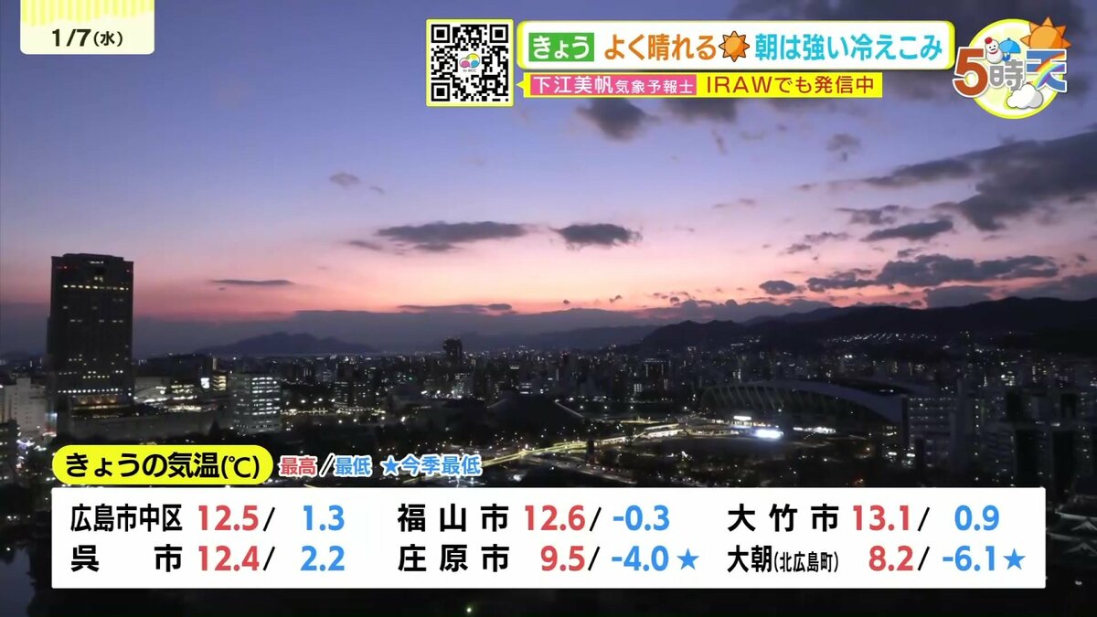 けさは冷え込みが強まり、大朝や庄原では今季一番の冷え込みになりました。広島市中区でも1.3℃まで冷え込んでいます。