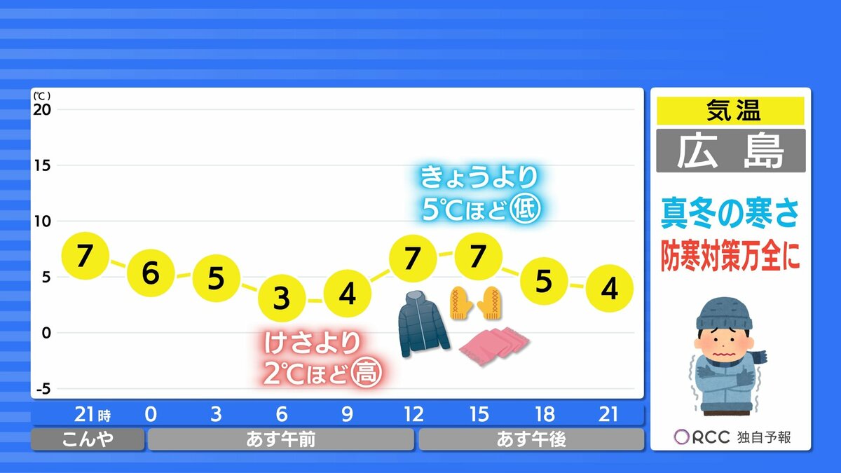 あす日中の気温は、きょうと比べると5℃前後低くなるでしょう。一気に真冬並の寒さになるため、防寒対策は万全にしてお過ごしください。