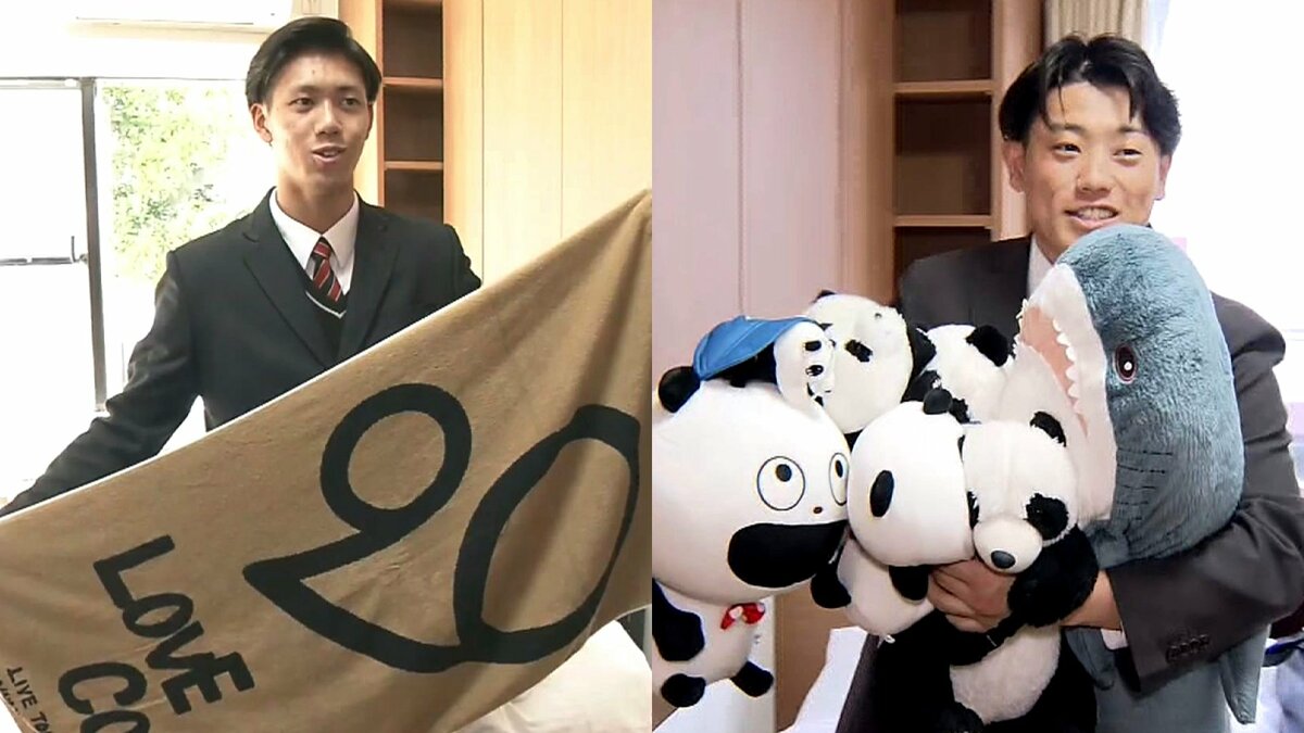 真っ赤なネクタイで気合を入れて入寮したのは、ドラフト3位の勝田成選手(近畿大)。しかし、バッグから出てきたのは大量のパンダなどのぬいぐるみ!