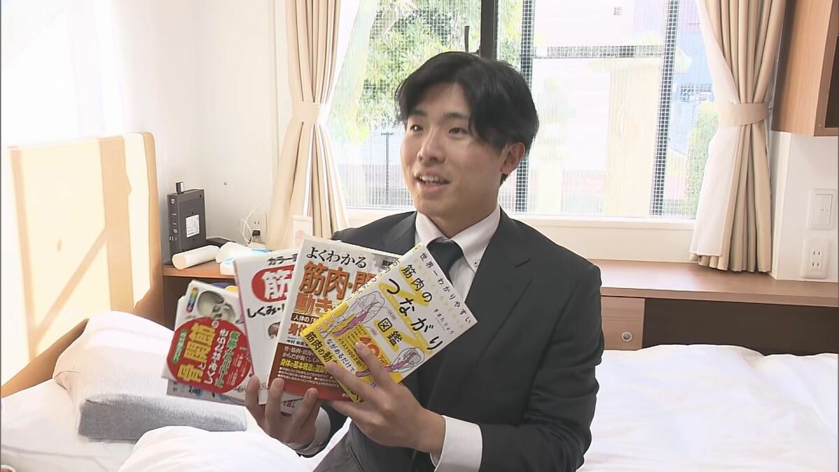 右ひじ手術を経て入寮したドラフト7位の高木快大投手(中京大)は、筋肉や骨のしくみやはたらきを学ぶ専門書を持参。