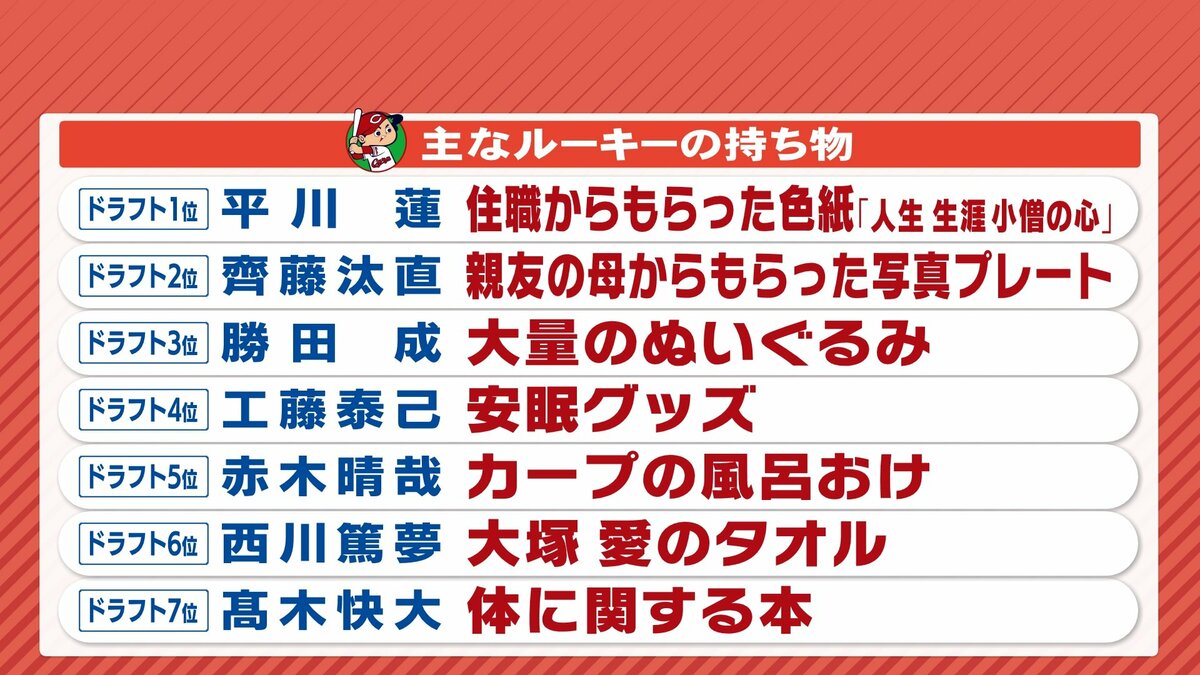 カープの新入団選手たちが、広島県廿日市市の大野寮に入寮しました。いよいよプロ野球選手としての厳しい生活がスタートします。緊張の面持ちの彼らが、心の支えとして持ち込んだ「こだわりの品」を紹介します。