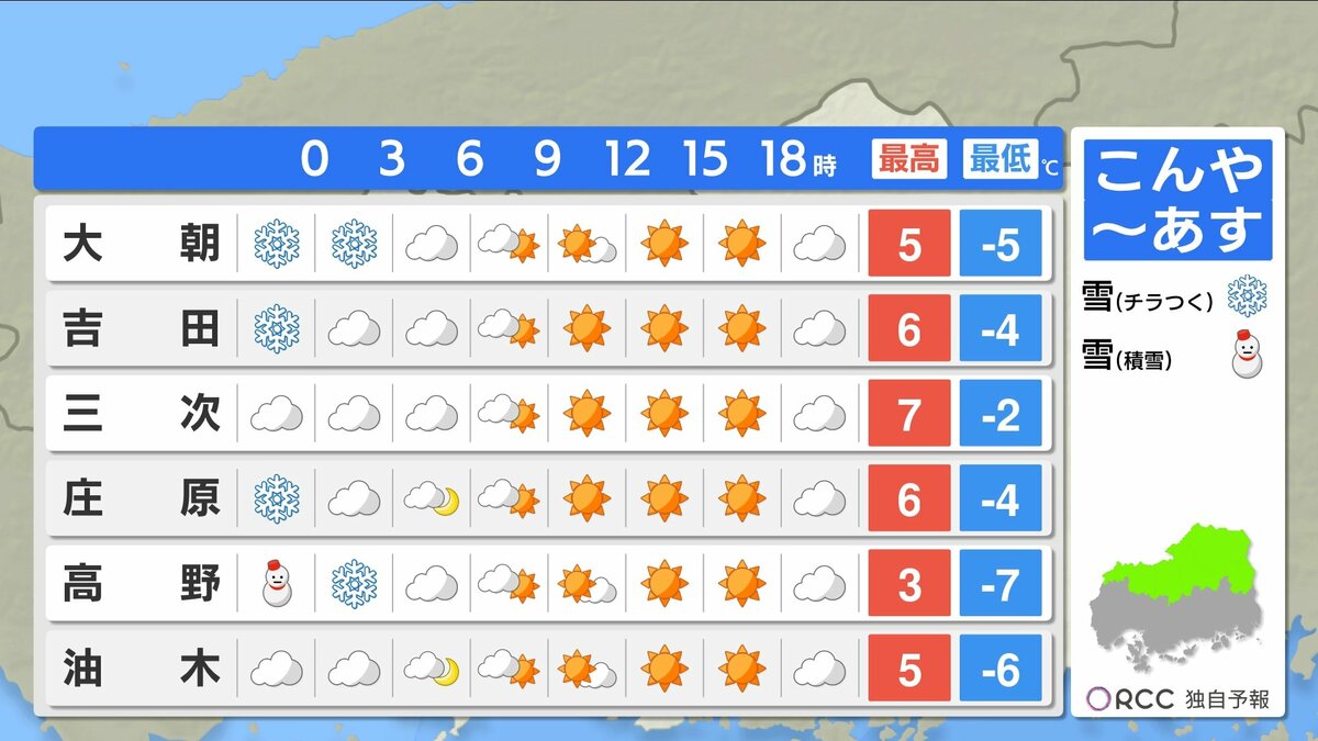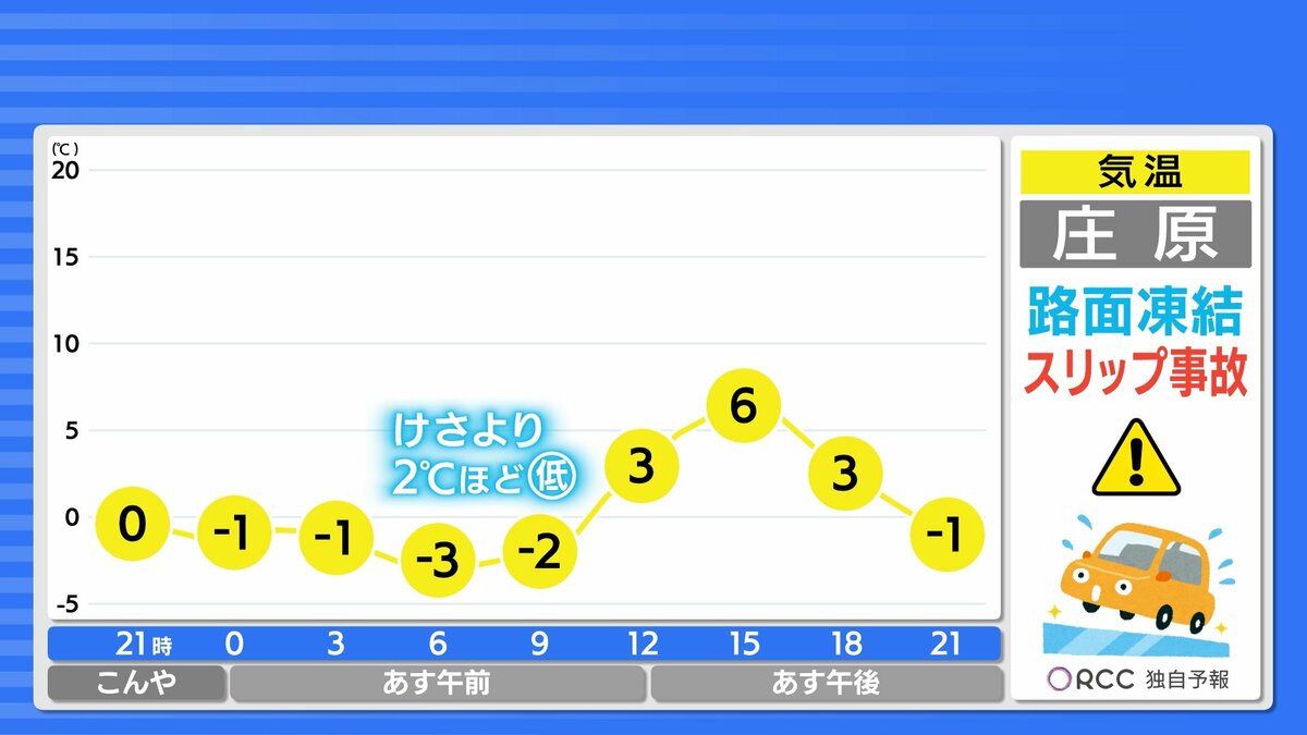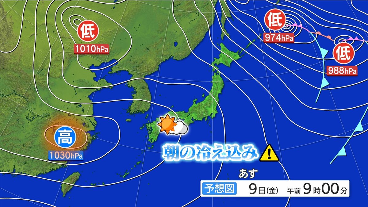 冬型の気圧配置が緩んだ直後の朝は冷え込みが強まります。あす朝は沿岸部でも0℃~1℃くらいの地点が多いでしょう。北部では-5℃前後まで冷え込む見込みです。積雪している所では、路面の凍結にご注意ください。