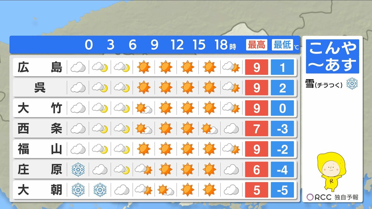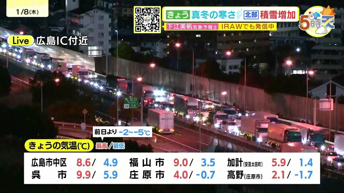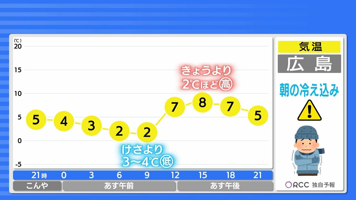 最高気温は、広島市中区で8.6℃までしか上がらず、真冬並の寒さになりました。各地きのうと比べると2℃~5℃ほど低くなりました。