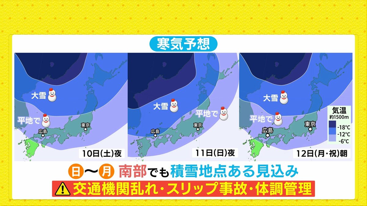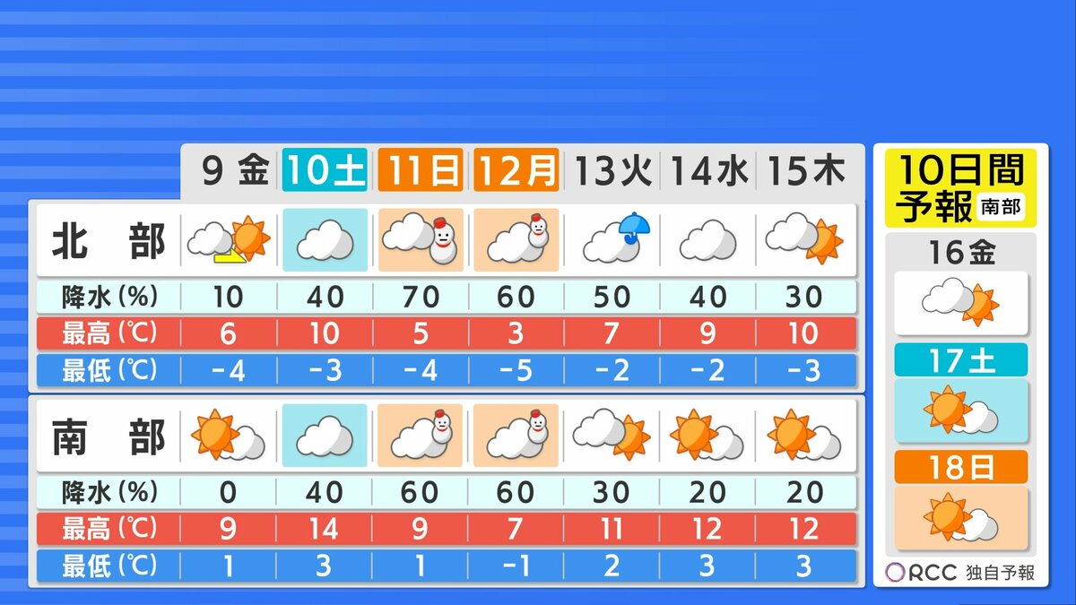 土曜日は低気圧や前線が通過し、雨が降りやすくなるでしょう。その後強い寒気が流れ込み、月曜日頃にかけて寒気の影響が続く見込みです。日曜日から月曜日にかけて北部を中心に大雪となる見込みで、南部でも雪が降り、積雪する所があるでしょう。