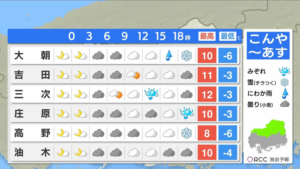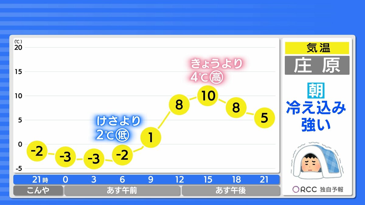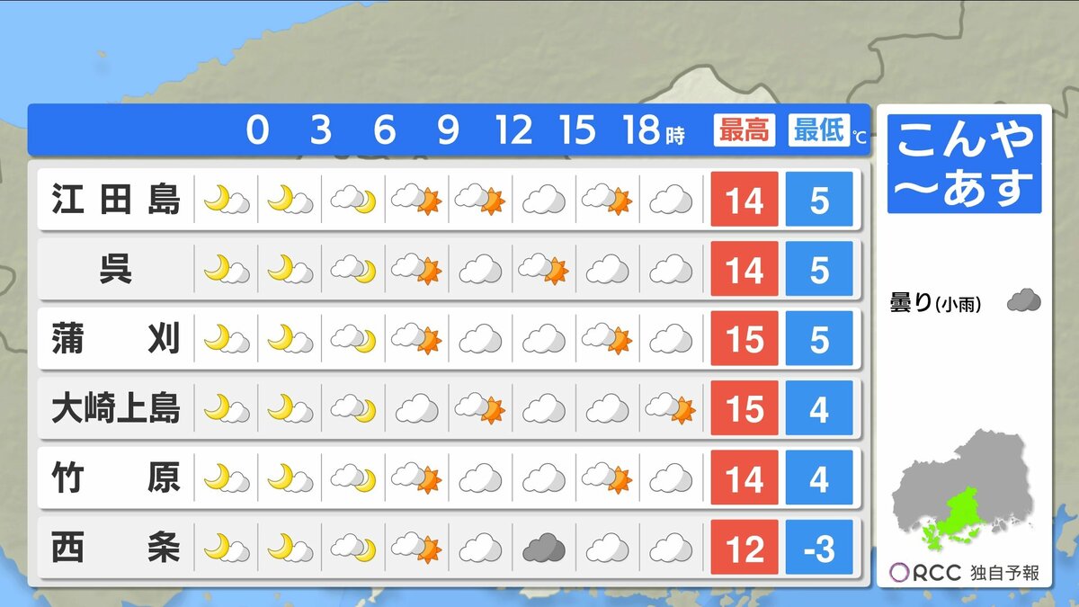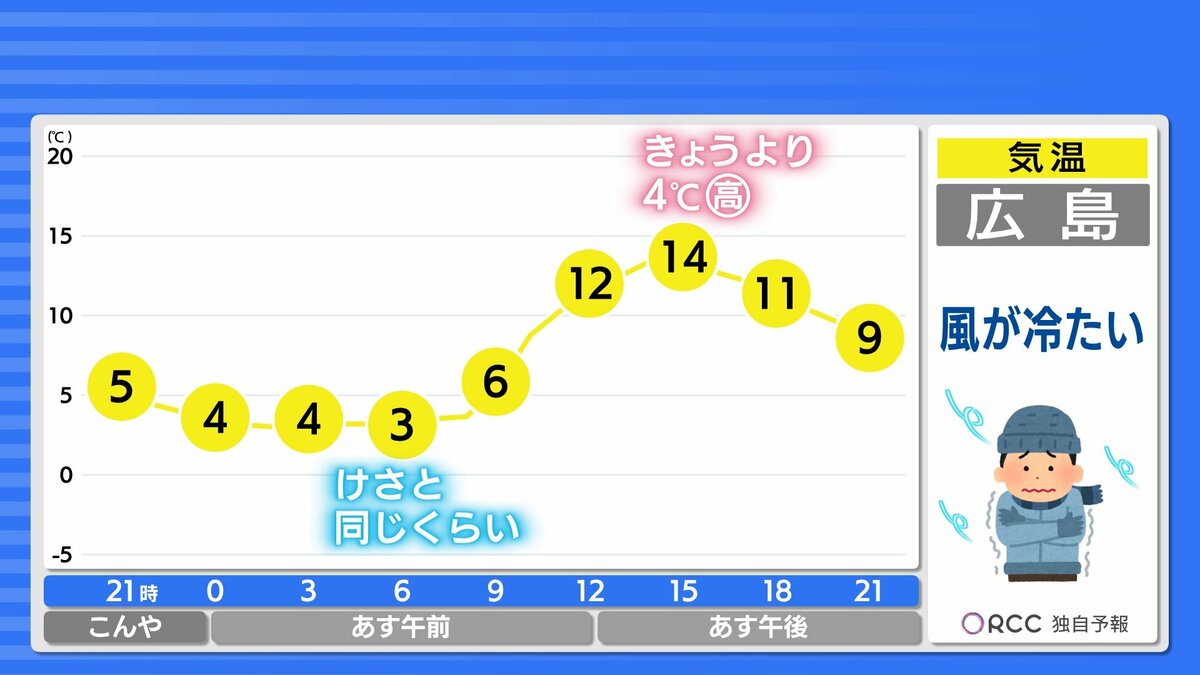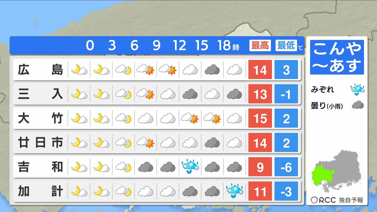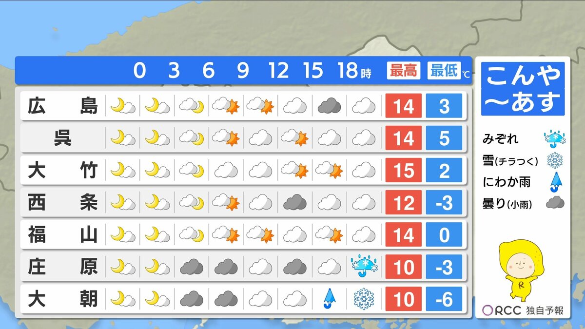 きょう9日(金)の広島県内は、上空の寒気がゆるみ、雲も少ない冬晴れとなりました。最高気温は、大竹市11.5℃、広島市中区10.4℃、庄原市8.1℃、平年並かやや高くなっています。