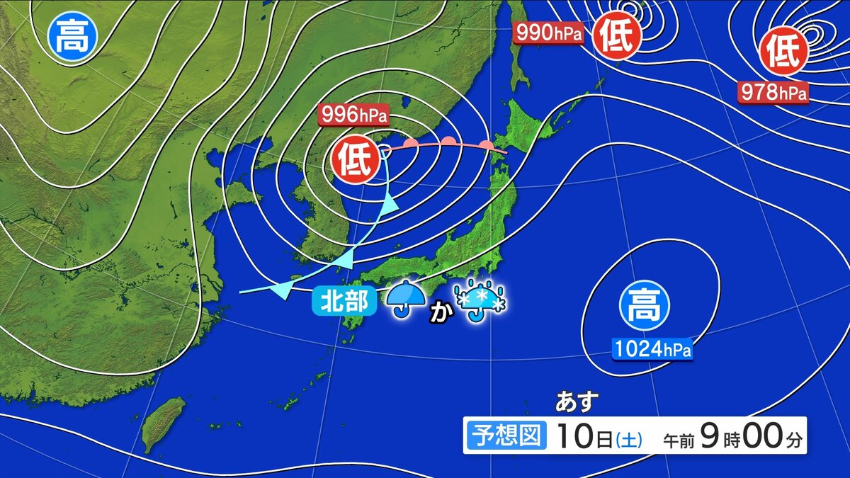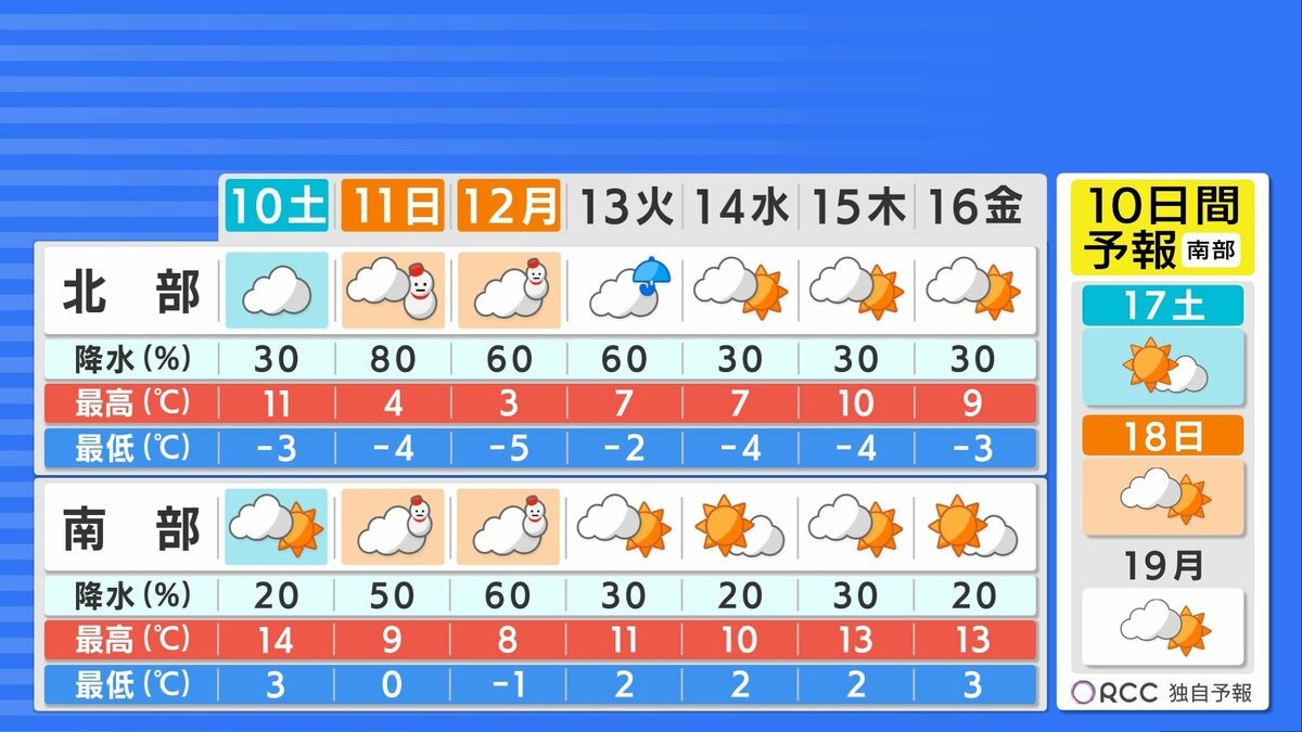10日(土)は、上空の寒気がゆるむ見込みです。日本海から前線が近付き、北部中心にぐずつきますが、降っても雨かみぞれ中心になる予想です。南部は日差しが届く見込みで、最高気温は14℃くらいでしょう。風が強いので、数字以上に体感は寒いかもしれません。