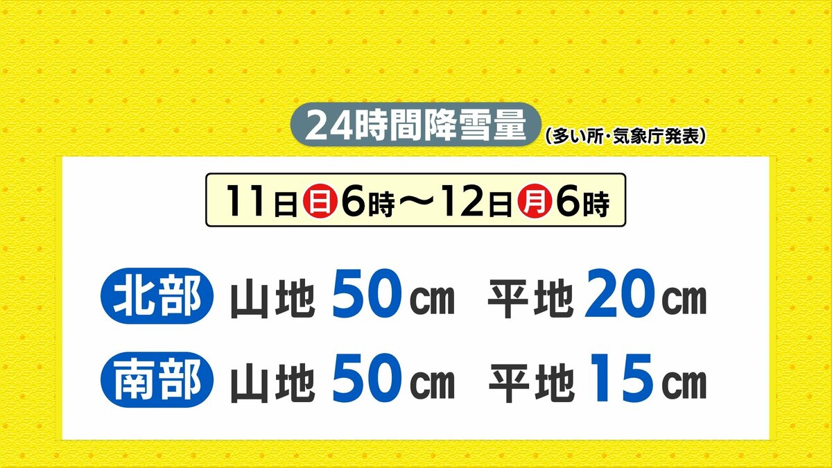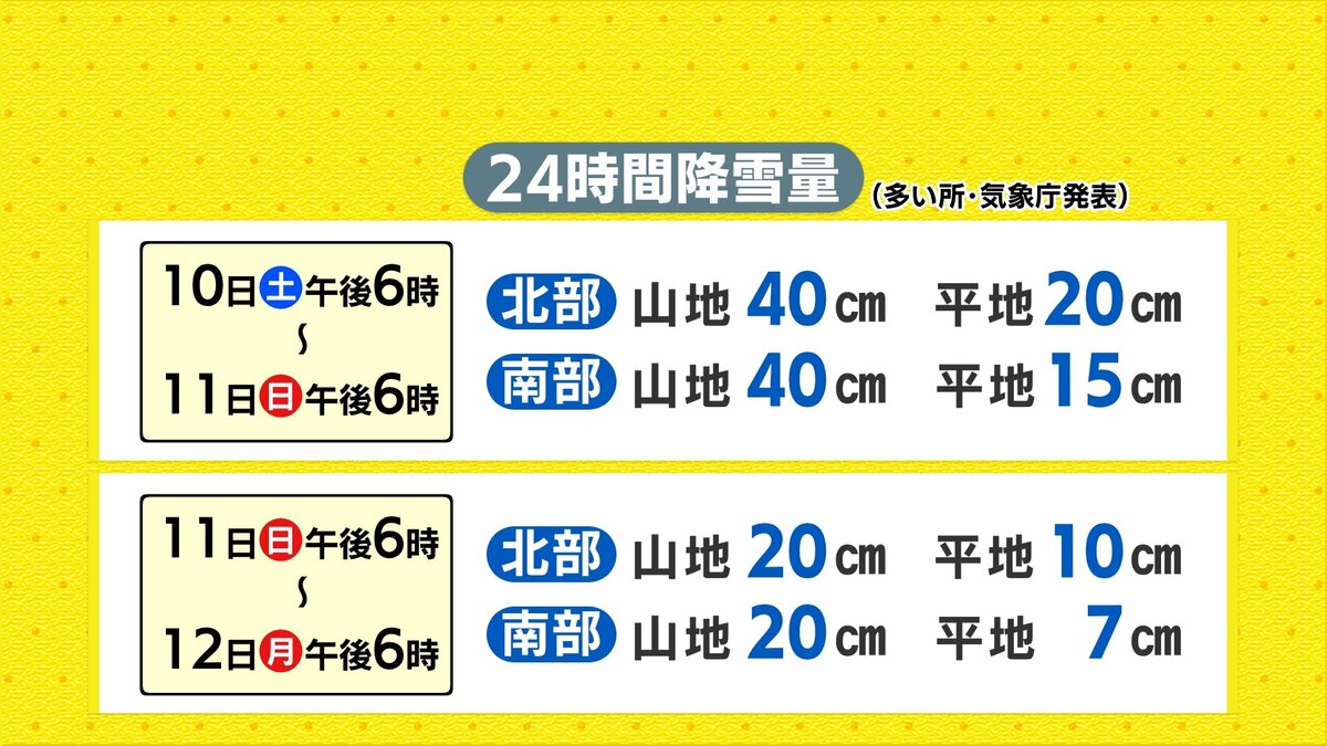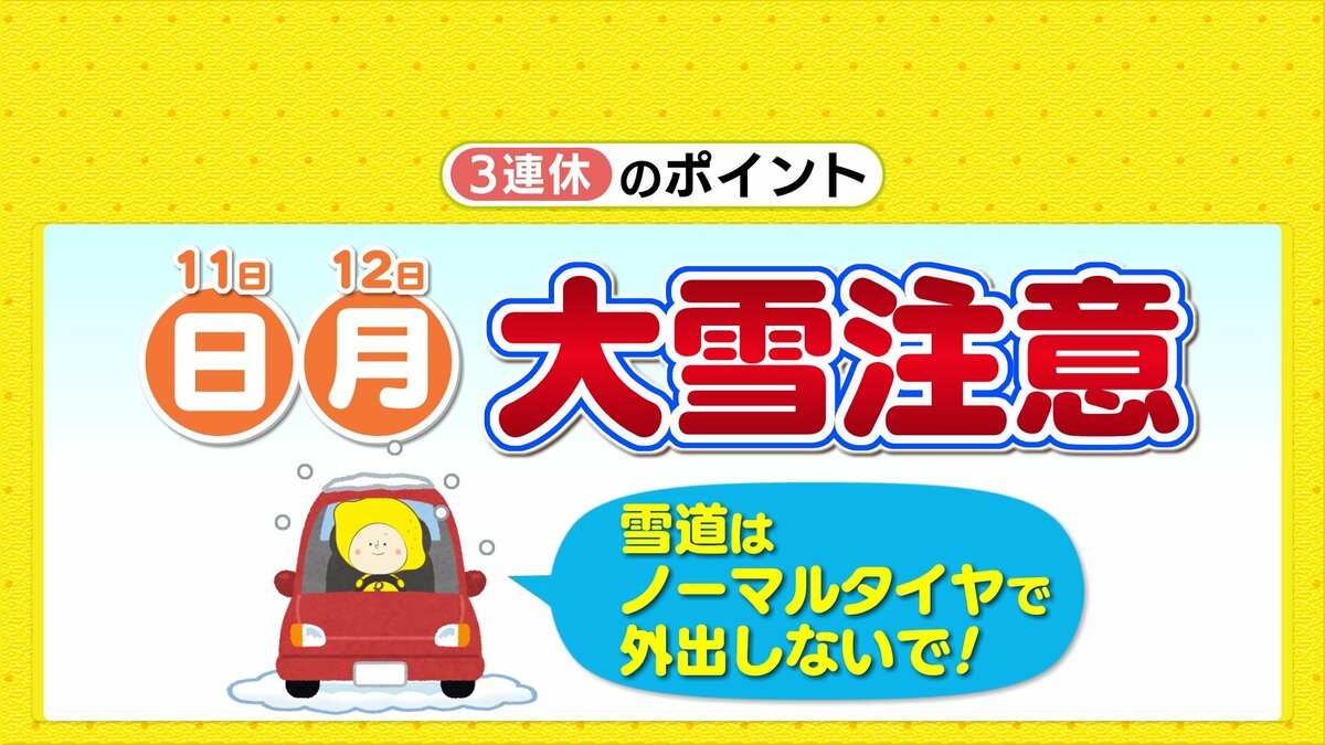 11日(日)から12日(月)は大雪になる見込みです。雪道のノーマルタイヤでの走行は控えてください。火曜以降は寒気がゆるむため、降れば雨中心になる予想です。来週の後半は、だんだんと日差しが復活し、暖かさも感じられそうです。