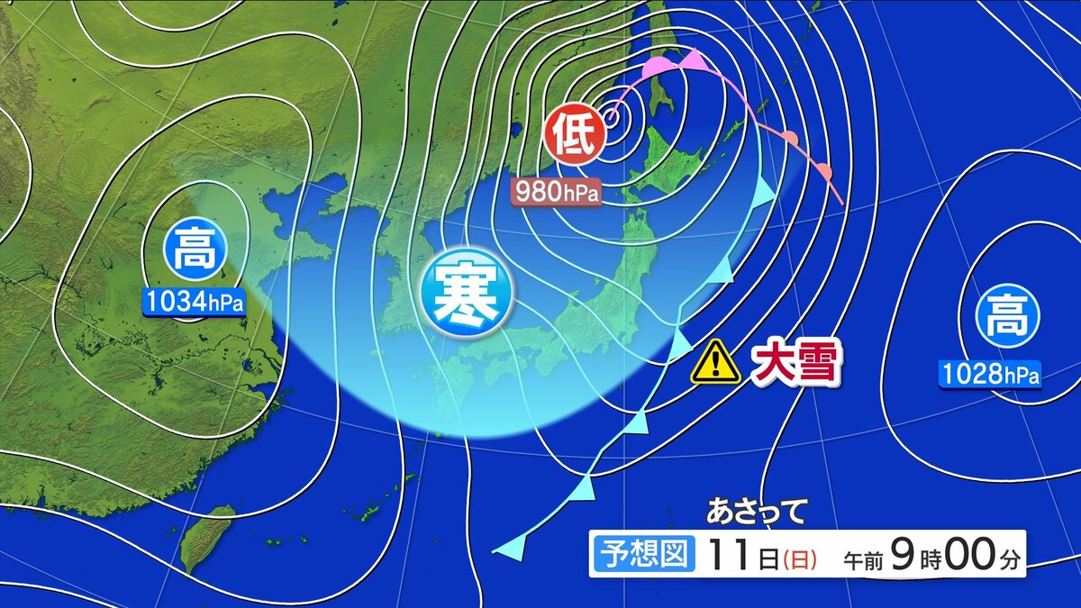 あさって11日(日)は、等圧線の間隔が狭くなり、冬型の気圧配置が強まる見込みです。上空には、強い寒気が入り、大雪となる予想です。普段雪の少ない地域でも積もる可能性があります。