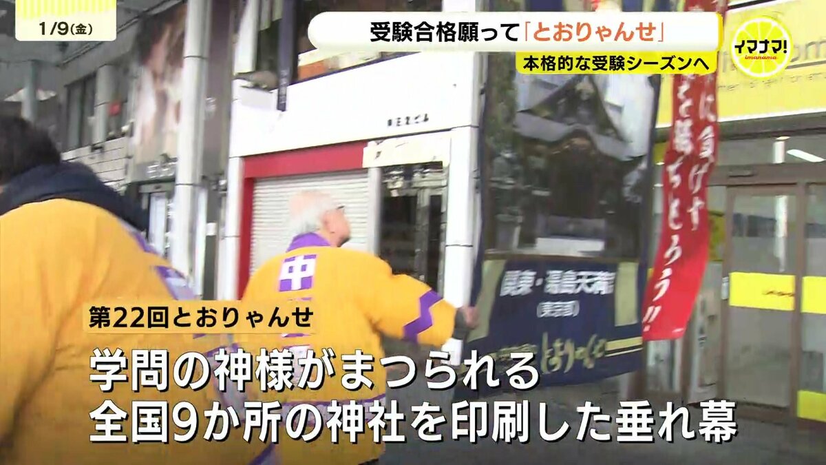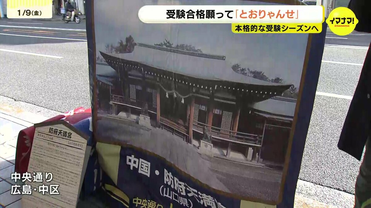 広島市中区の中央通りで始まったのは、受験生の合格を祈願する「とおりゃんせ」です。山口県の防府天満宮など、学問の神様がまつられている全国9か所の神社が印刷された垂れ幕が掲げられました。