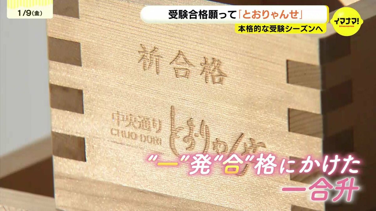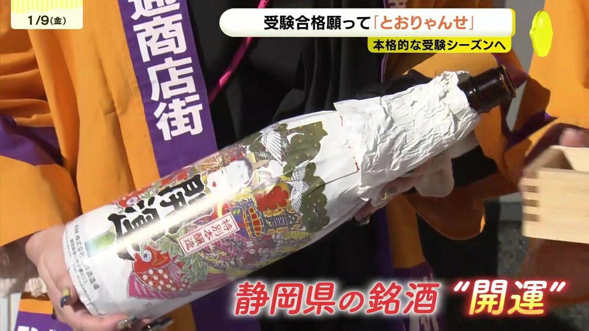 地元の商店街が「中央通りを通って試験にも通ってほしい」と願い、毎年企画しています。商店街のメンバーは静岡県の銘酒「開運」を一発合格にかけた「一合枡」にそそぎ、祈願を行いました。