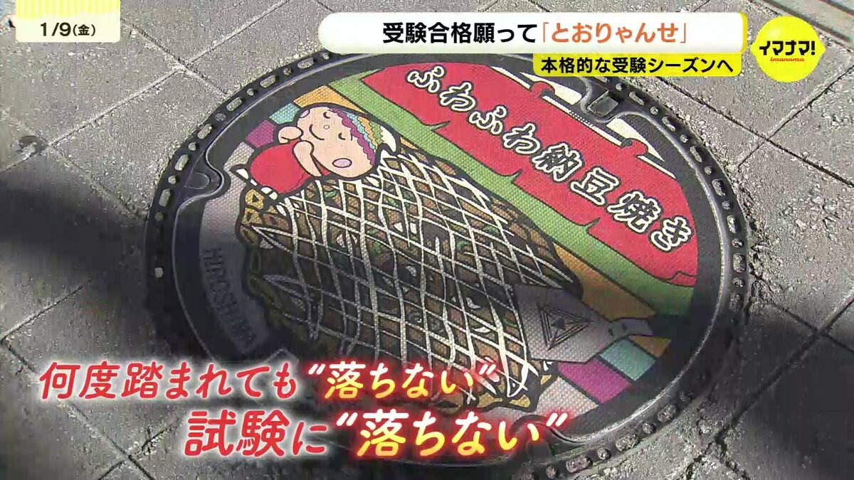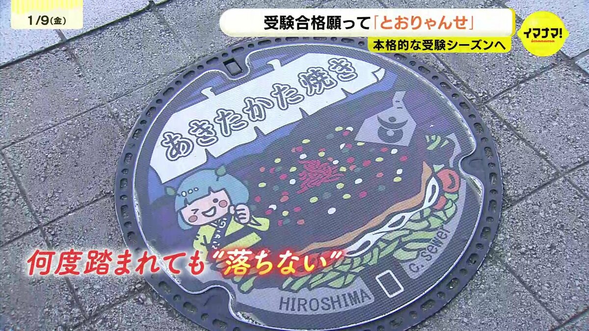 商店街に設置されている「県内各地のお好み焼き」の絵柄マンホールは、何度踏まれても落ちないことから試験に”落ちない”という願いが込められています。