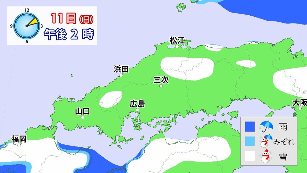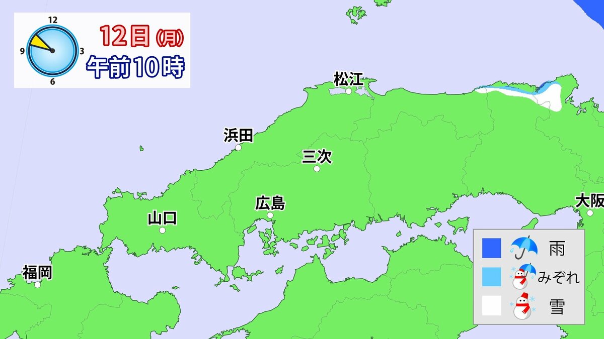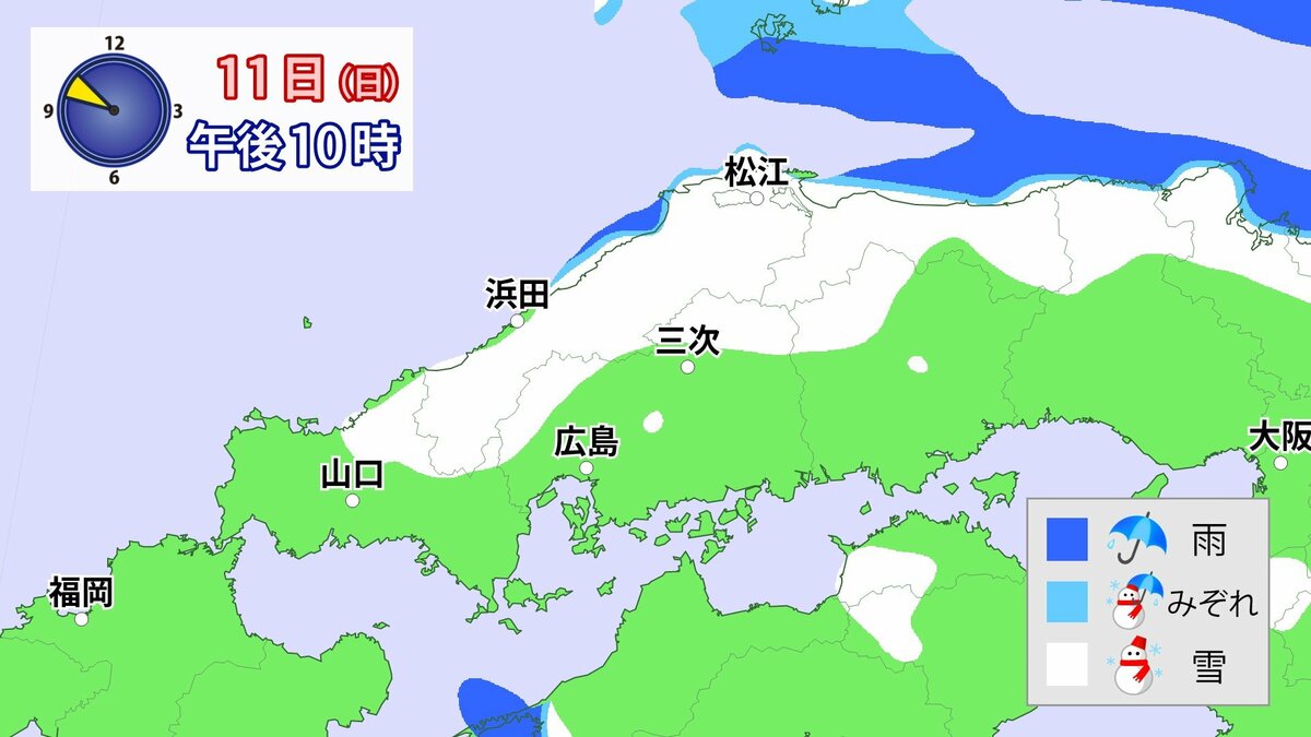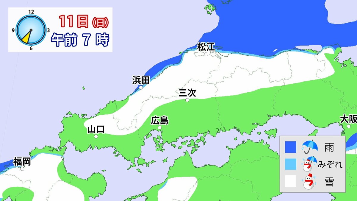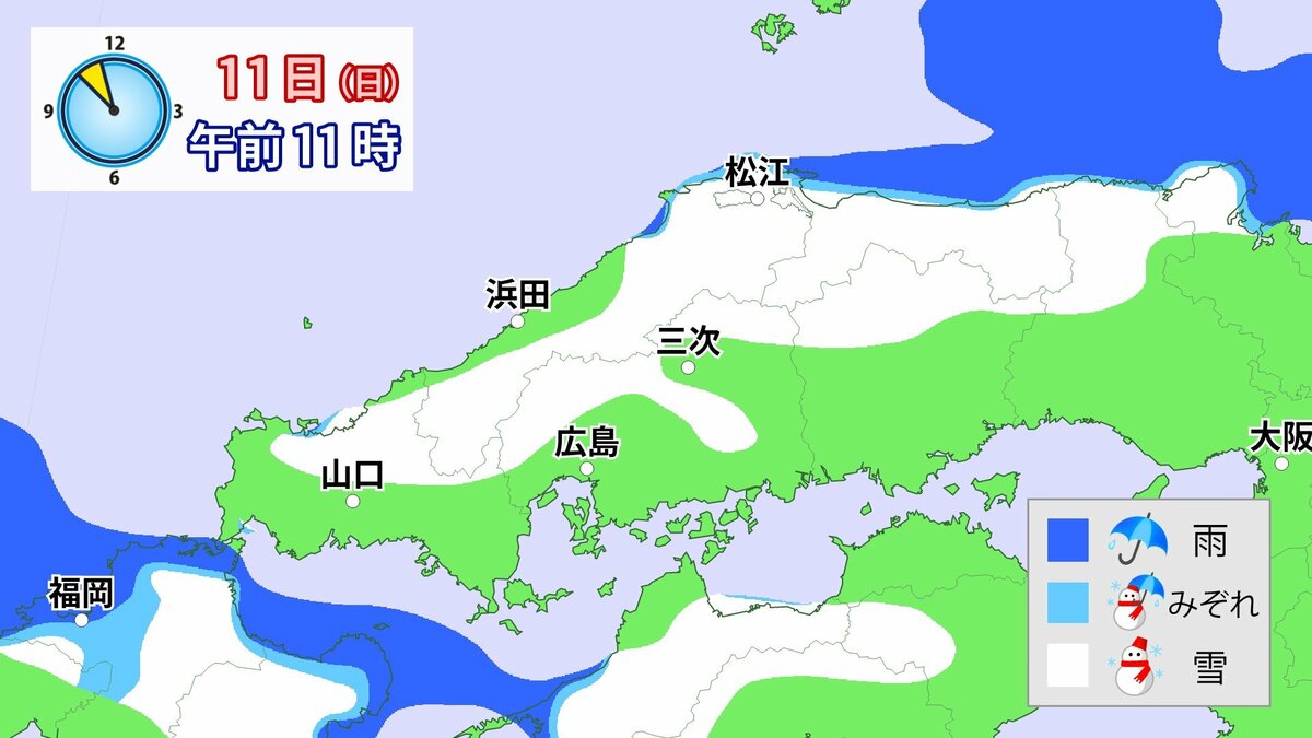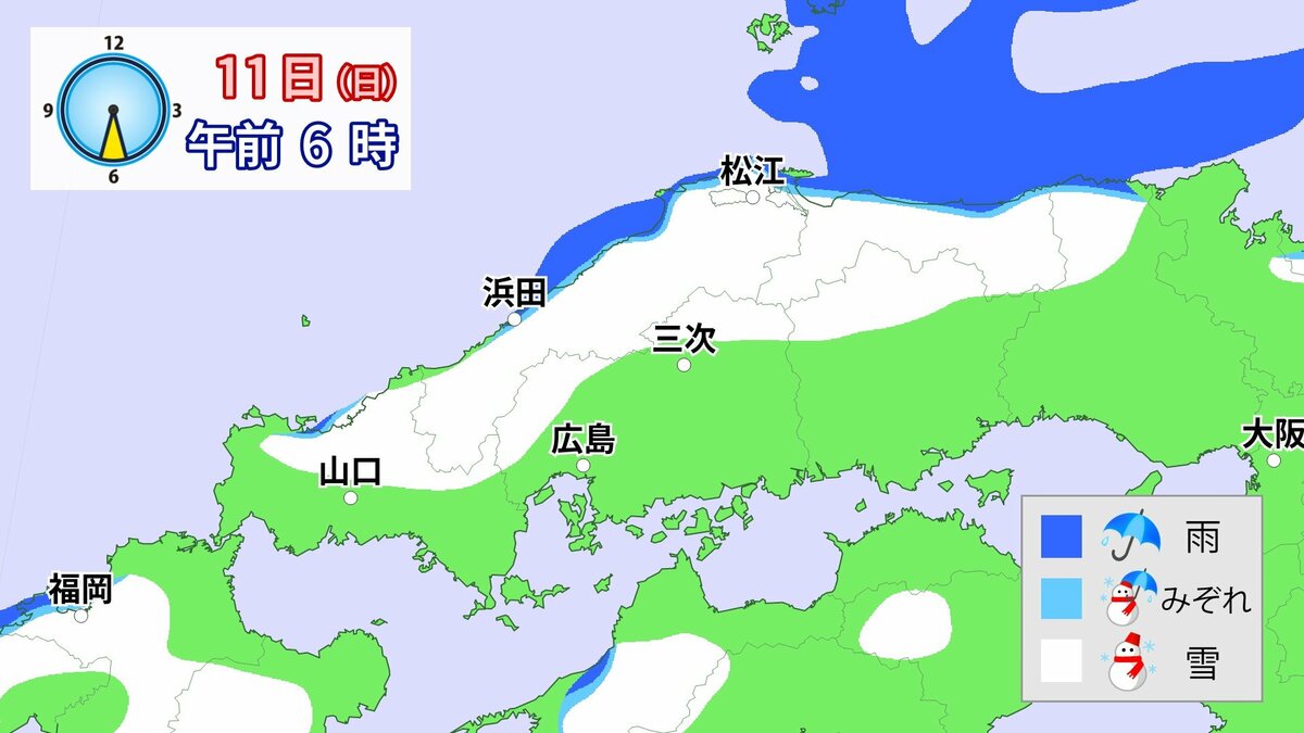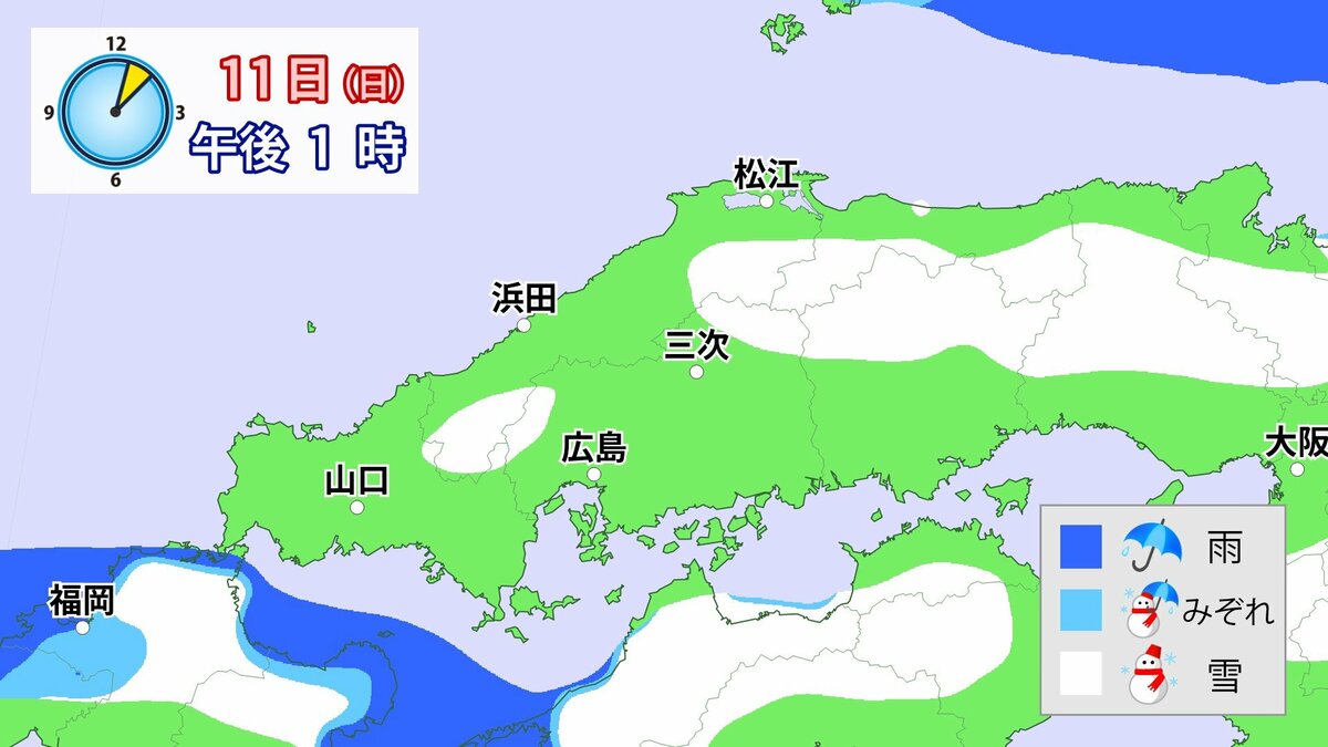 気象庁によりますと、広島県では、11日から12日頃にかけて大雪となる見込みです。寒気が強いため、普段雪の少ない南部の平地でも大雪となるおそれがあります。積雪や路面の凍結による交通障害に十分注意してください。また、10日昼過ぎから10日夜遅くにかけて、竜巻などの激しい突風や落雷、急な強い雨に注意してください。