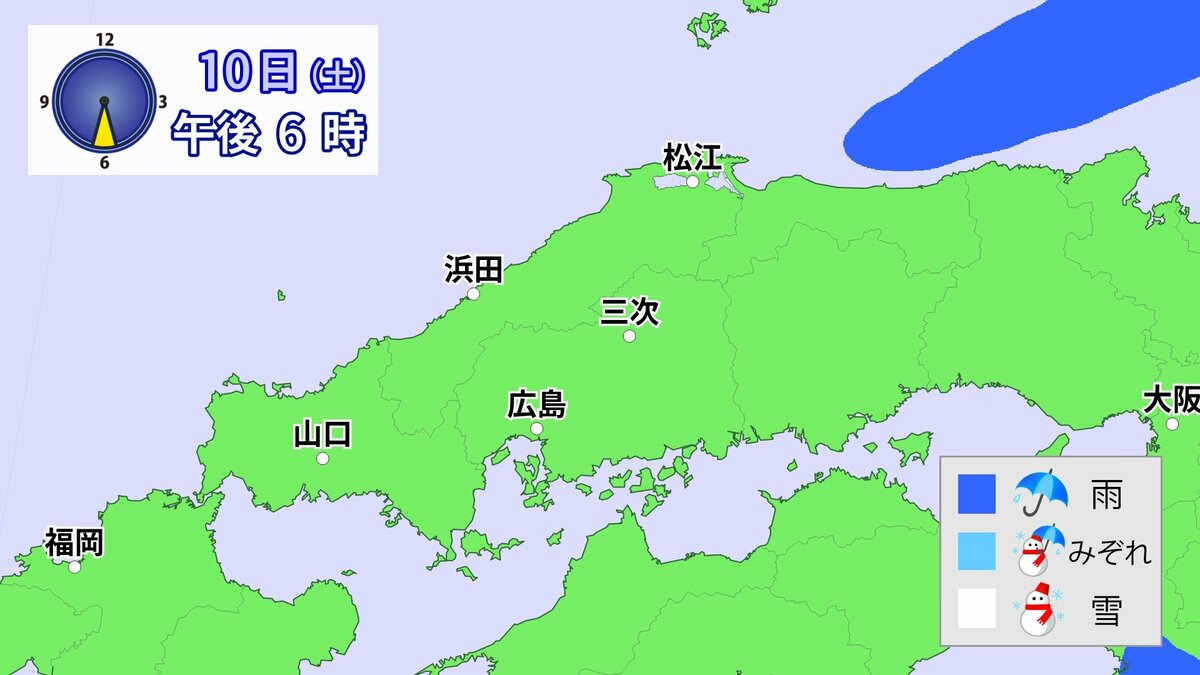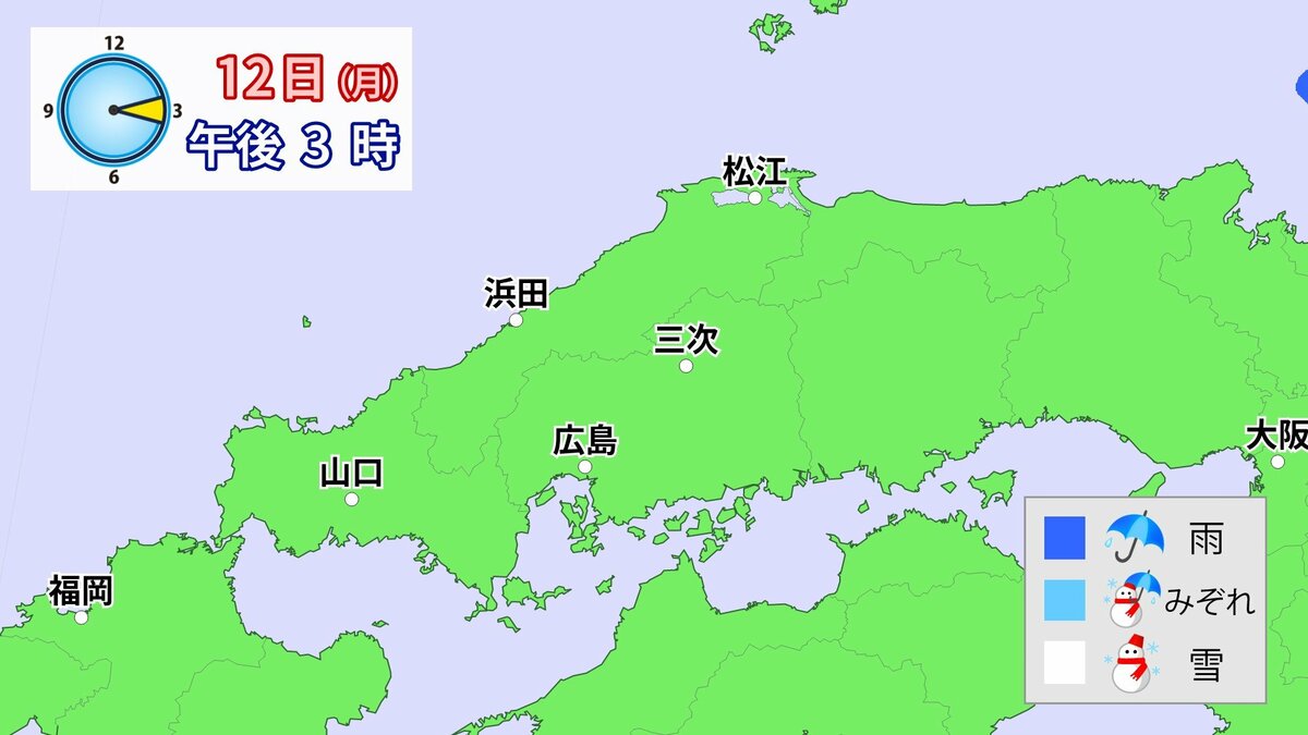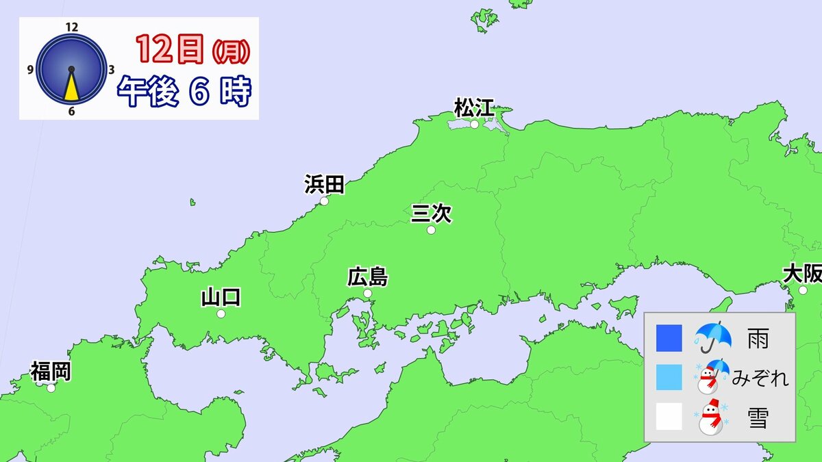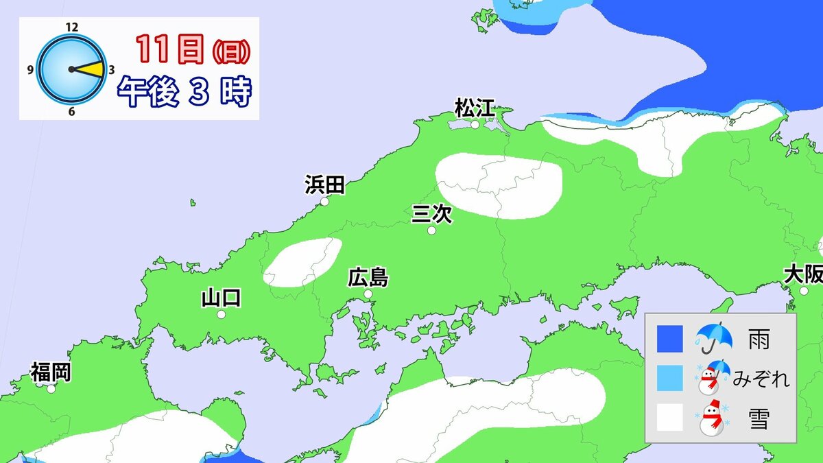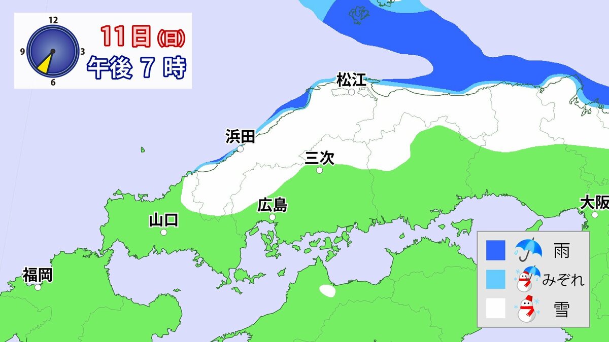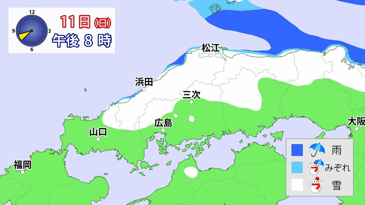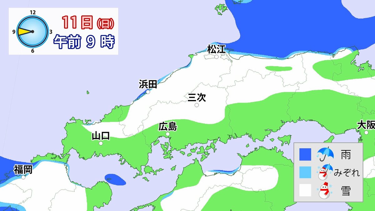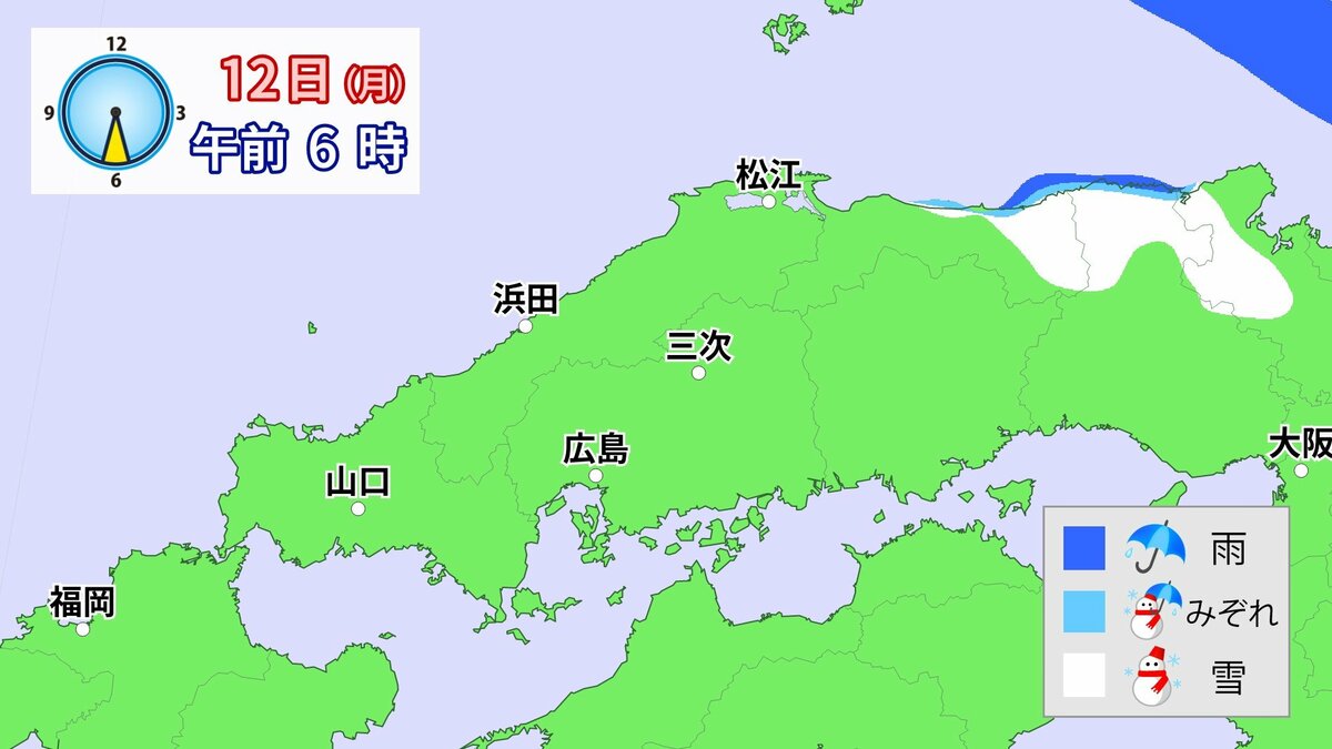 気象庁によりますと、広島県では、11日から12日頃にかけて大雪となる見込みです。寒気が強いため、普段雪の少ない南部の平地でも大雪となるおそれがあります。積雪や路面の凍結による交通障害に十分注意してください。また、10日昼過ぎから10日夜遅くにかけて、竜巻などの激しい突風や落雷、急な強い雨に注意してください。
