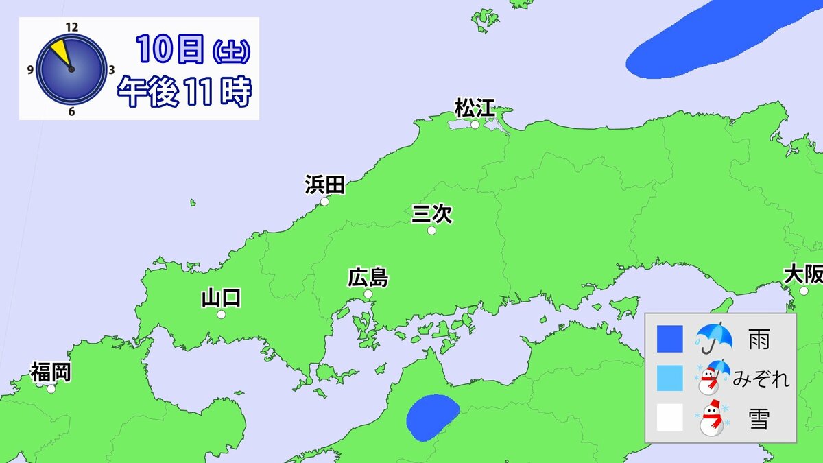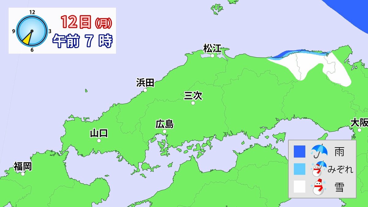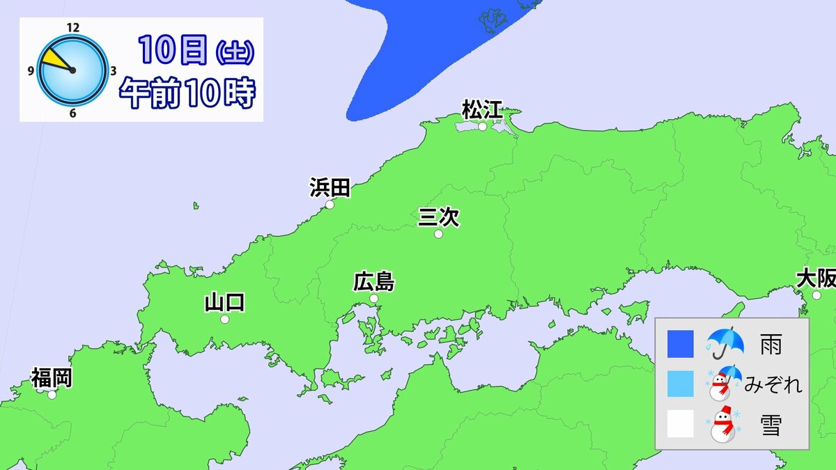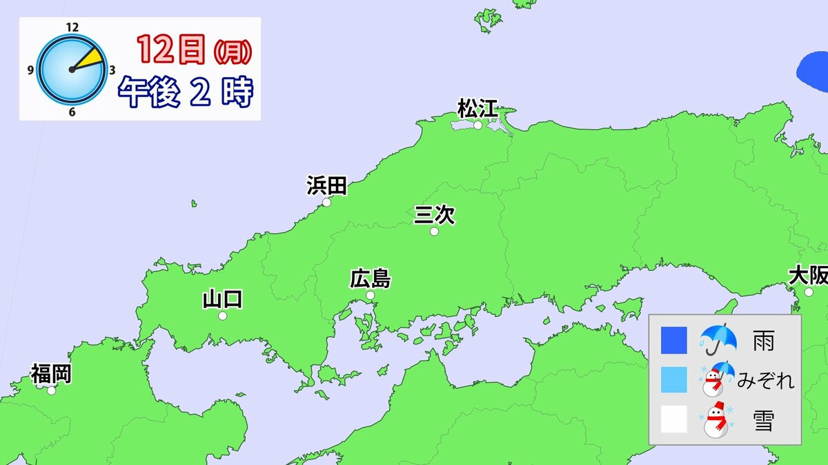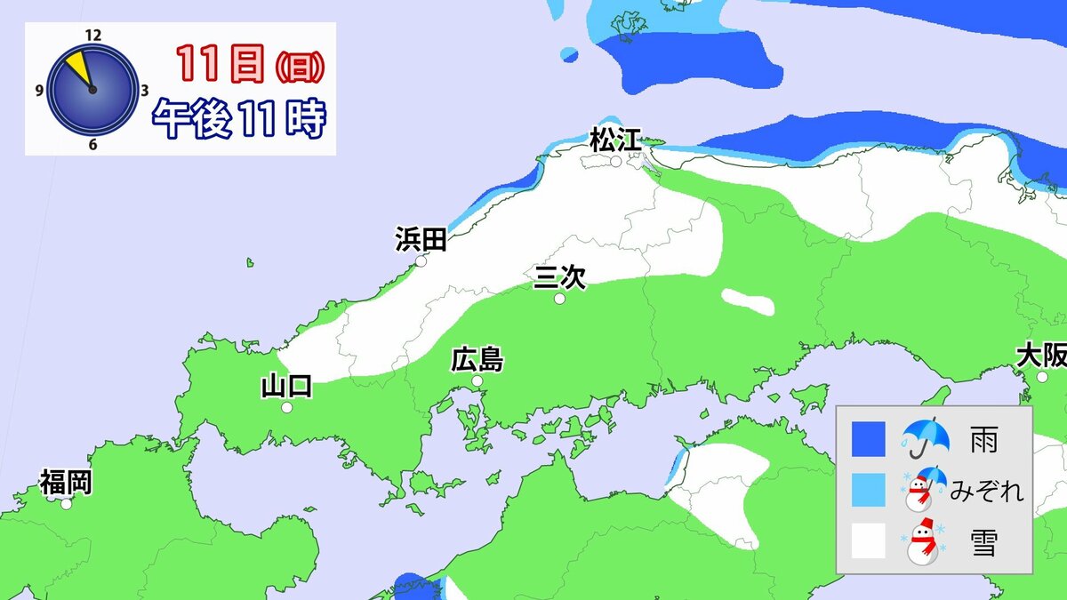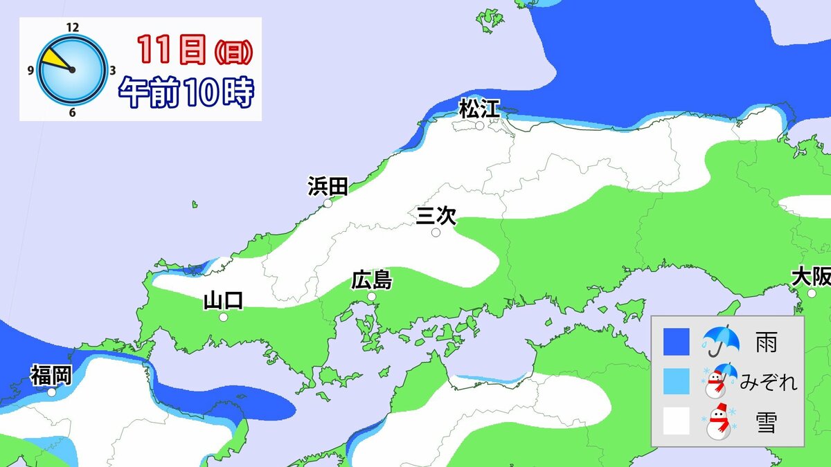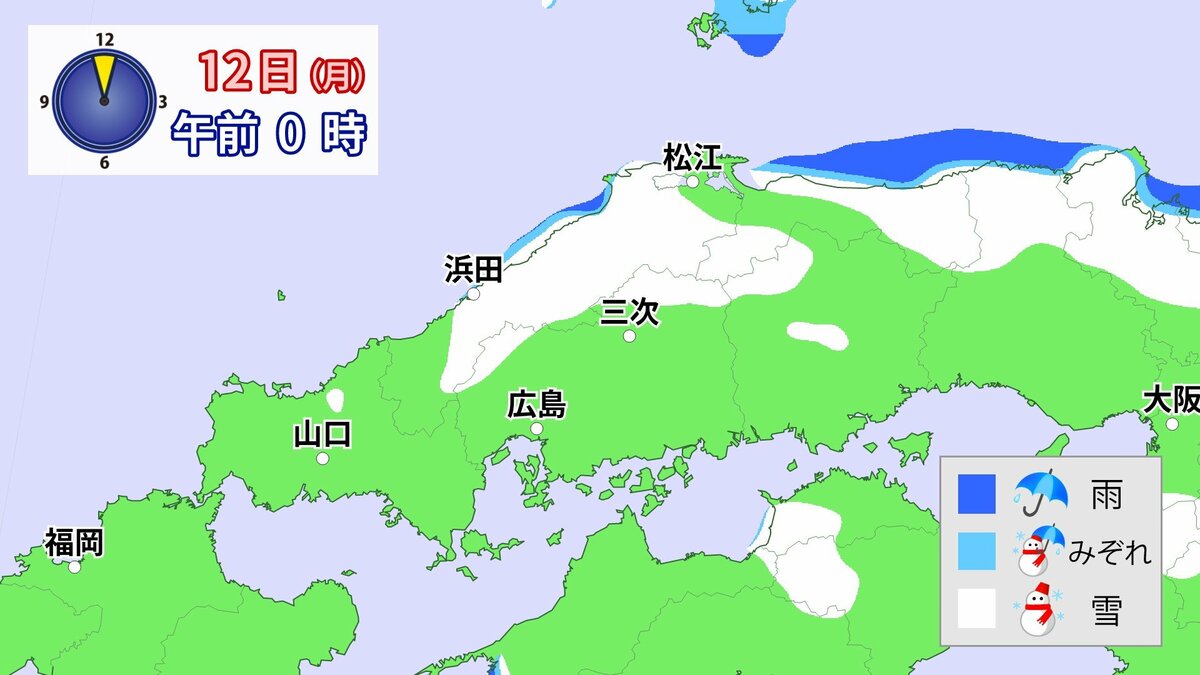 気象庁によりますと、広島県では、11日から12日頃にかけて大雪となる見込みです。寒気が強いため、普段雪の少ない南部の平地でも大雪となるおそれがあります。積雪や路面の凍結による交通障害に十分注意してください。また、10日昼過ぎから10日夜遅くにかけて、竜巻などの激しい突風や落雷、急な強い雨に注意してください。