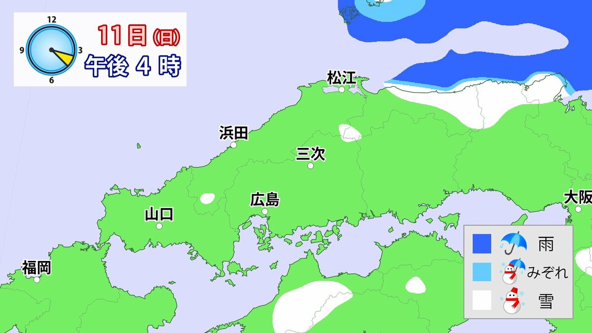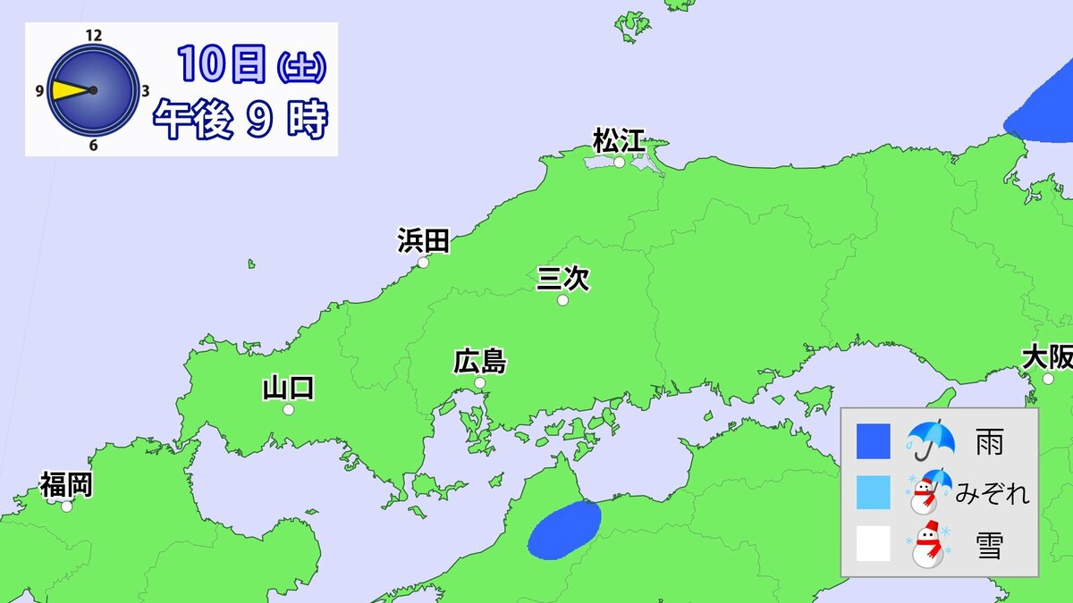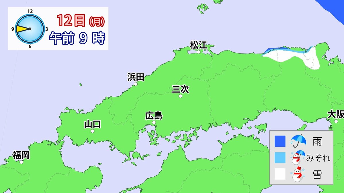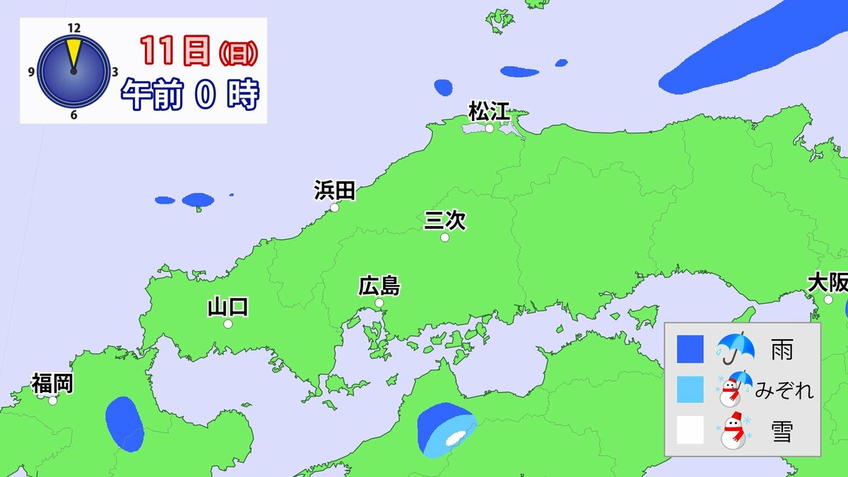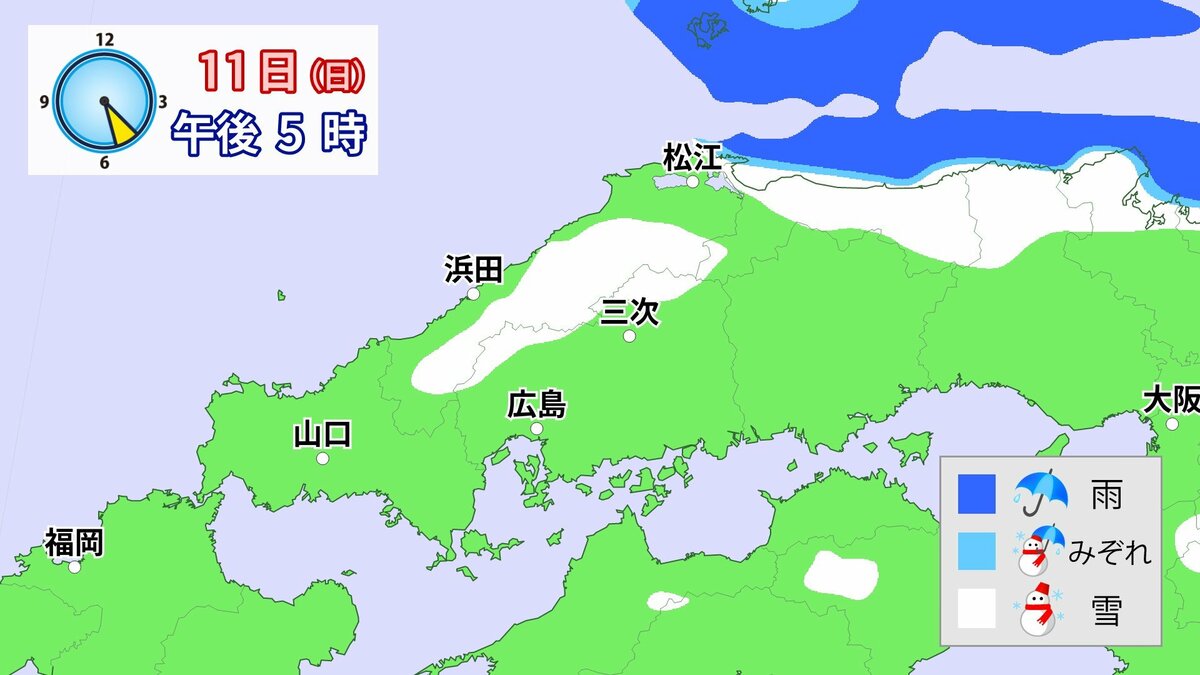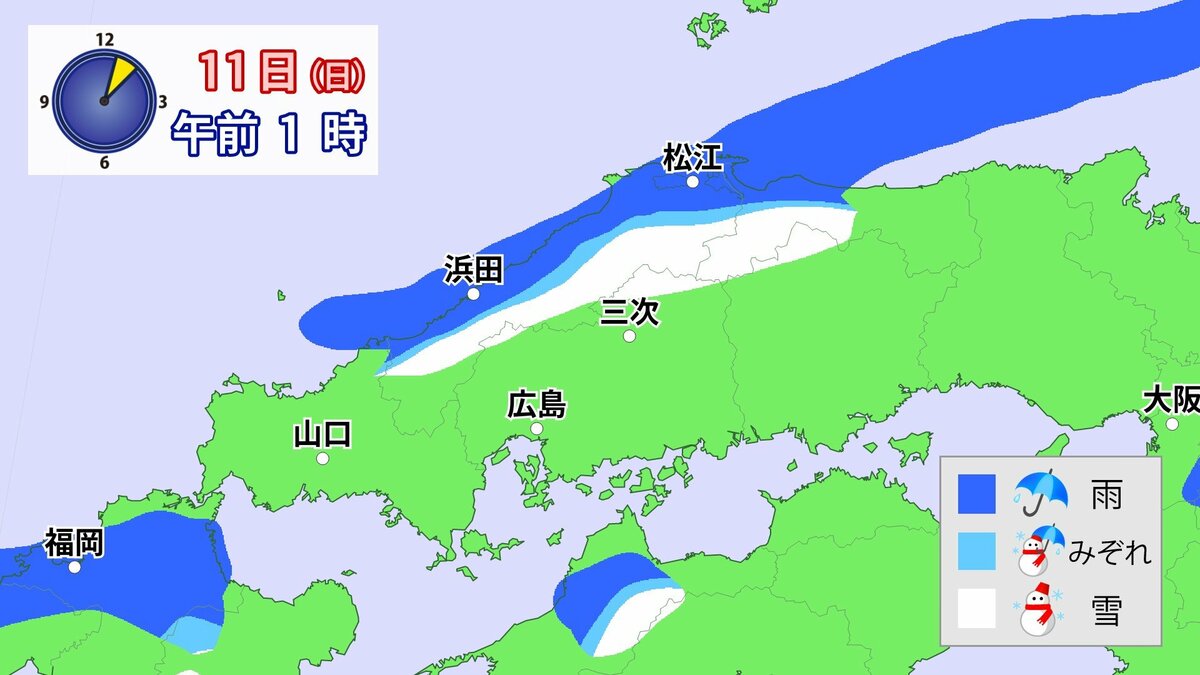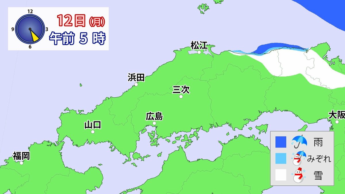 気象庁によりますと、広島県では、11日から12日頃にかけて大雪となる見込みです。寒気が強いため、普段雪の少ない南部の平地でも大雪となるおそれがあります。積雪や路面の凍結による交通障害に十分注意してください。また、10日昼過ぎから10日夜遅くにかけて、竜巻などの激しい突風や落雷、急な強い雨に注意してください。