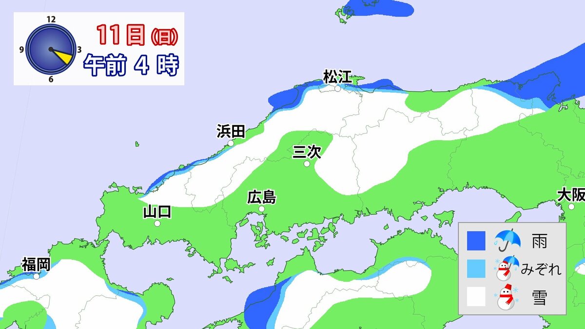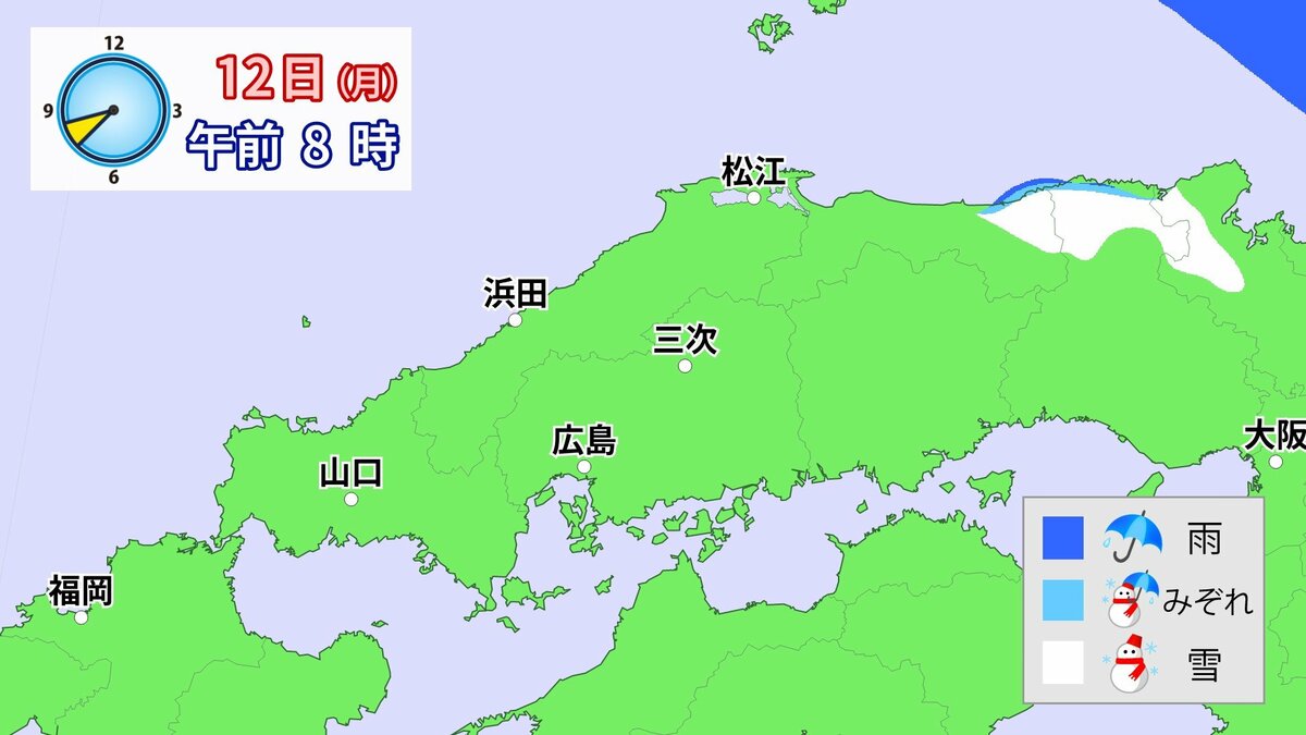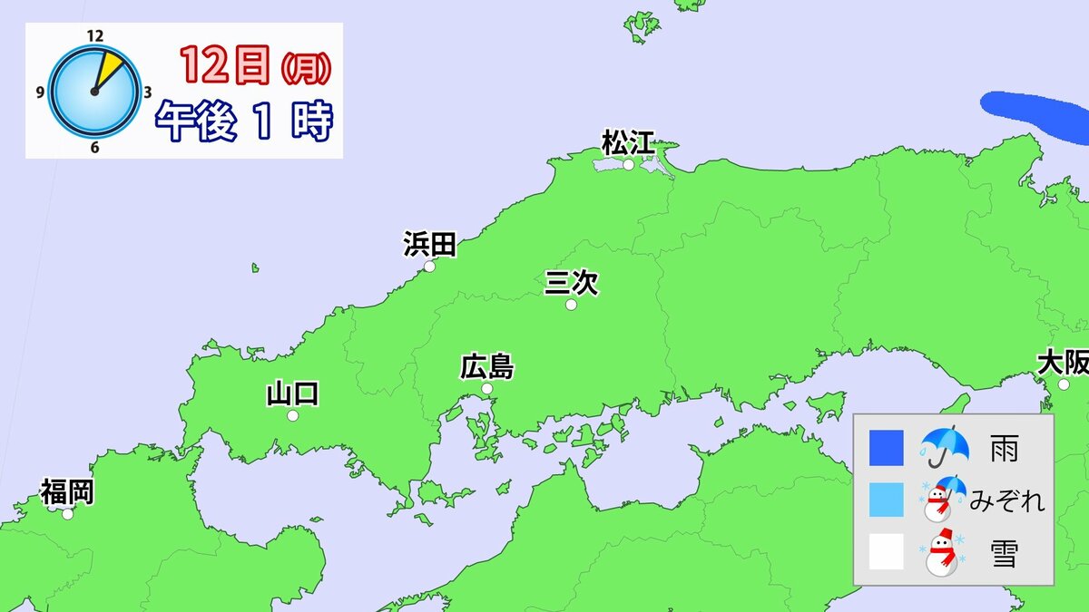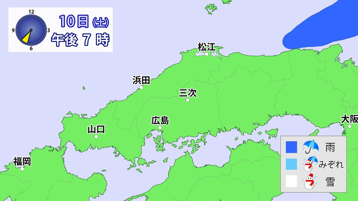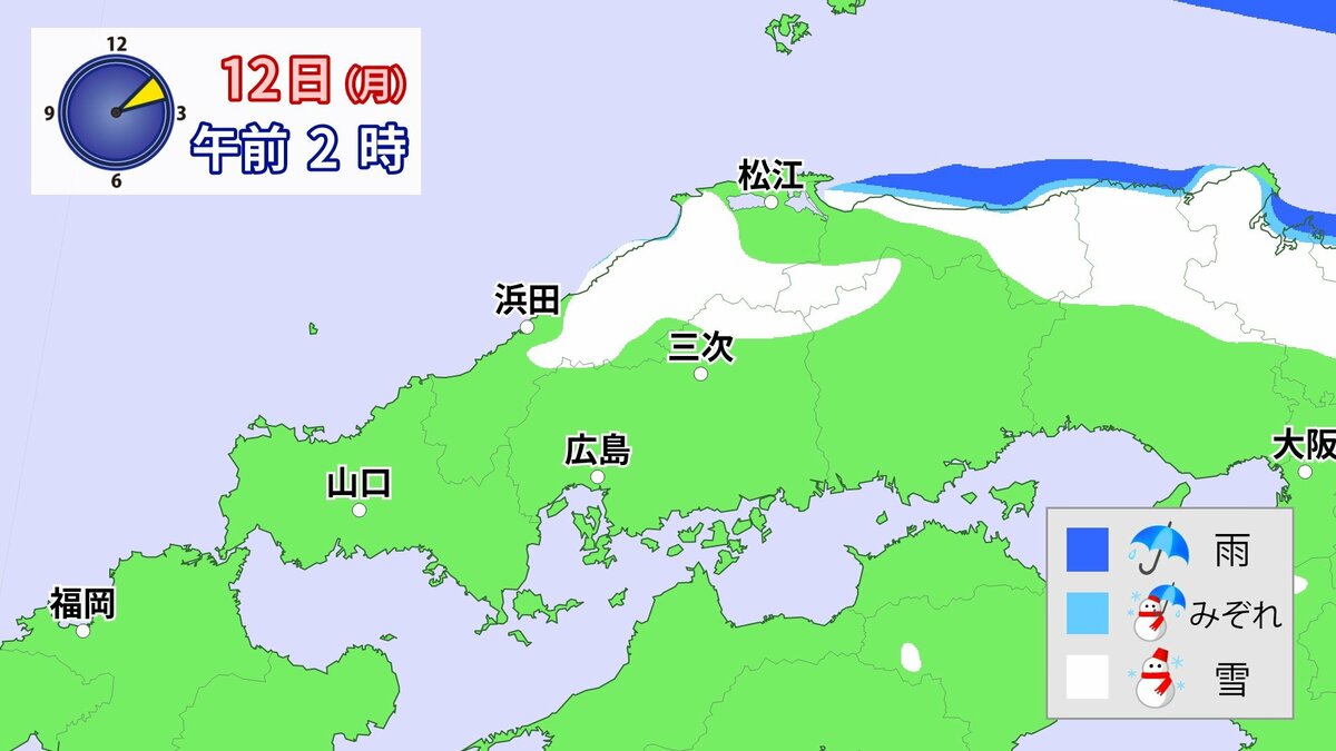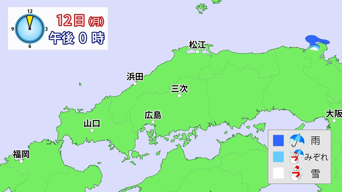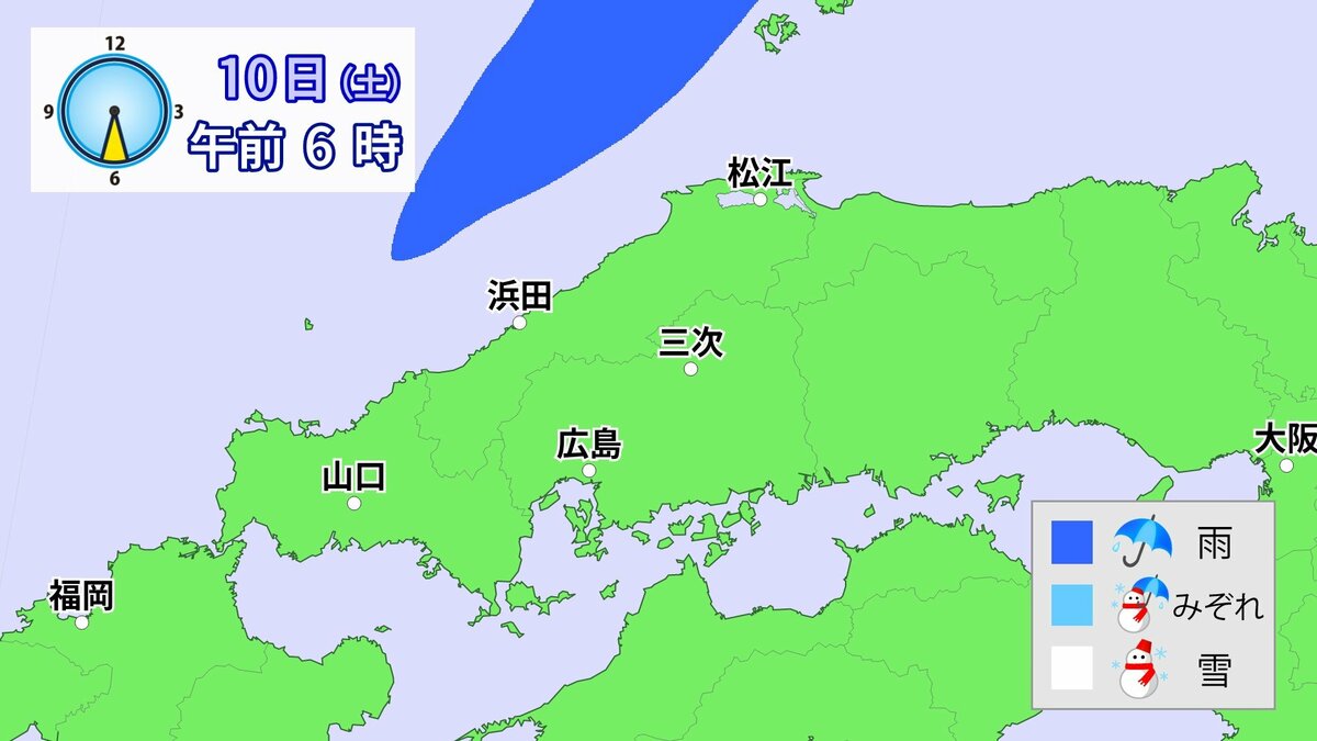 気象庁によりますと、広島県では、11日から12日頃にかけて大雪となる見込みです。寒気が強いため、普段雪の少ない南部の平地でも大雪となるおそれがあります。積雪や路面の凍結による交通障害に十分注意してください。また、10日昼過ぎから10日夜遅くにかけて、竜巻などの激しい突風や落雷、急な強い雨に注意してください。