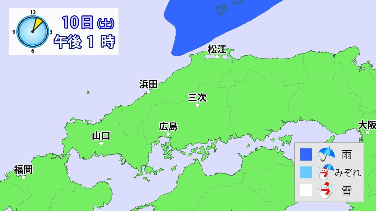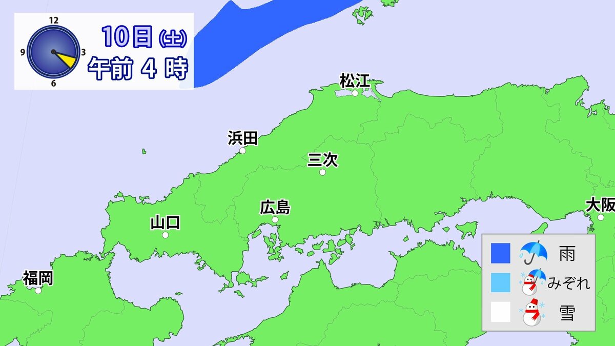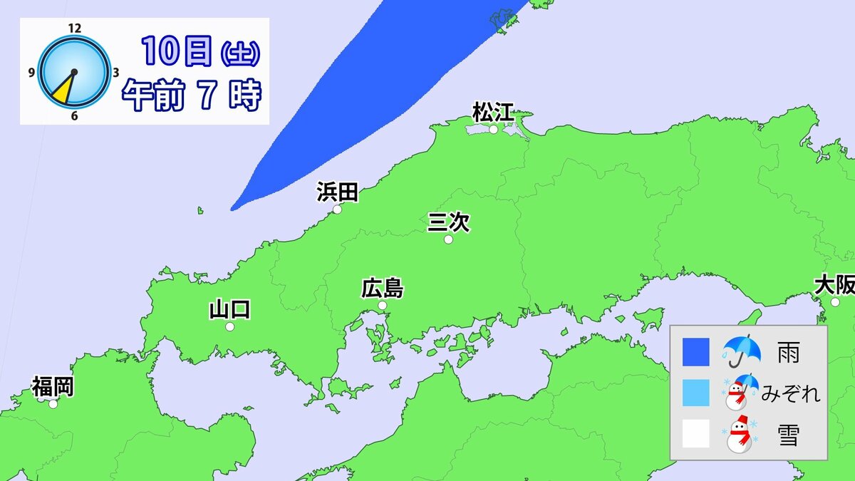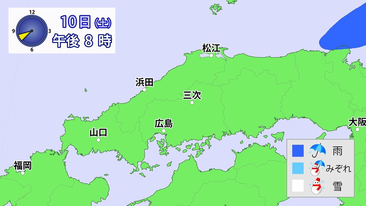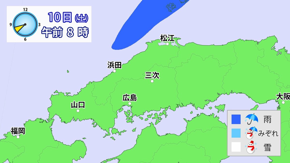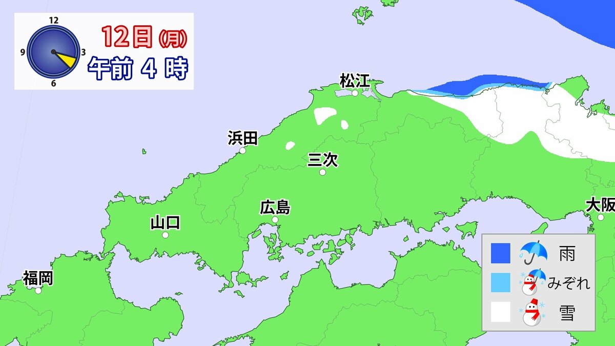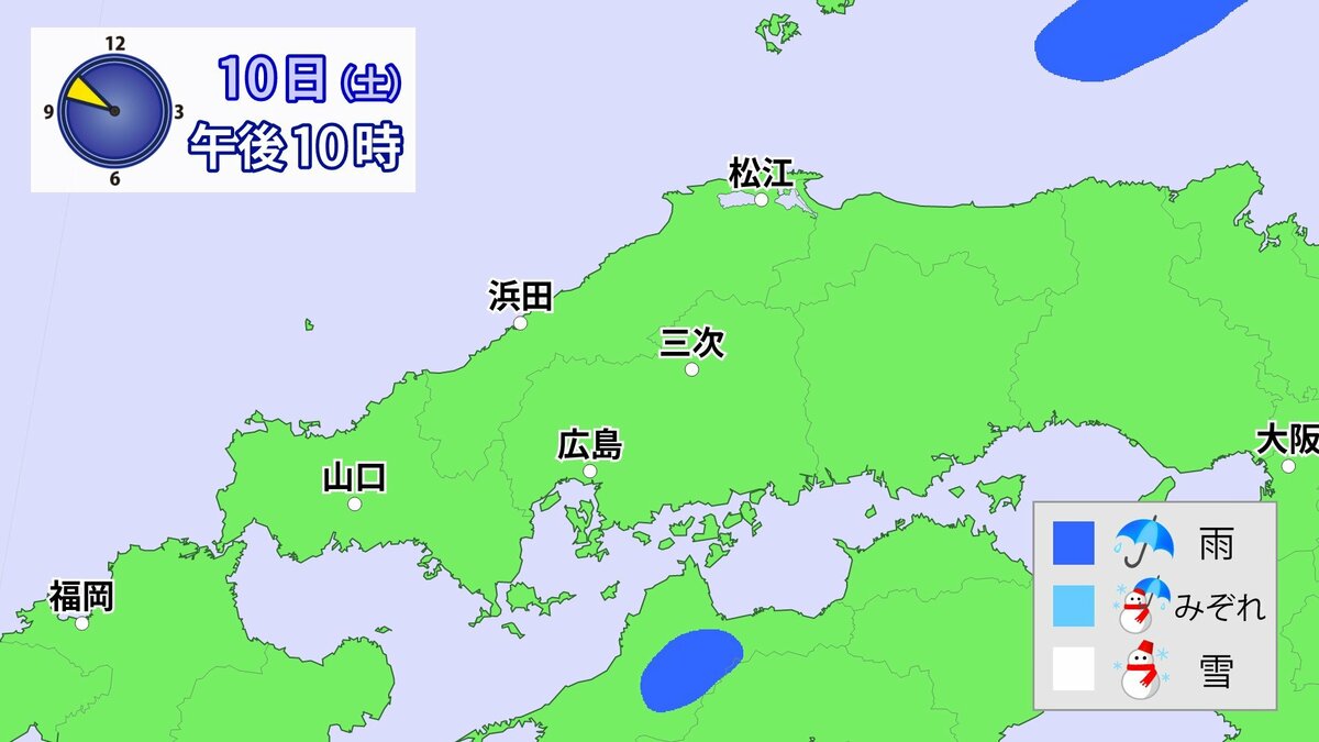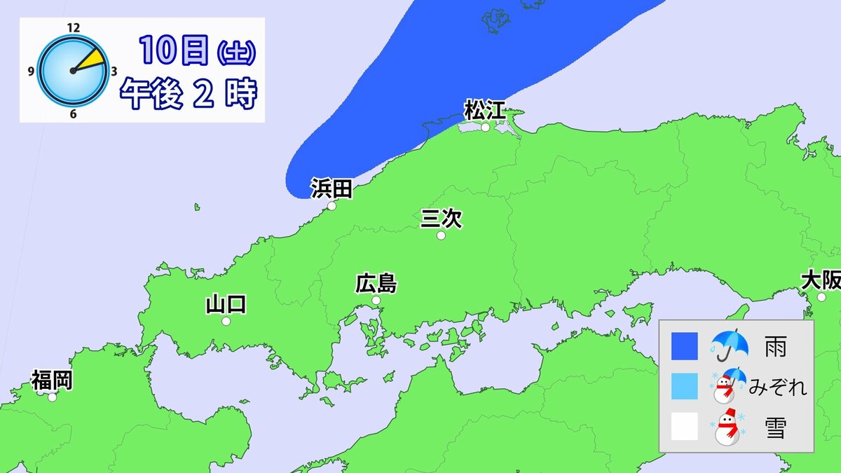 気象庁によりますと、広島県では、11日から12日頃にかけて大雪となる見込みです。寒気が強いため、普段雪の少ない南部の平地でも大雪となるおそれがあります。積雪や路面の凍結による交通障害に十分注意してください。また、10日昼過ぎから10日夜遅くにかけて、竜巻などの激しい突風や落雷、急な強い雨に注意してください。