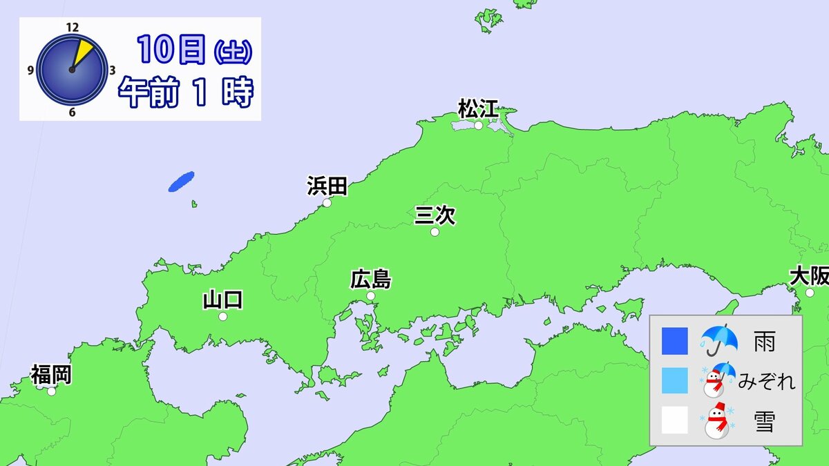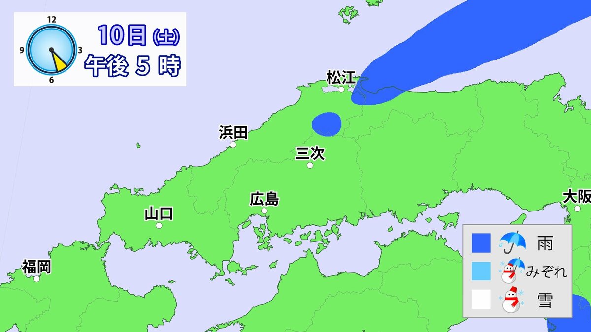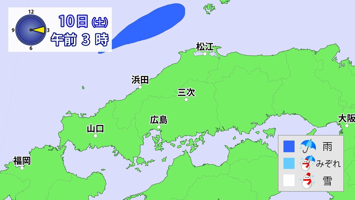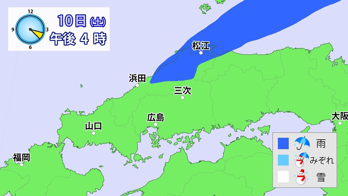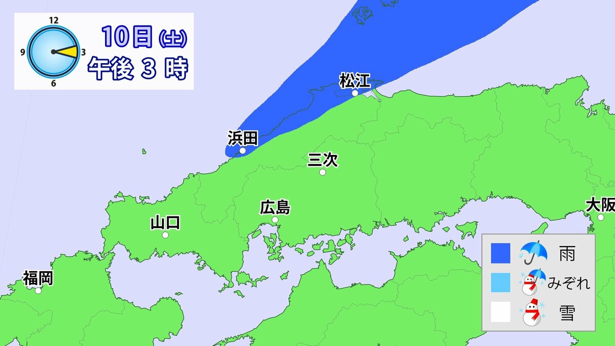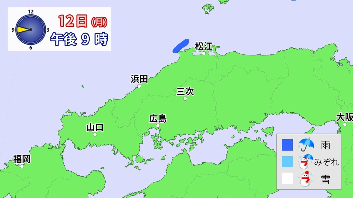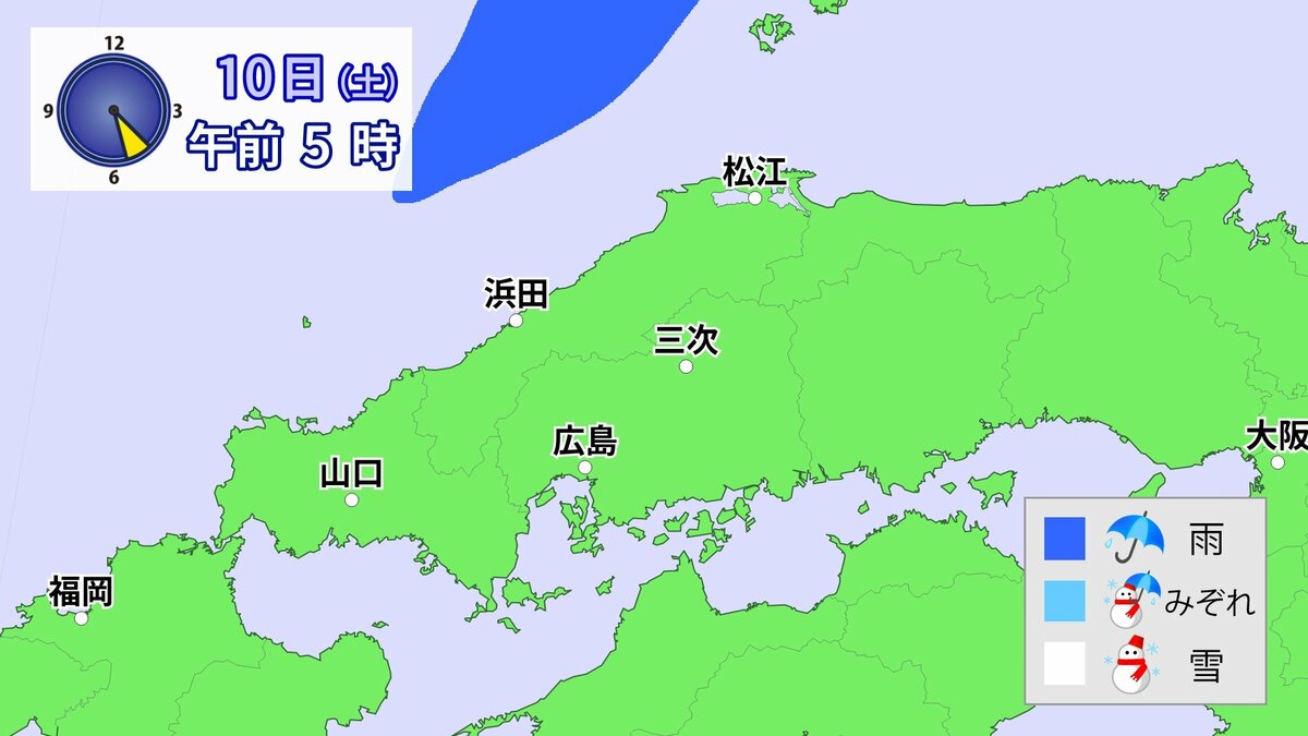 気象庁によりますと、広島県では、11日から12日頃にかけて大雪となる見込みです。寒気が強いため、普段雪の少ない南部の平地でも大雪となるおそれがあります。積雪や路面の凍結による交通障害に十分注意してください。また、10日昼過ぎから10日夜遅くにかけて、竜巻などの激しい突風や落雷、急な強い雨に注意してください。