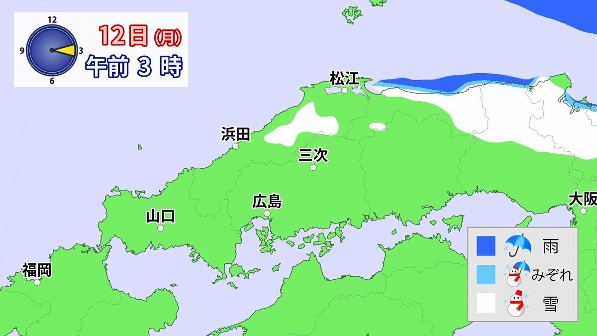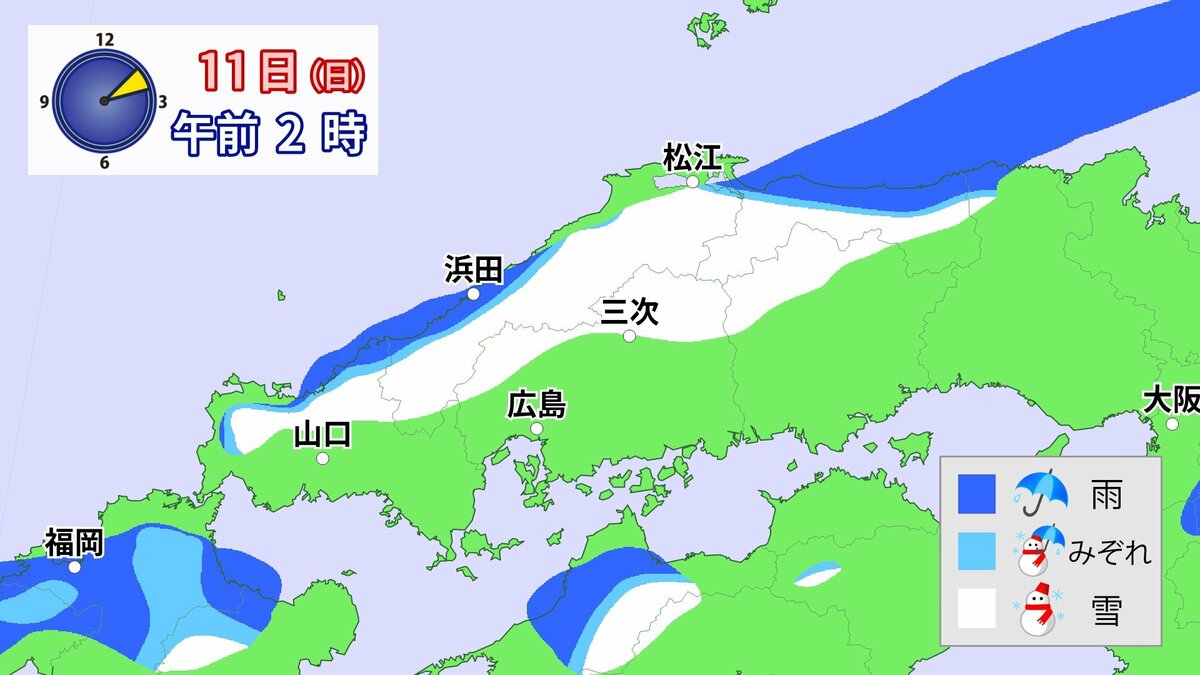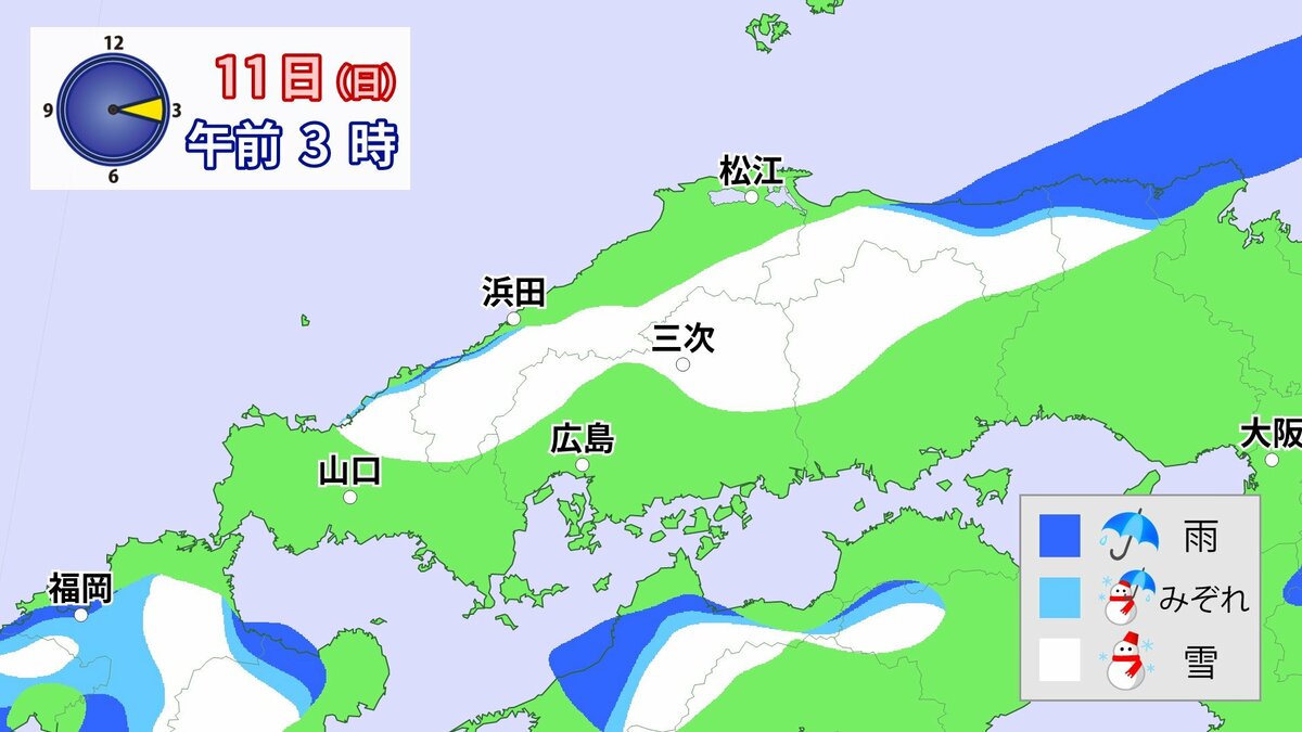 Uターンラッシュがはじまった2日、雪の影響で複数の車がスタックしたことで、広島・山口県境付近の山陽自動車道では、大規模渋滞が発生しました。次の3連休も、中国地方の雪が少ない地域で降る可能性があります。11日(日)から12日(月)の広島県は、広い範囲で雪が降る見込みです。雪道は、必ず冬用タイヤで走行するようにしてください。