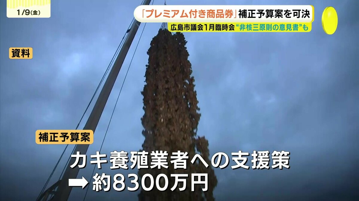 1月臨時会で広島市は、▼物価高対策として、5000円で購入すると7500円分の買い物ができる「プレミアム付き商品券」の発行費用として68億5000万円、▼カキ養殖業者への支援策としておよそ8300万円が盛り込まれた補正予算案を提出。