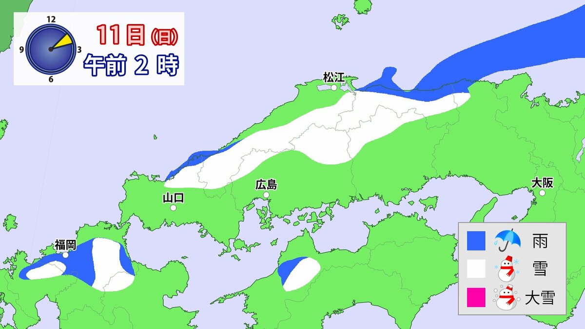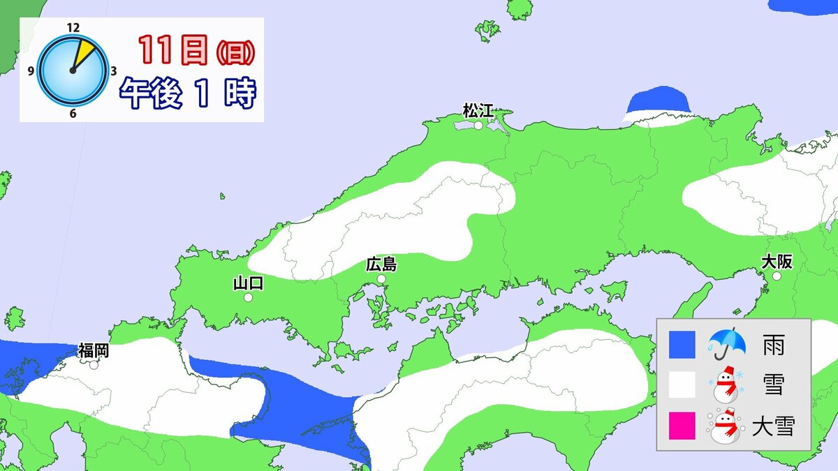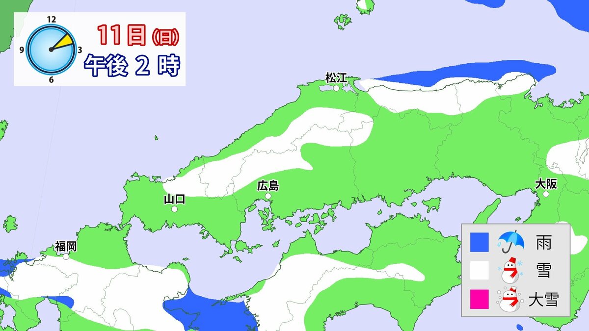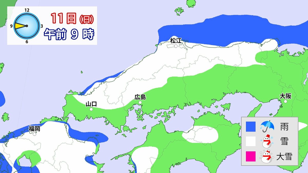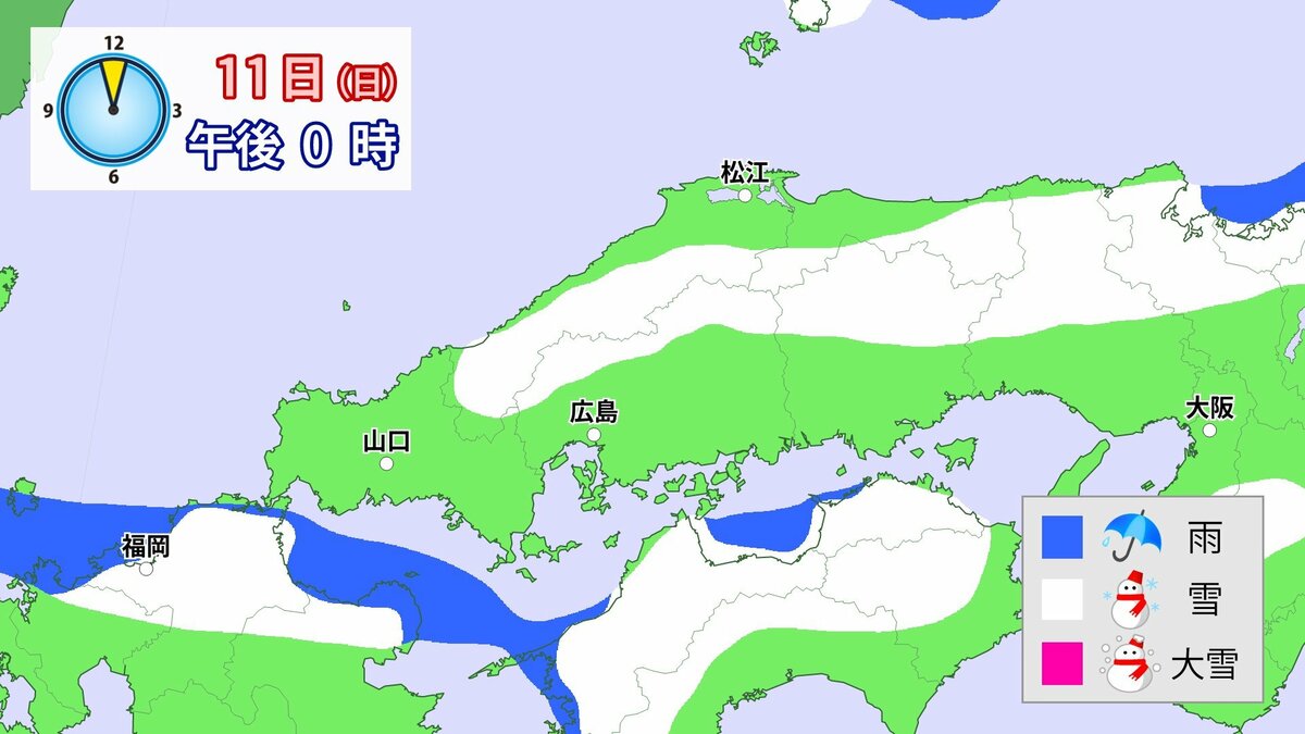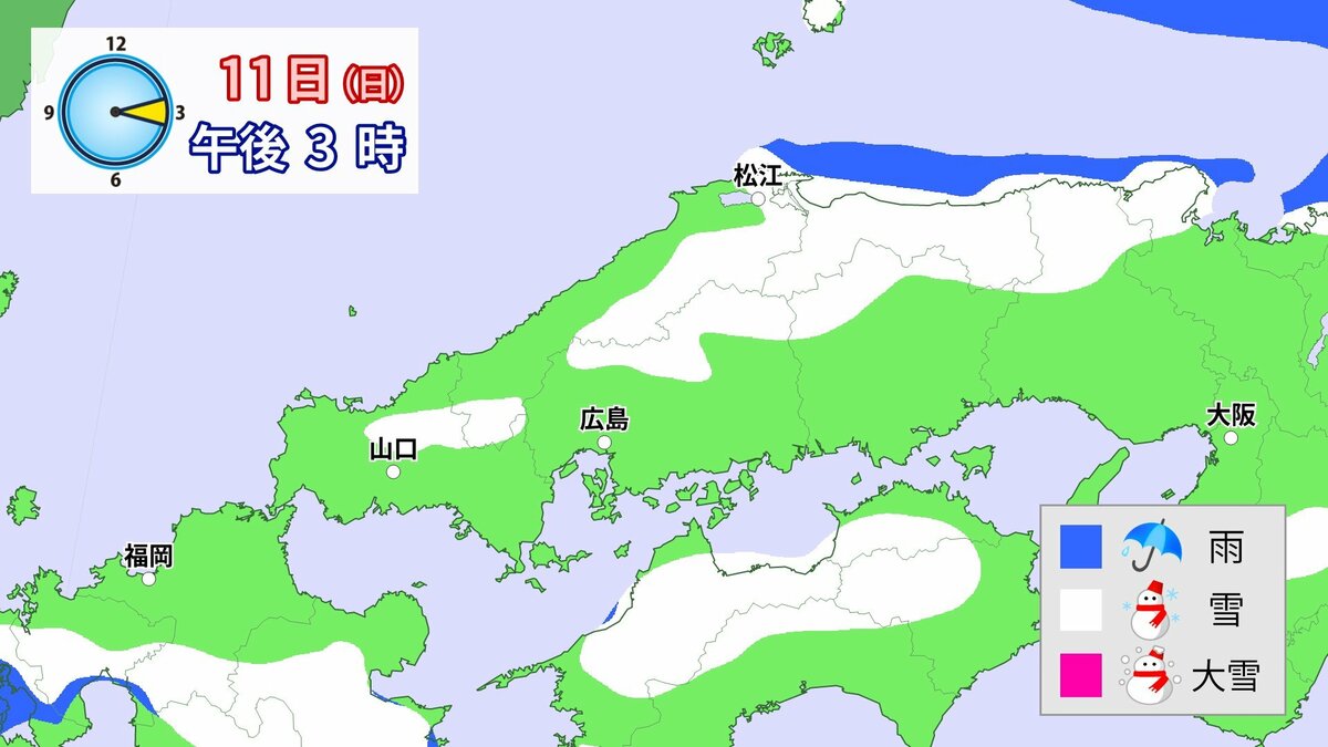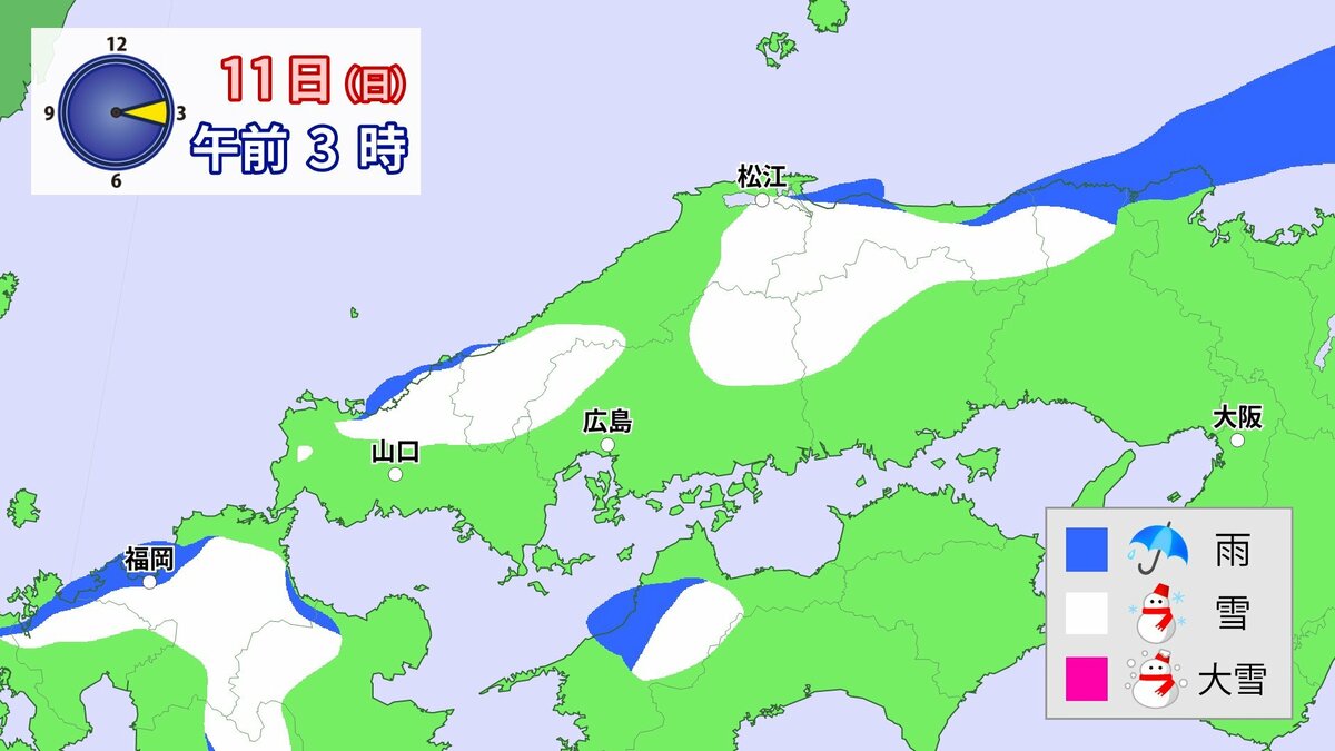 Uターンラッシュがはじまった2日、雪の影響で複数の車がスタックしたことで、広島・山口県境付近の山陽自動車道では、大規模渋滞が発生しました。次の3連休も、中国地方の雪が少ない地域で降る可能性があります。11日(日)から12日(月)午前中にかけての広島県は、広い範囲で雪が降る見込みです。雪道は、必ず冬用タイヤで走行するようにしてください。