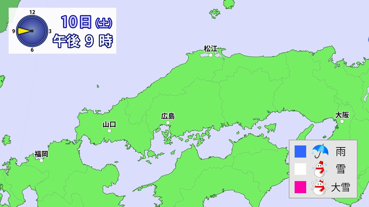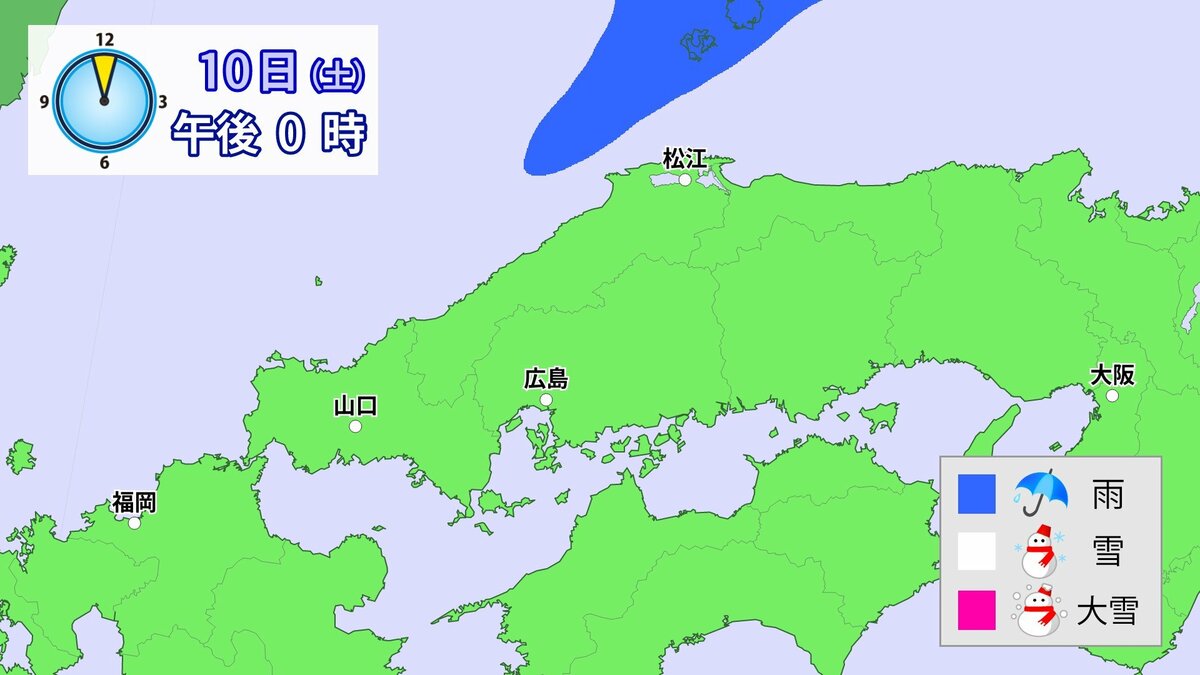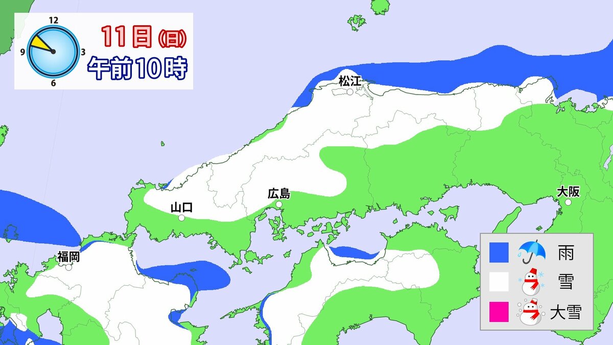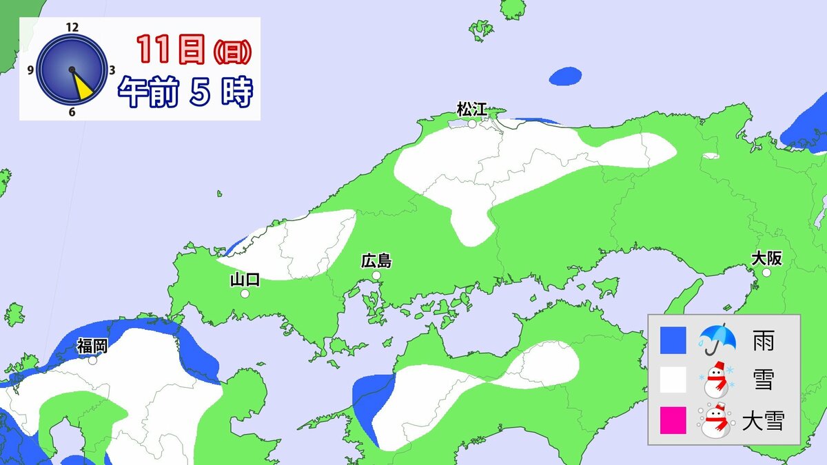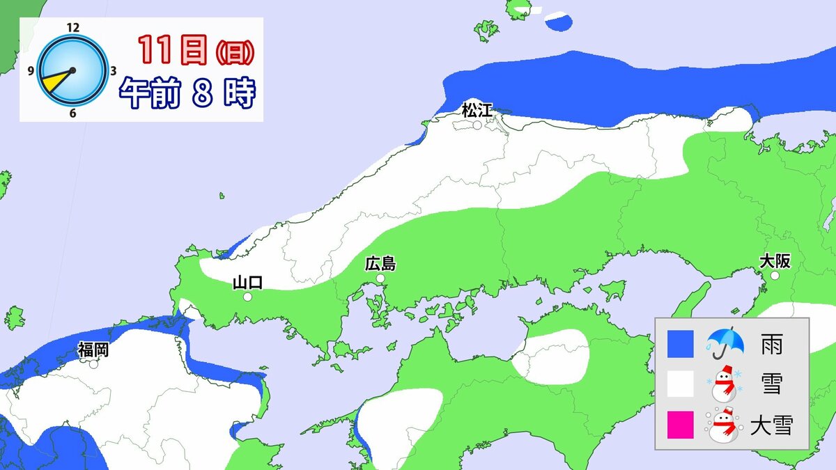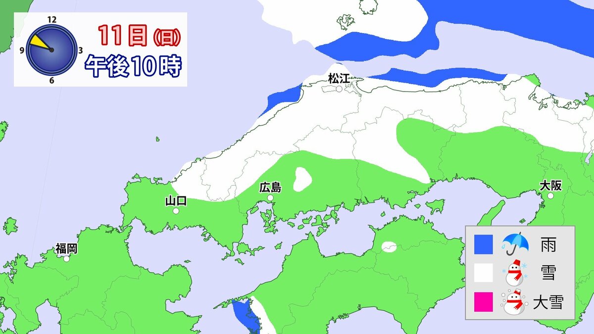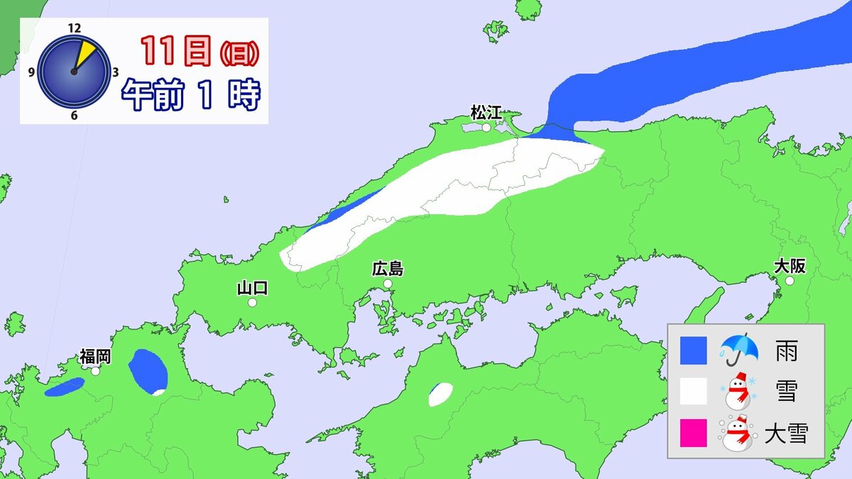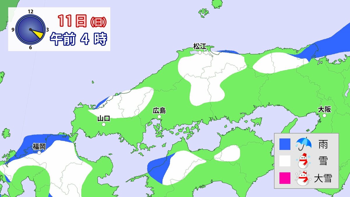 Uターンラッシュがはじまった2日、雪の影響で複数の車がスタックしたことで、広島・山口県境付近の山陽自動車道では、大規模渋滞が発生しました。次の3連休も、中国地方の雪が少ない地域で降る可能性があります。11日(日)から12日(月)午前中にかけての広島県は、広い範囲で雪が降る見込みです。雪道は、必ず冬用タイヤで走行するようにしてください。