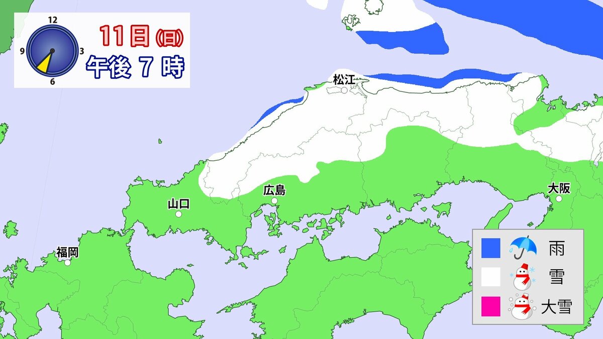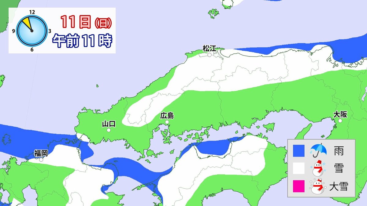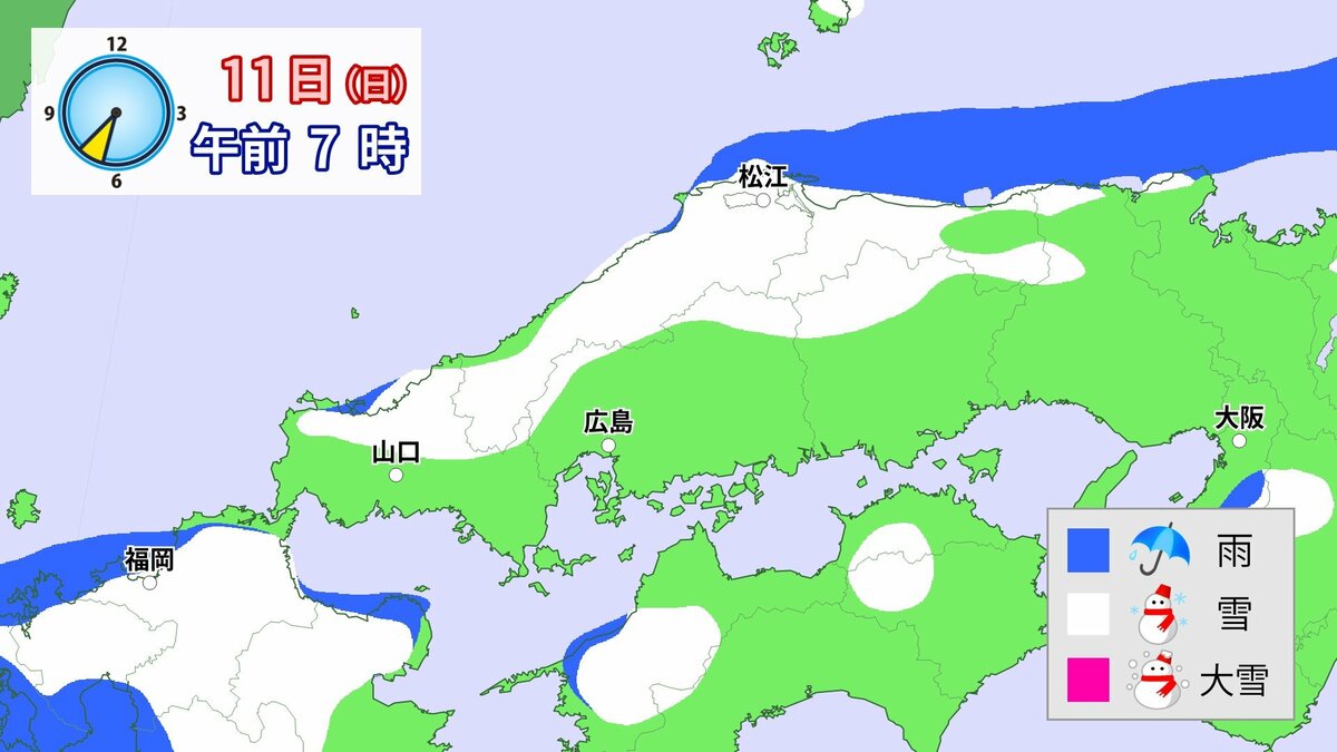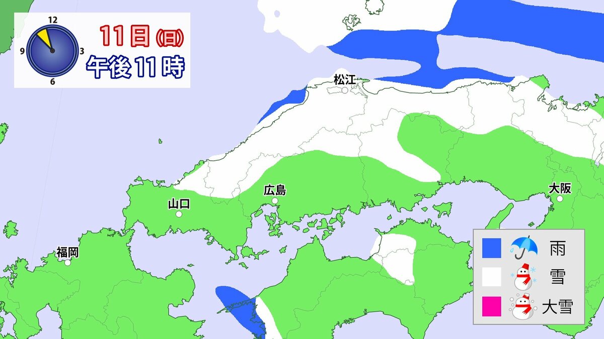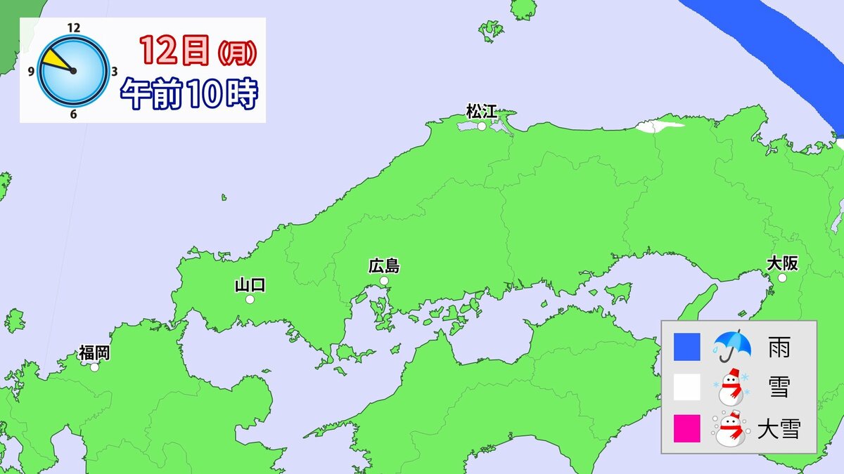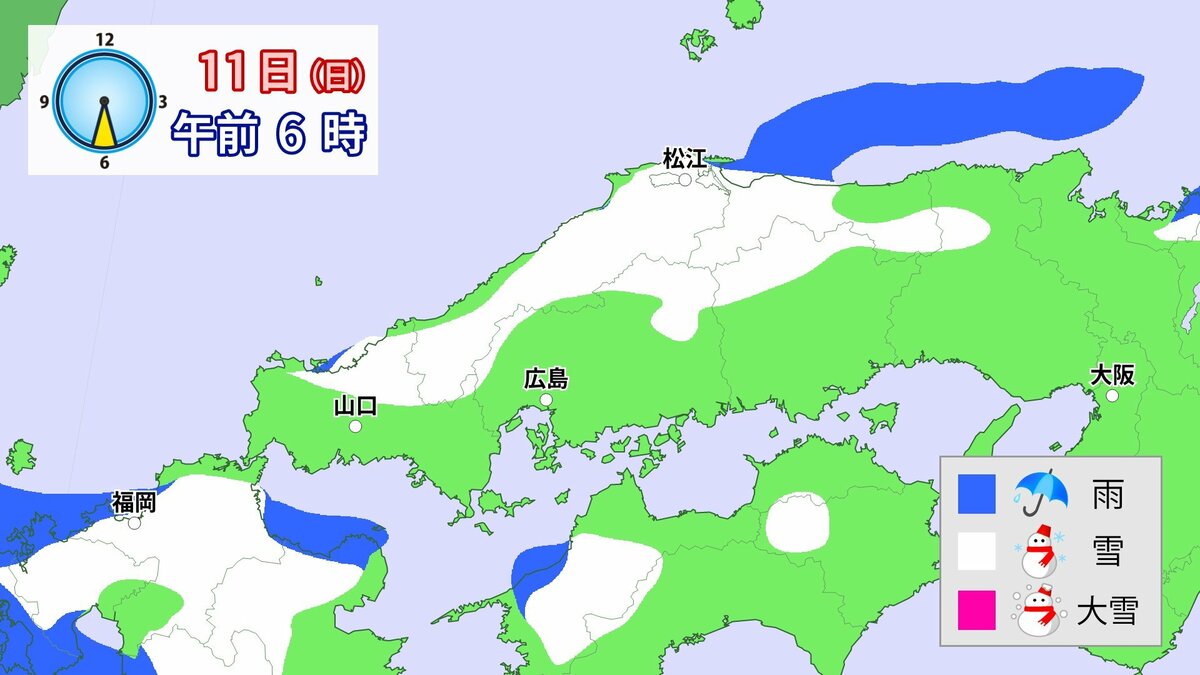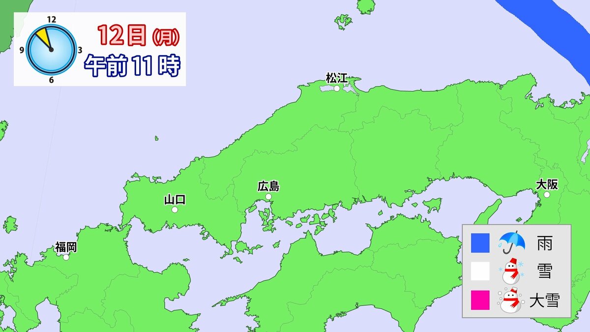 気象庁によりますと、広島県では、11日朝から12日午前中にかけて大雪となる見込みです。寒気が強いため、普段雪の少ない南部の平地でも大雪となるおそれがあります。雪雲が現在の予想以上に発達し、同じ場所で降り続いた場合は、警報級の大雪となる可能性があります。