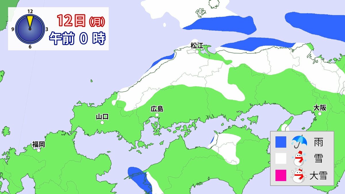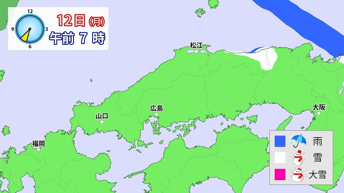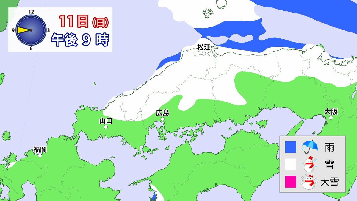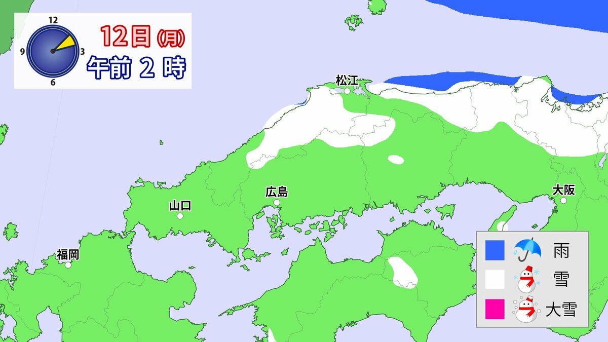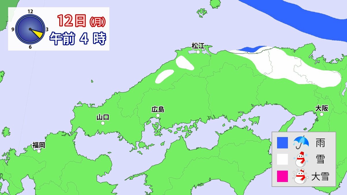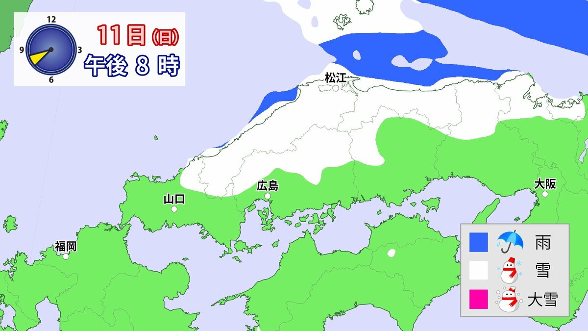 気象庁によりますと、広島県では、11日朝から12日午前中にかけて大雪となる見込みです。寒気が強いため、普段雪の少ない南部の平地でも大雪となるおそれがあります。雪雲が現在の予想以上に発達し、同じ場所で降り続いた場合は、警報級の大雪となる可能性があります。