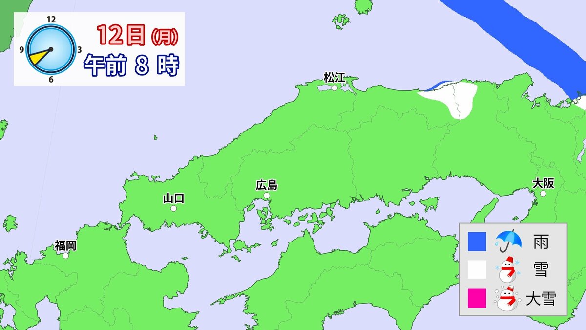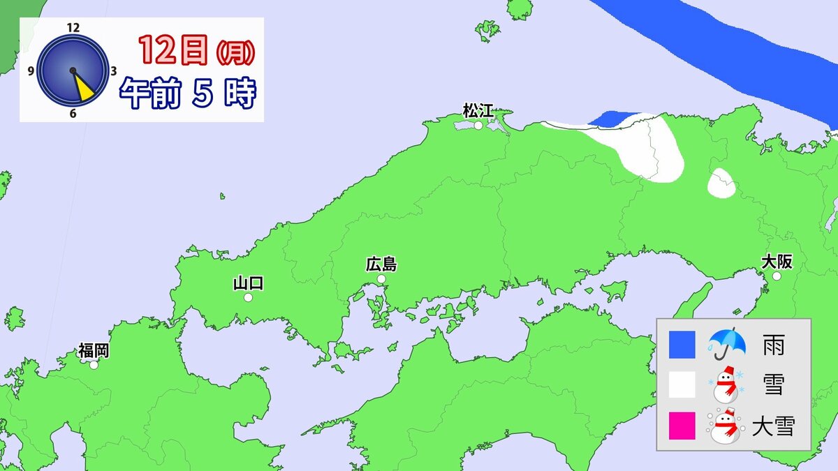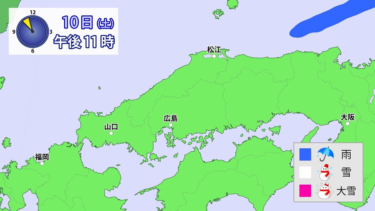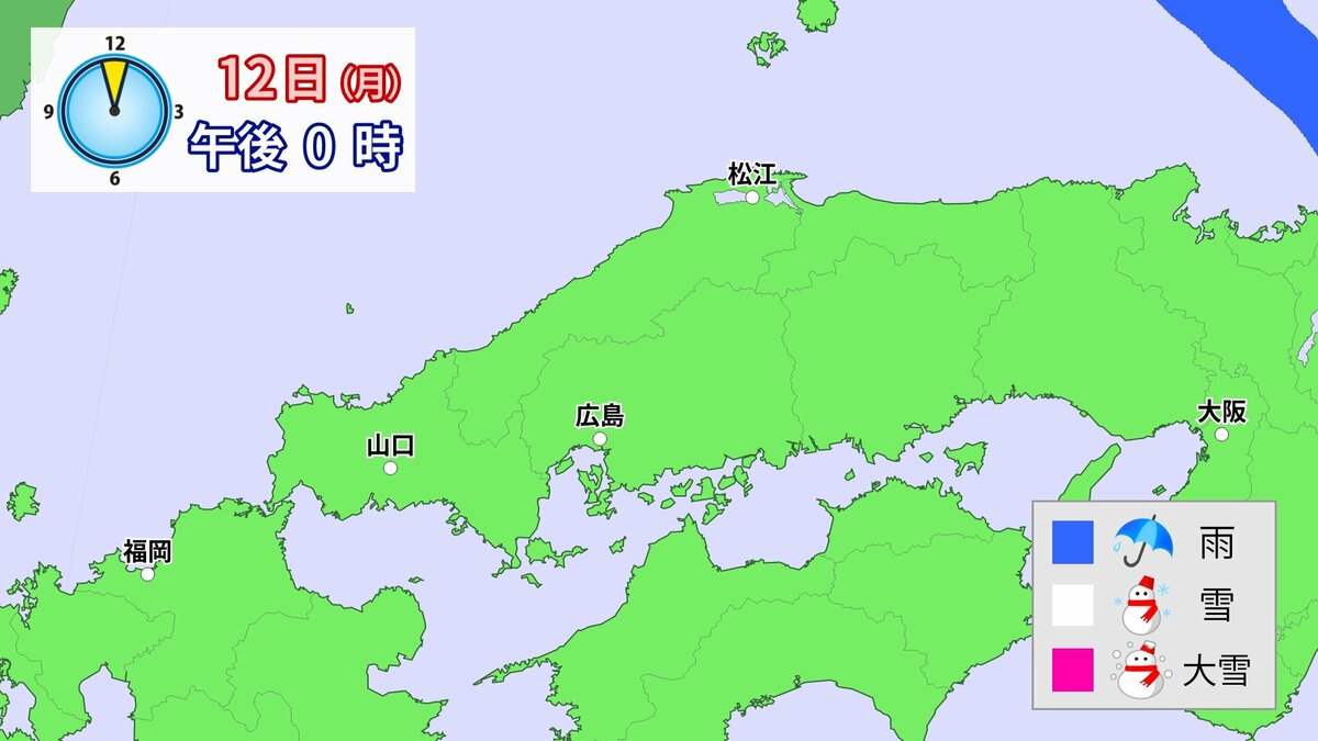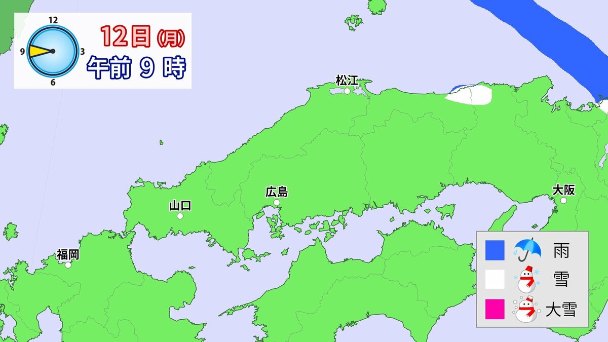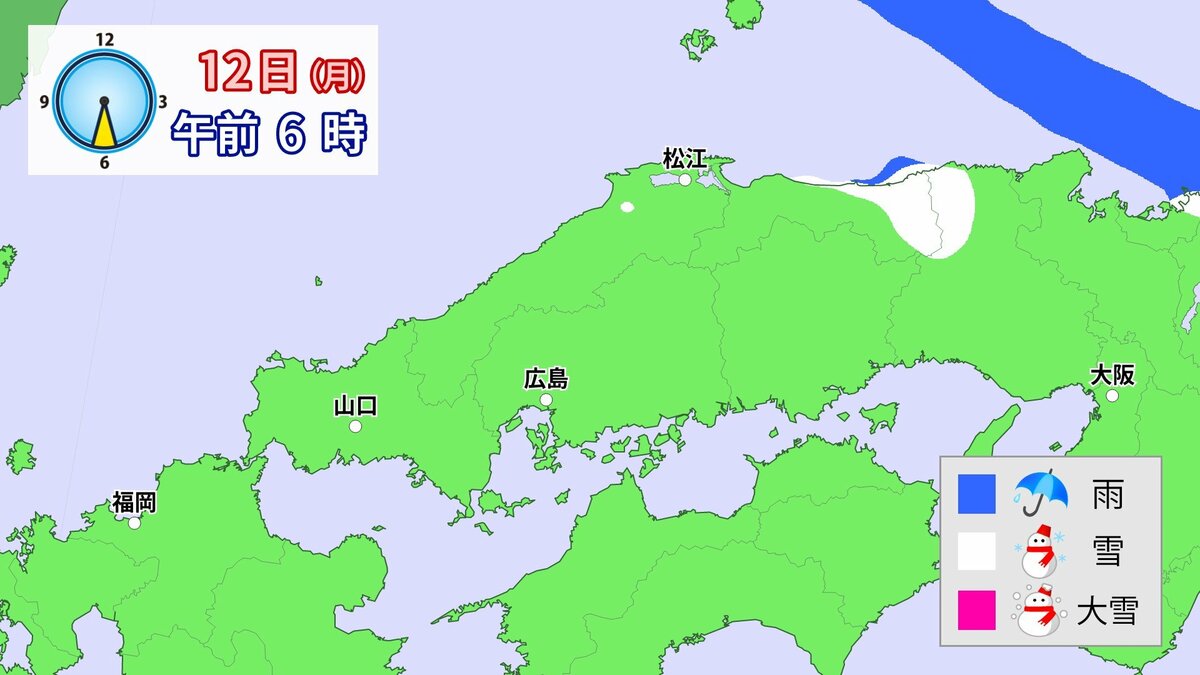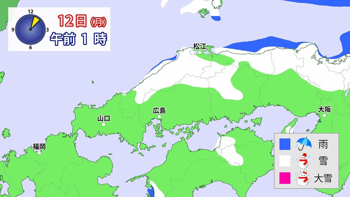 気象庁によりますと、広島県では、11日朝から12日午前中にかけて大雪となる見込みです。寒気が強いため、普段雪の少ない南部の平地でも大雪となるおそれがあります。雪雲が現在の予想以上に発達し、同じ場所で降り続いた場合は、警報級の大雪となる可能性があります。