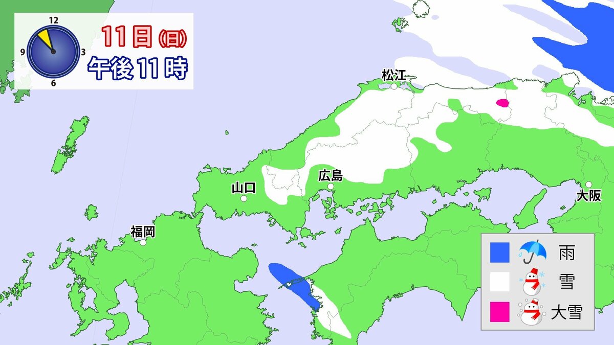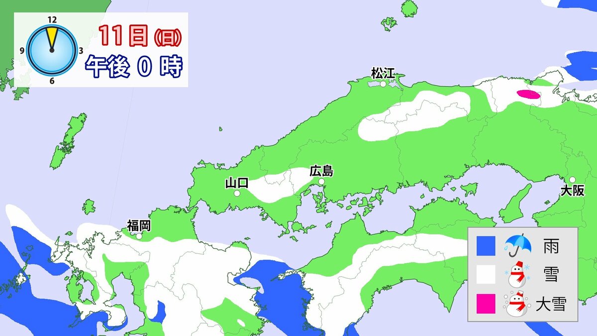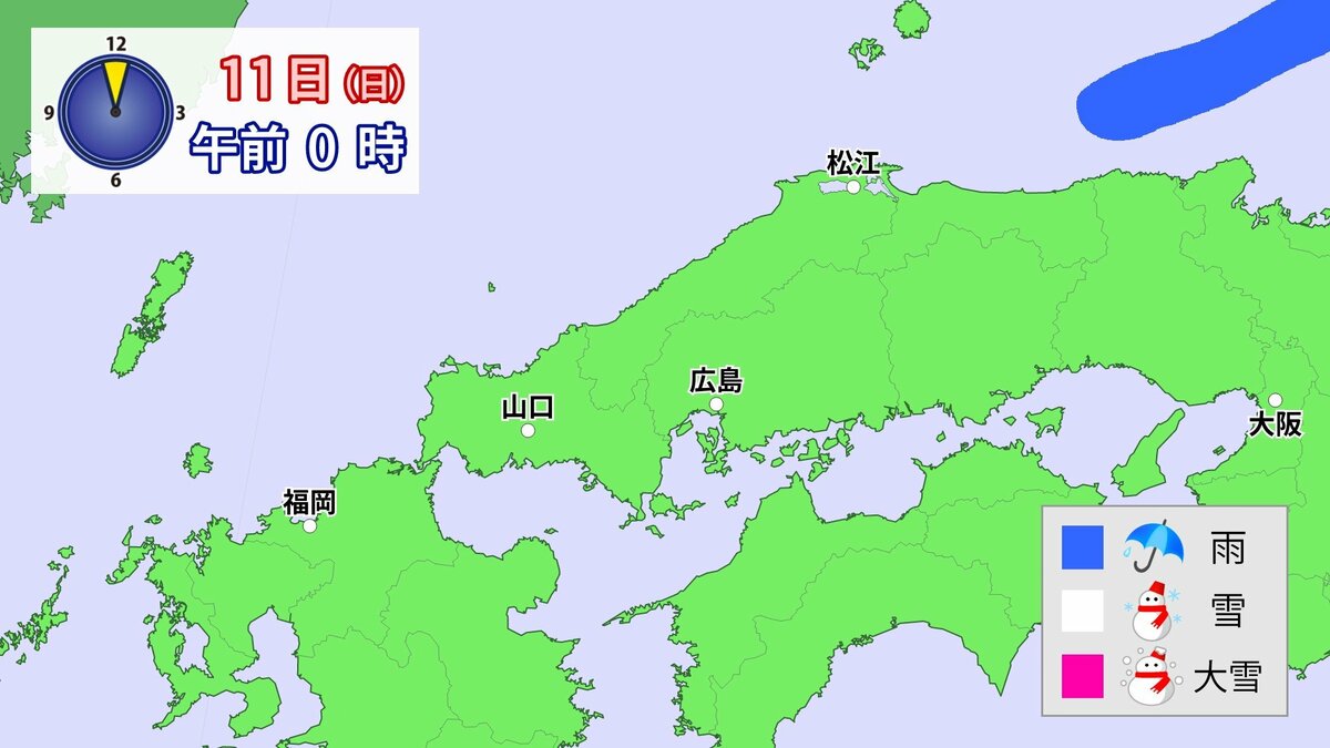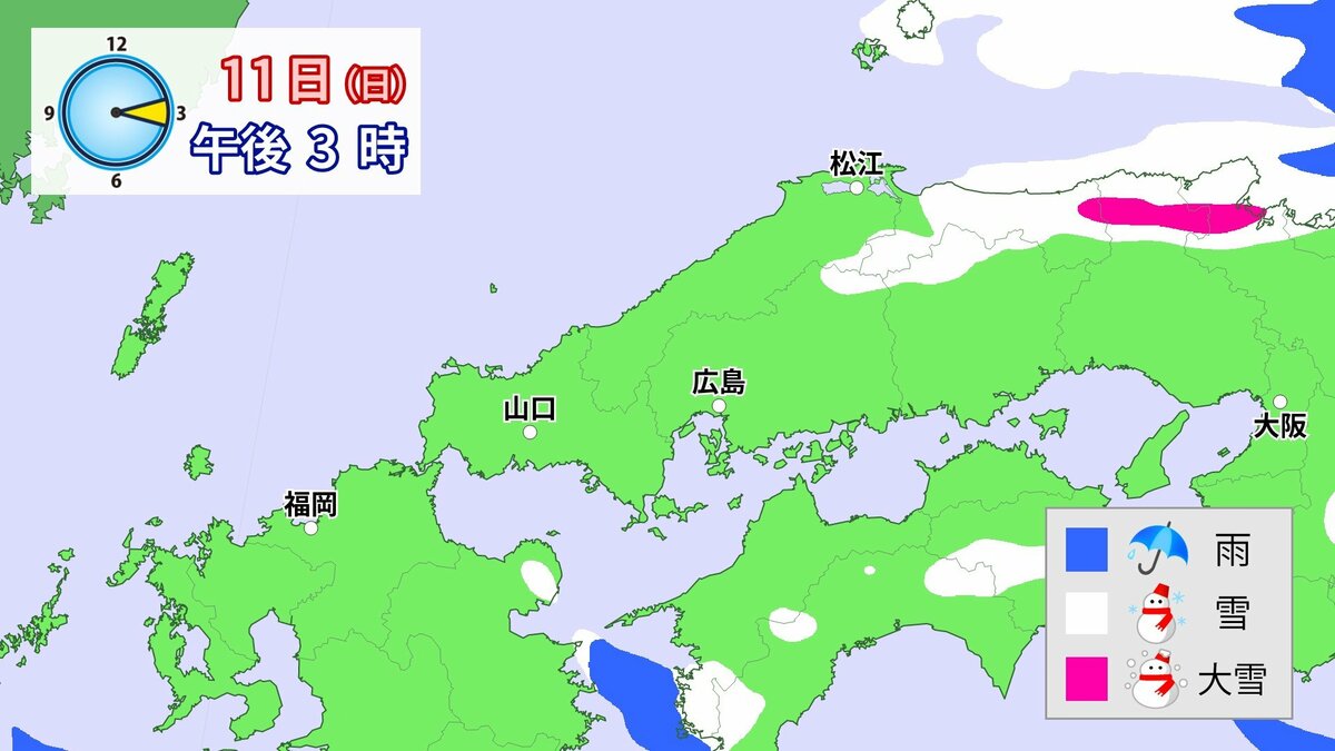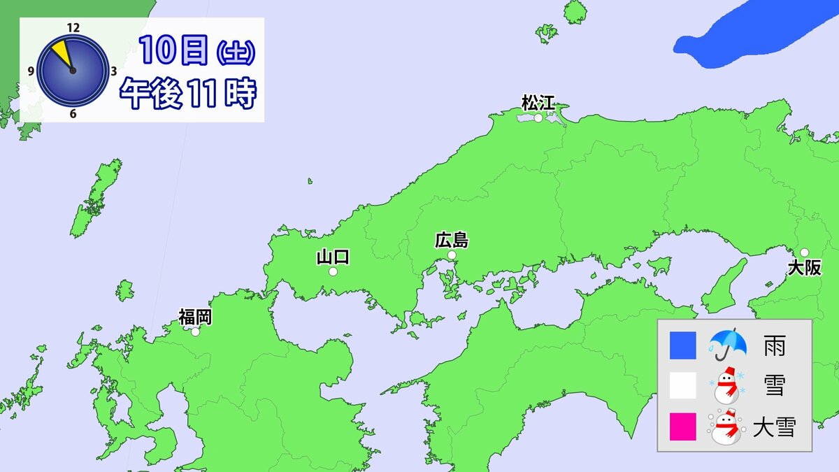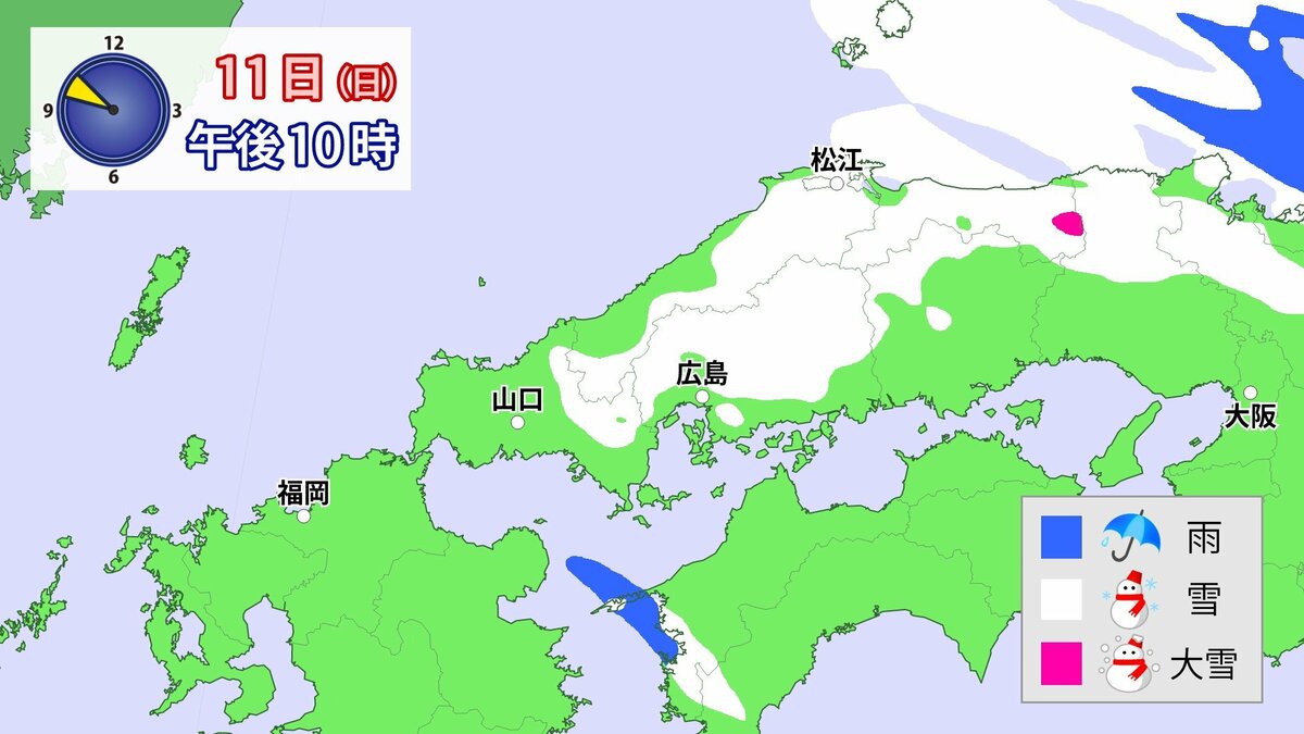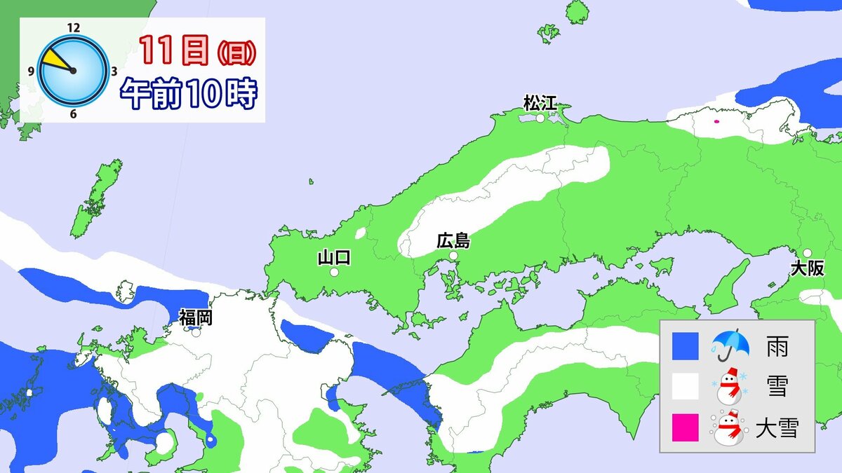 3連休初日の10日、上空の寒気はゆるみ、南寄りの風が強まったため、広島県では各地3月並の最高気温となりました。ただ、11日から12日にかけて、一気に強い寒気が入る見込みです。気象庁によりますと、広島県では、11日朝から12日午前中にかけて大雪となる見込みです。寒気が強いため、普段雪の少ない南部の平地でも大雪となるおそれがあります。雪雲が現在の予想以上に発達し、同じ場所で降り続いた場合は、警報級の大雪となる可能性があります。