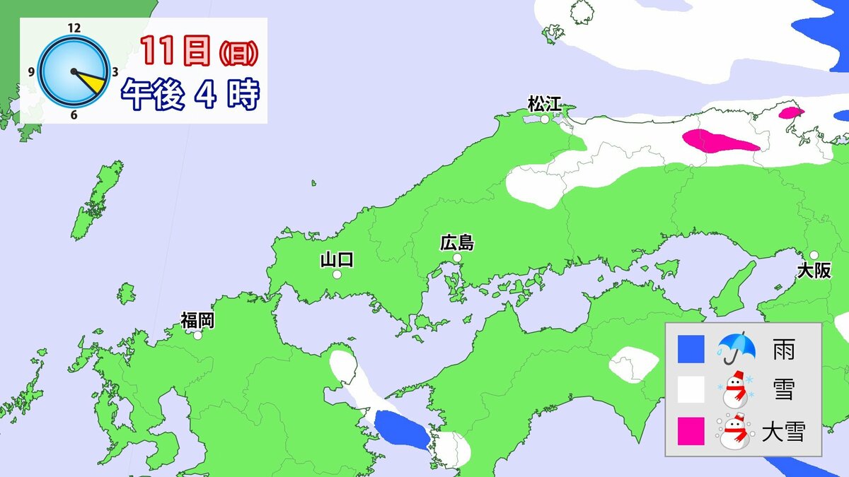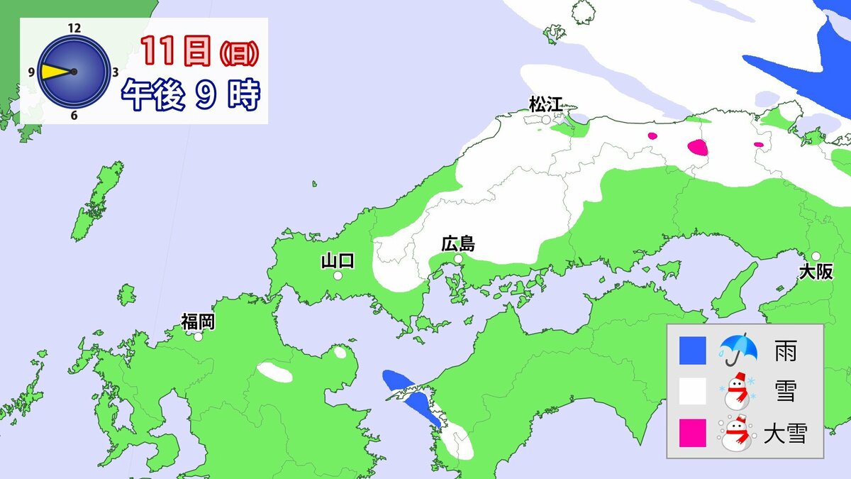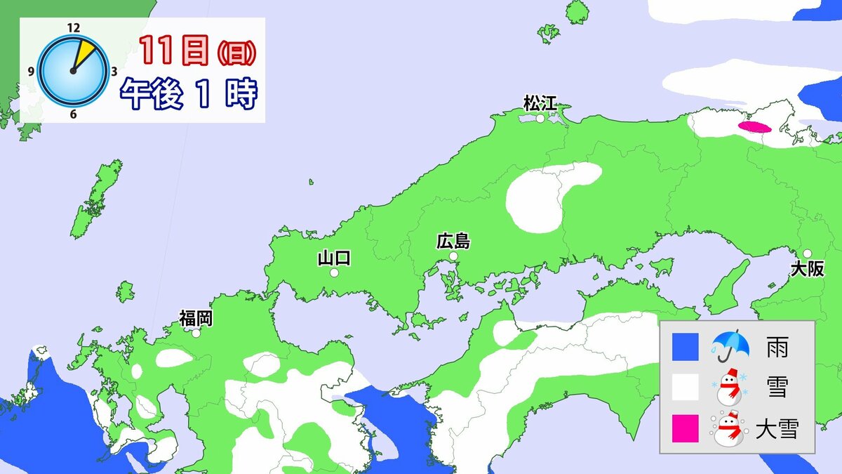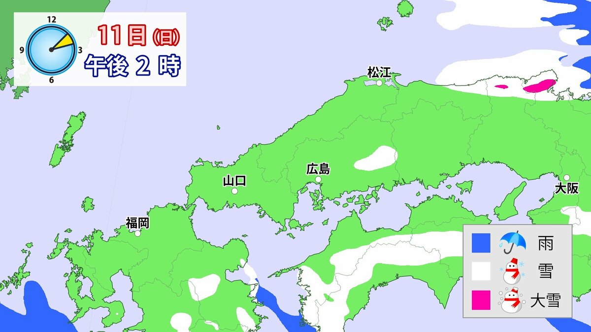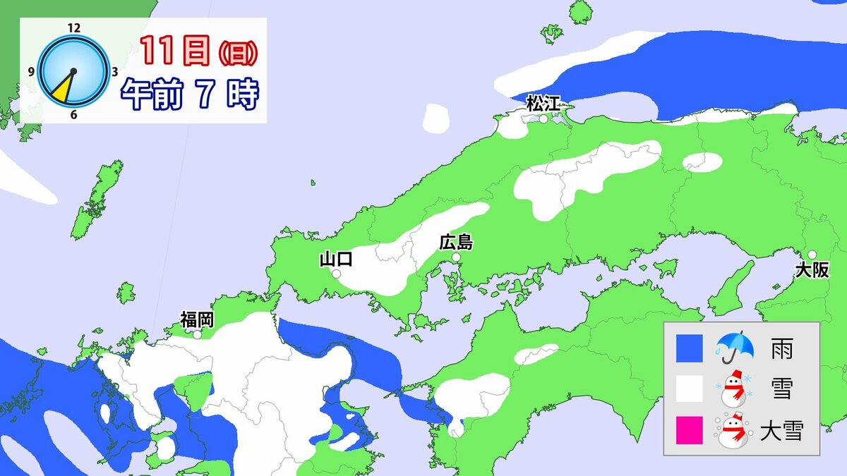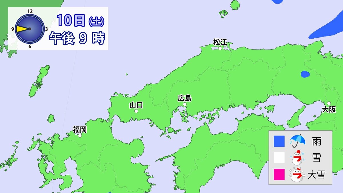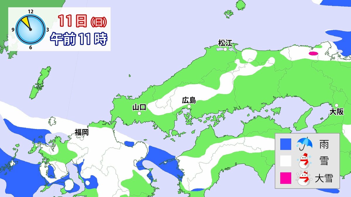 3連休初日の10日、上空の寒気はゆるみ、南寄りの風が強まったため、広島県では各地3月並の最高気温となりました。ただ、11日から12日にかけて、一気に強い寒気が入る見込みです。気象庁によりますと、広島県では、11日朝から12日午前中にかけて大雪となる見込みです。寒気が強いため、普段雪の少ない南部の平地でも大雪となるおそれがあります。雪雲が現在の予想以上に発達し、同じ場所で降り続いた場合は、警報級の大雪となる可能性があります。