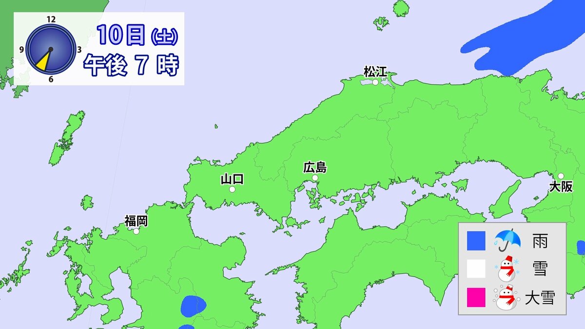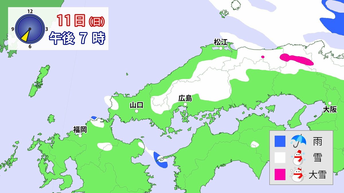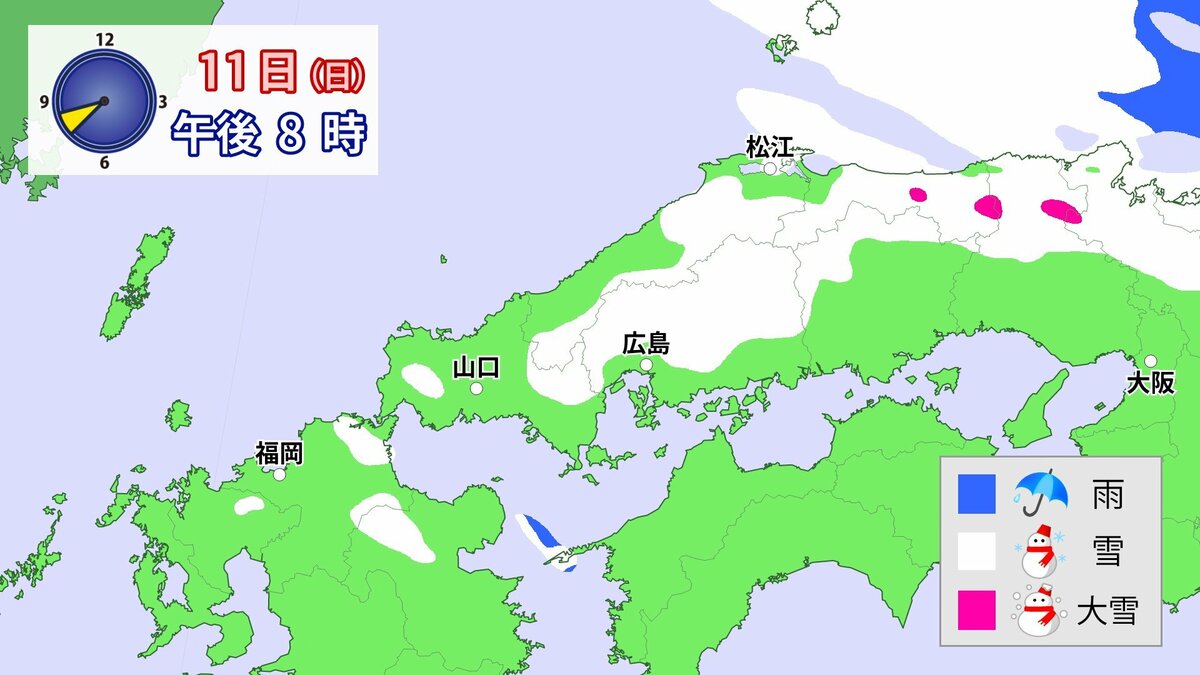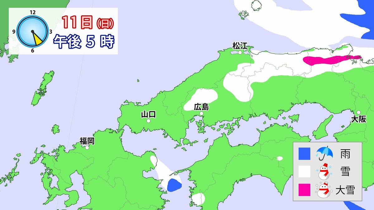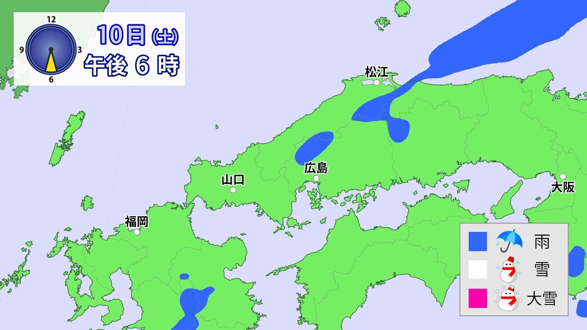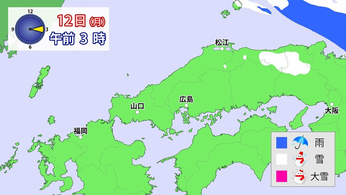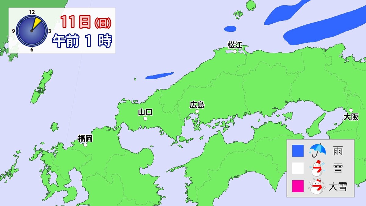 3連休初日の10日、上空の寒気はゆるみ、南寄りの風が強まったため、広島県では各地3月並の最高気温となりました。ただ、11日から12日にかけて、一気に強い寒気が入る見込みです。気象庁によりますと、広島県では、11日朝から12日午前中にかけて大雪となる見込みです。寒気が強いため、普段雪の少ない南部の平地でも大雪となるおそれがあります。雪雲が現在の予想以上に発達し、同じ場所で降り続いた場合は、警報級の大雪となる可能性があります。