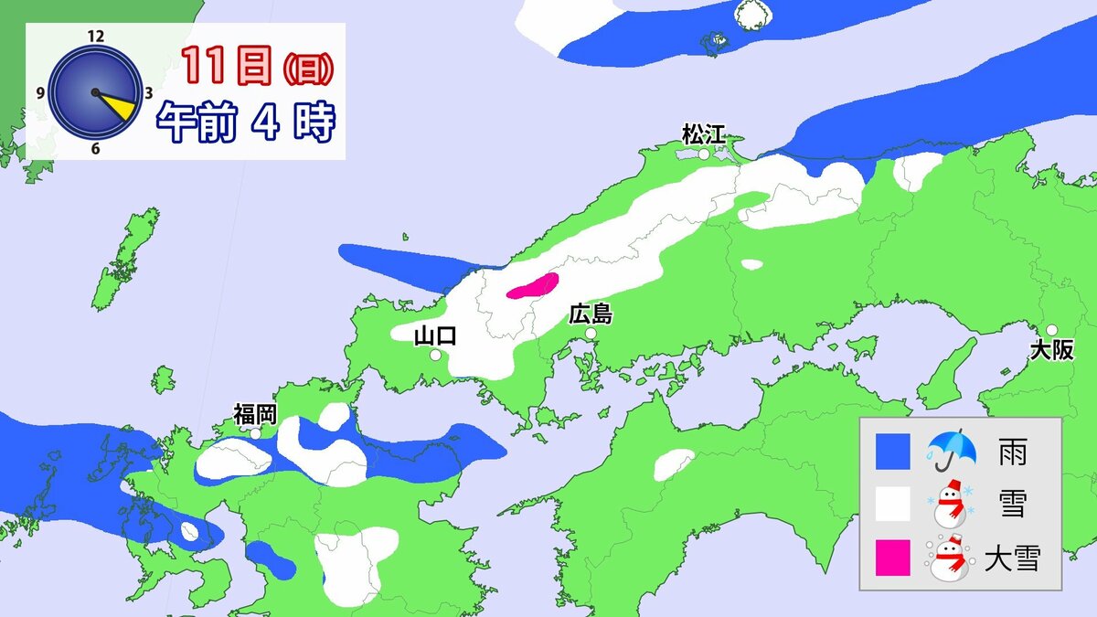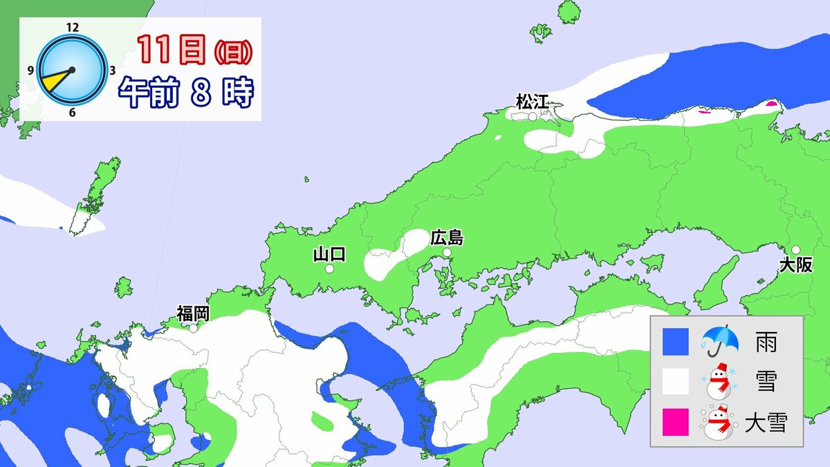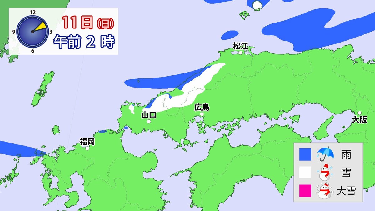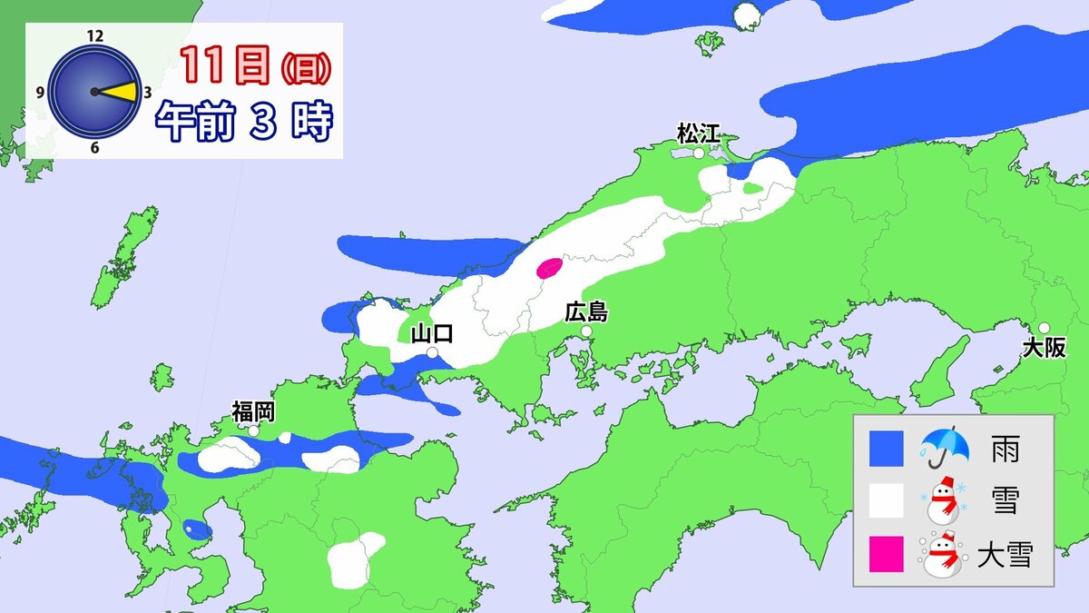 Uターンラッシュがはじまった2日、雪の影響で複数の車がスタックしたことで、広島・山口県境付近の山陽自動車道では、大規模渋滞が発生しました。次の3連休も、中国地方の雪が少ない地域で降る可能性があります。11日(日)から12日(月)午前中にかけての広島県は、広い範囲で雪が降る見込みです。雪道は、必ず冬用タイヤで走行するようにしてください。