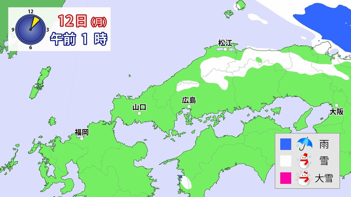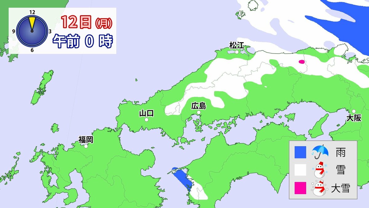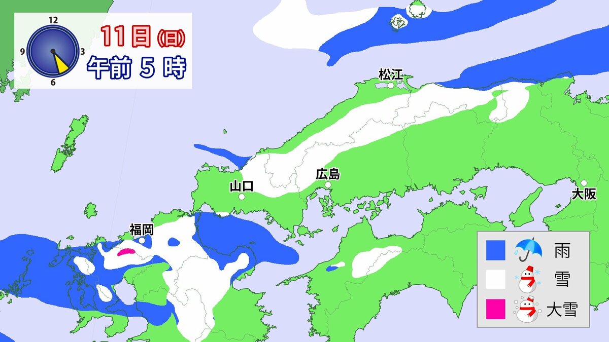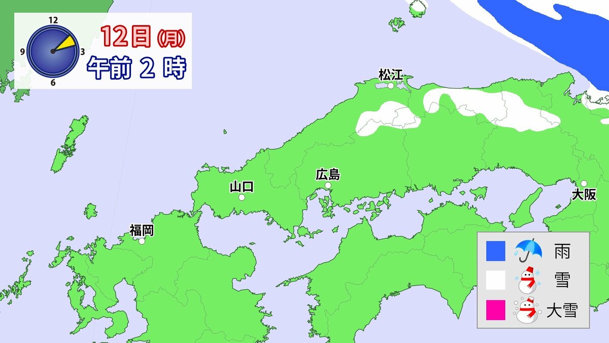 Uターンラッシュがはじまった2日、雪の影響で複数の車がスタックしたことで、広島・山口県境付近の山陽自動車道では、大規模渋滞が発生しました。次の3連休も、中国地方の雪が少ない地域で降る可能性があります。11日(日)から12日(月)午前中にかけての広島県は、広い範囲で雪が降る見込みです。雪道は、必ず冬用タイヤで走行するようにしてください。