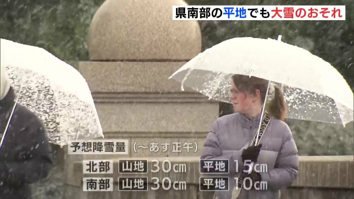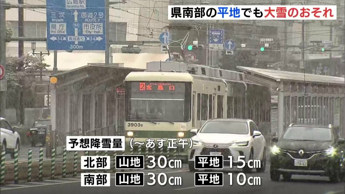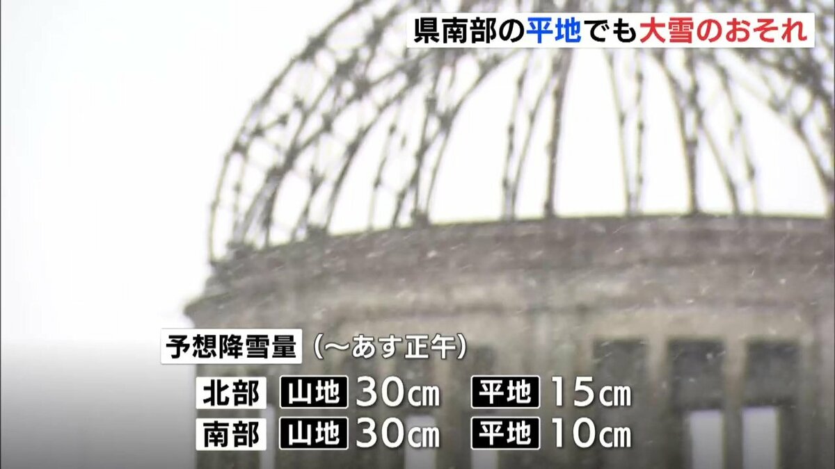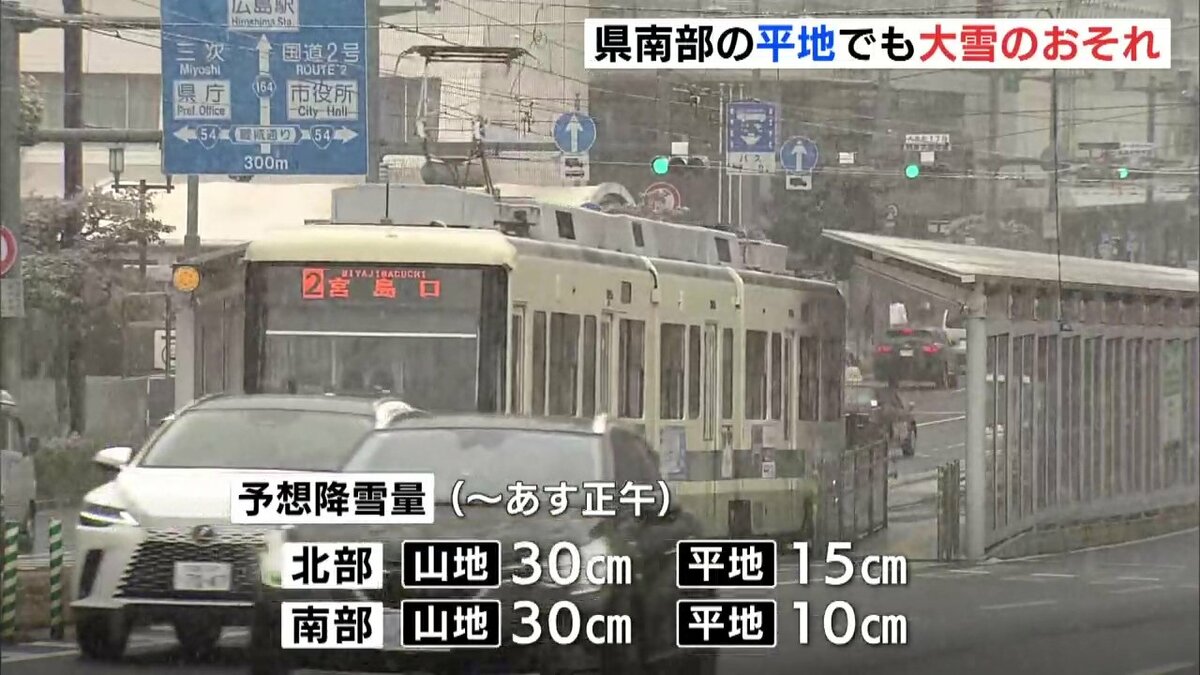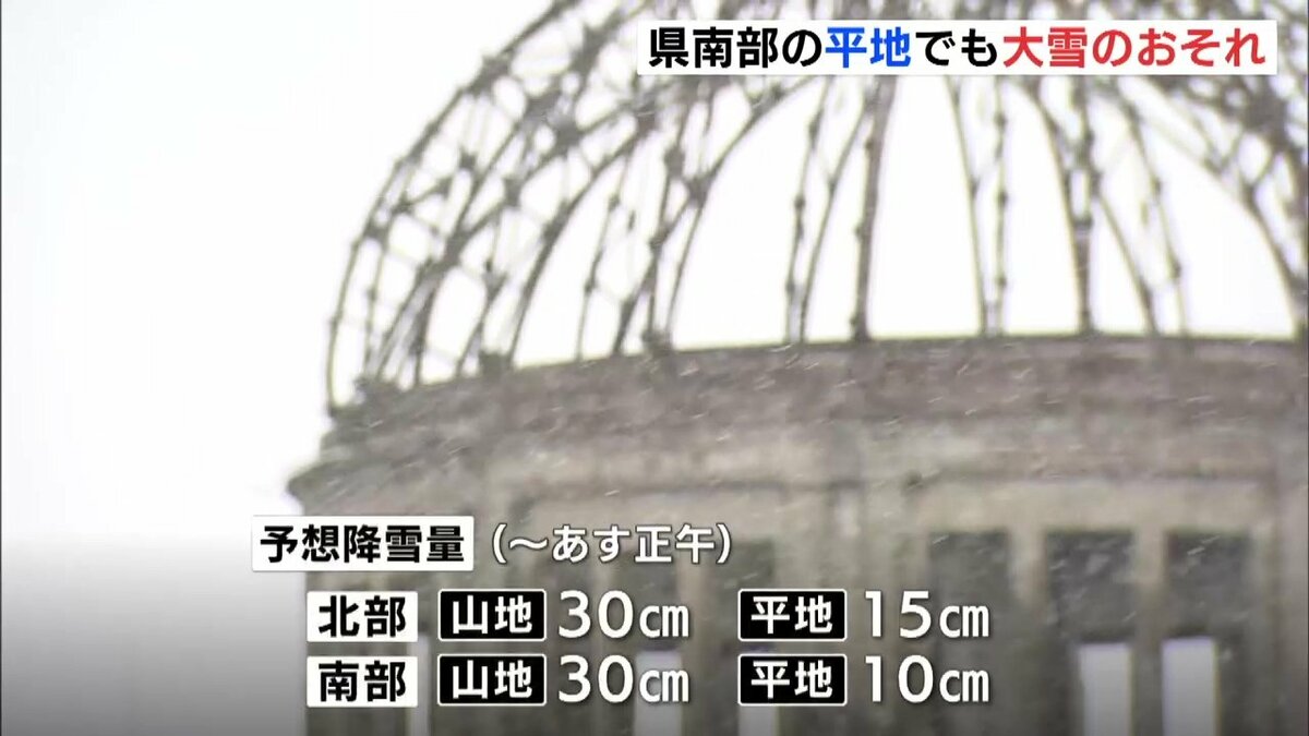 広島県内では、あすの明け方にかけて大雪となる見込みです。あす正午までの24時間に降る雪の量は、多い所で、南部・北部の山地で30センチ。